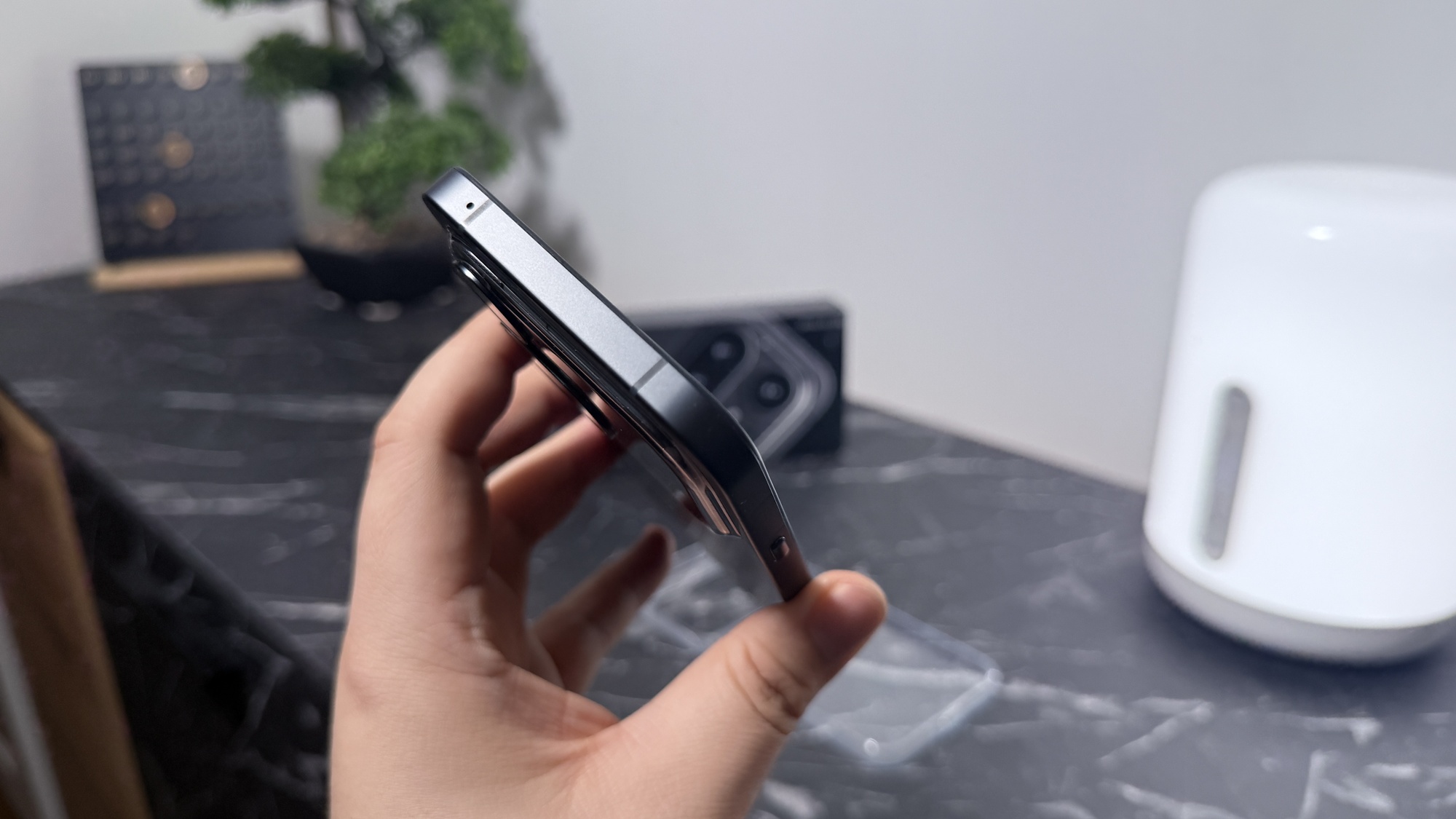 Smartphone-ul se simte tare bine folosit fără husă, dar trebuie să recunosc că e magnet de amprente și va trebui șters periodic. Avem spate și muchii drepte, colțuri rotunjite, orificiu pentru camera selfie central. Lateral apar butoane de volum, cel power on / off, dar și Essential Key, un buton extra al cărui rol principal ar fi accesarea Essential Space. Display-ul e generos, 6.82 inch, iar muchiile sunt înguste și plăcute, contribuie la o experiență imersivă.