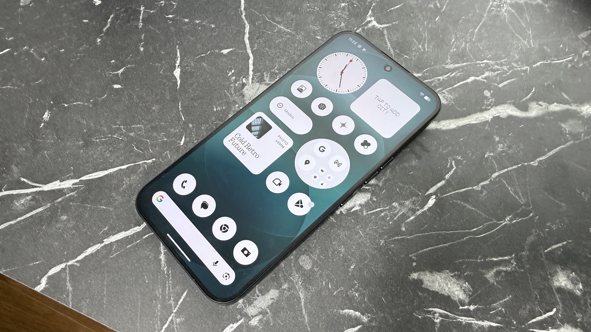 Există și câteva preset-uri în stil „AOD”, dar pe spate, precum afișarea orei permanent sau la atingere. Nu e o zonă complet tactilă, doar va „știi” atunci când vrem să afișeze informații. Prezintă și timere, progresul Uber-ului dacă comandăm în aplicație, iar pentru comunitate există Playground, acolo unde descoperim tool-uri custom create de fanii Nothing, ce pot fi descărcate.