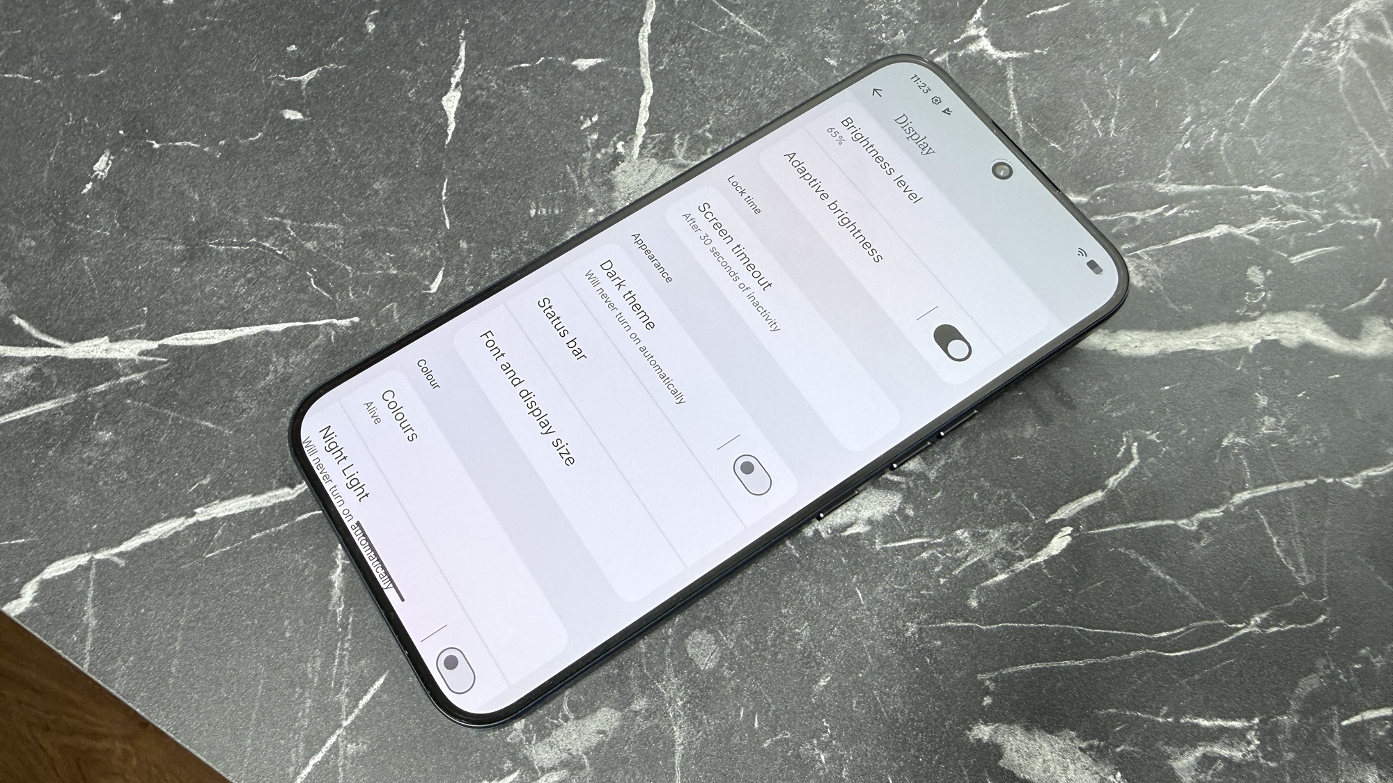 În zona de setări avem opțiuni legate de refresh rate, cu moduri precum Dynamic, High (144Hz) sau Standard la 60Hz. În setări apar si opțiuni HDR, Always-on-Display, contrast, culori, Night Light, cât și opțiune de luminozitate adaptivă. E un ecran arătos și plăcut în utilizare, similar cu al flagship-urilor actuale chiar.