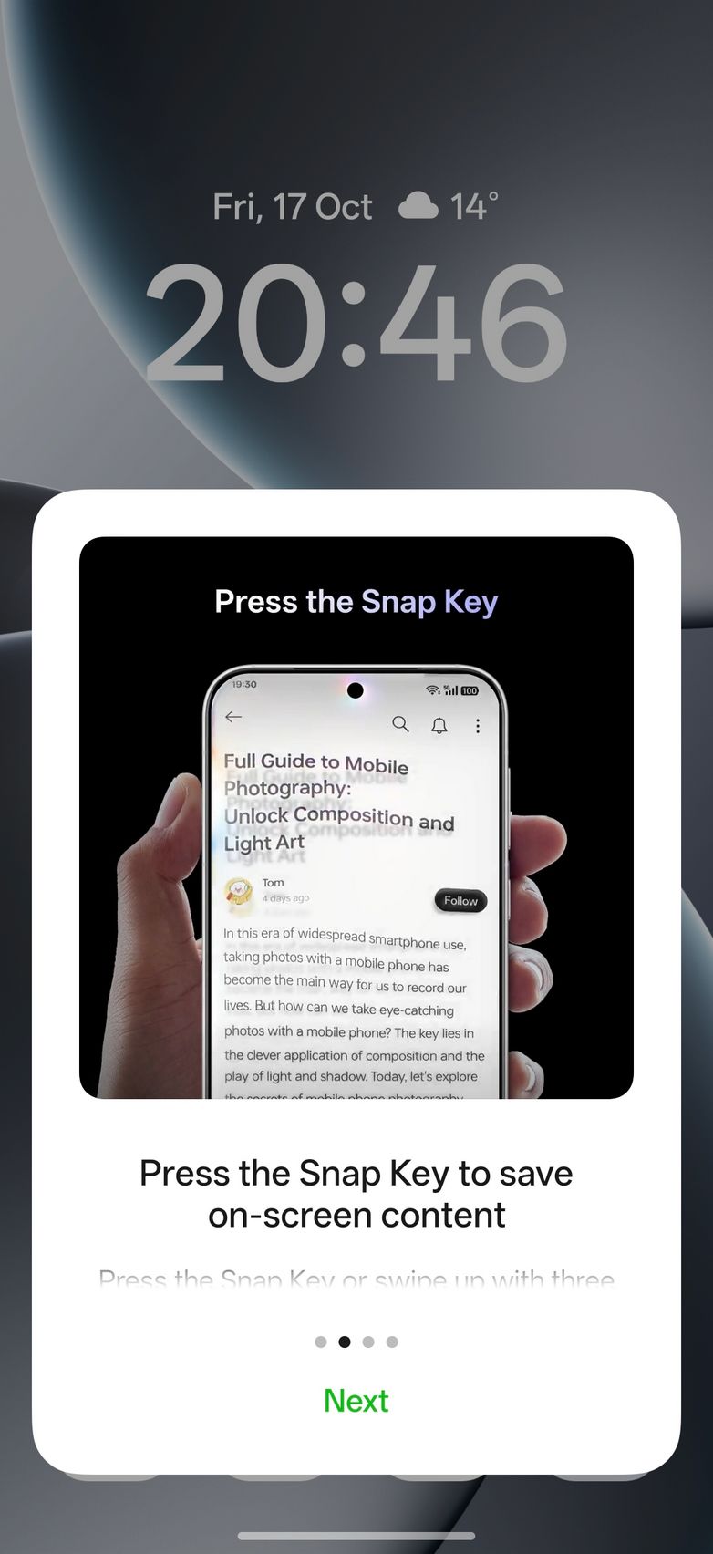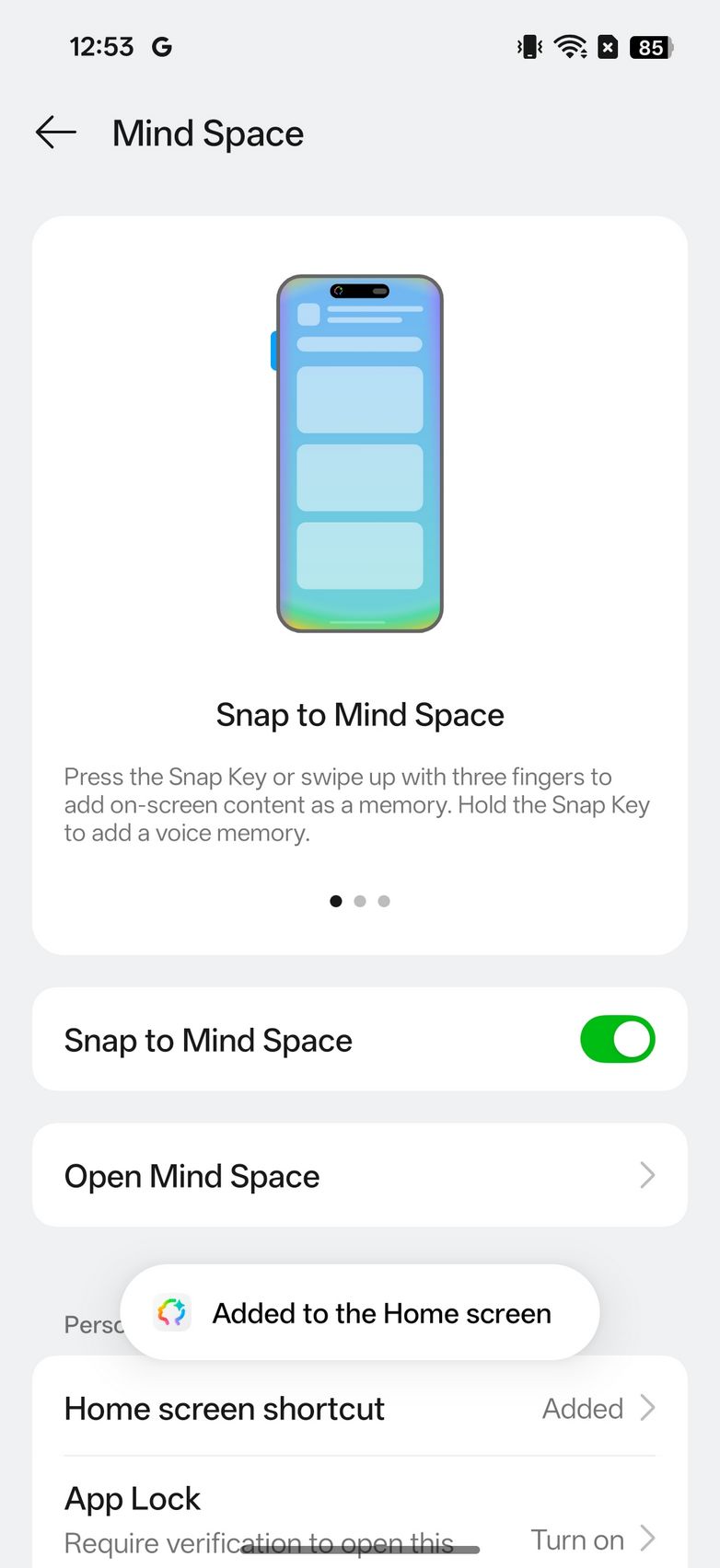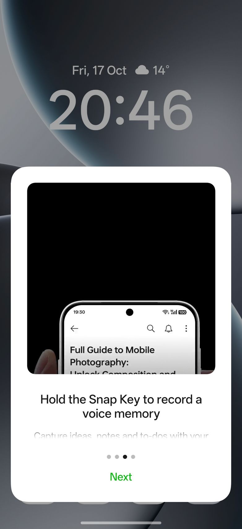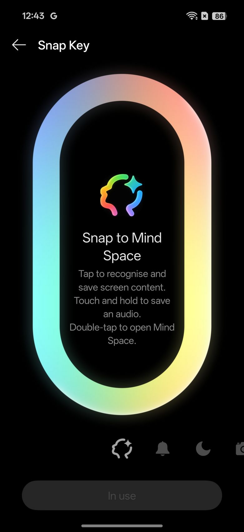 Butonul lateral îţi permite să capturezi informaţii utile, analizate şi introduse în AI Mind Space. Apeşi pe ecran scurt şi capturezi conţinutul de pe ecran, apeşi lung şi adaugi o notiţă vocală şi cu o dublă apăsare deschizi direct Mind Space. Iar tot ce ajunge acolo e "citit" de AI. Notiţa vocală e tradusă în română, pozele sunt descrise, datele unui zbor sau concert ţi se propun spre introducere în calendar.