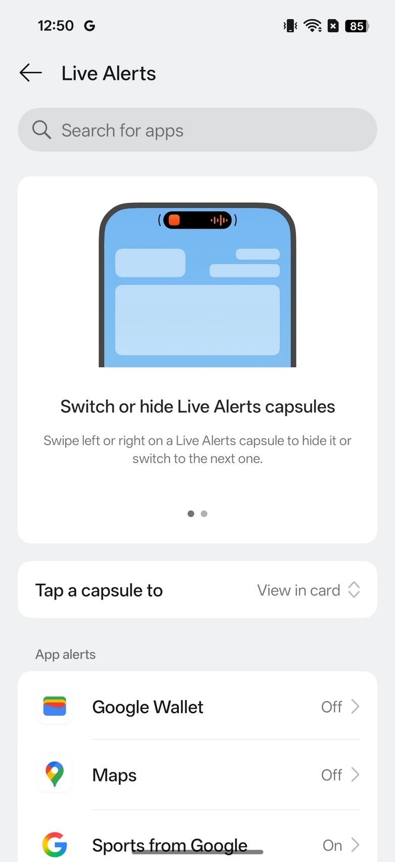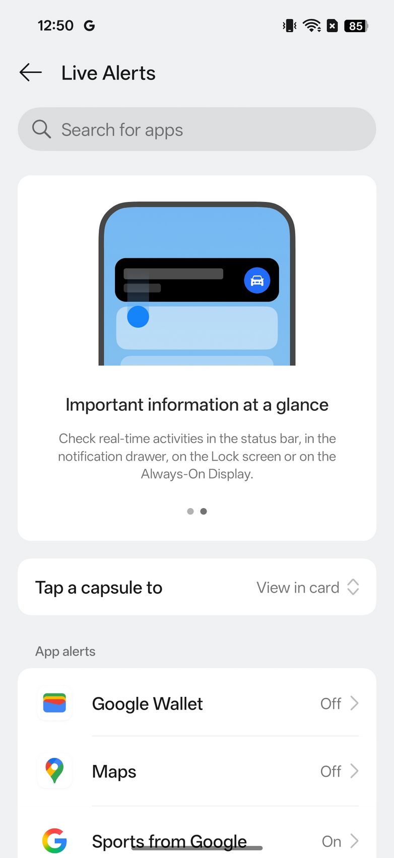 Live Alerts funcţionează cam ca Dynamic Island şi afişează în jurul decupajului camerei selfie informaţii despre Uber-ul care vine spre tine, player muzical, video şi alte aplicaţii de gen.