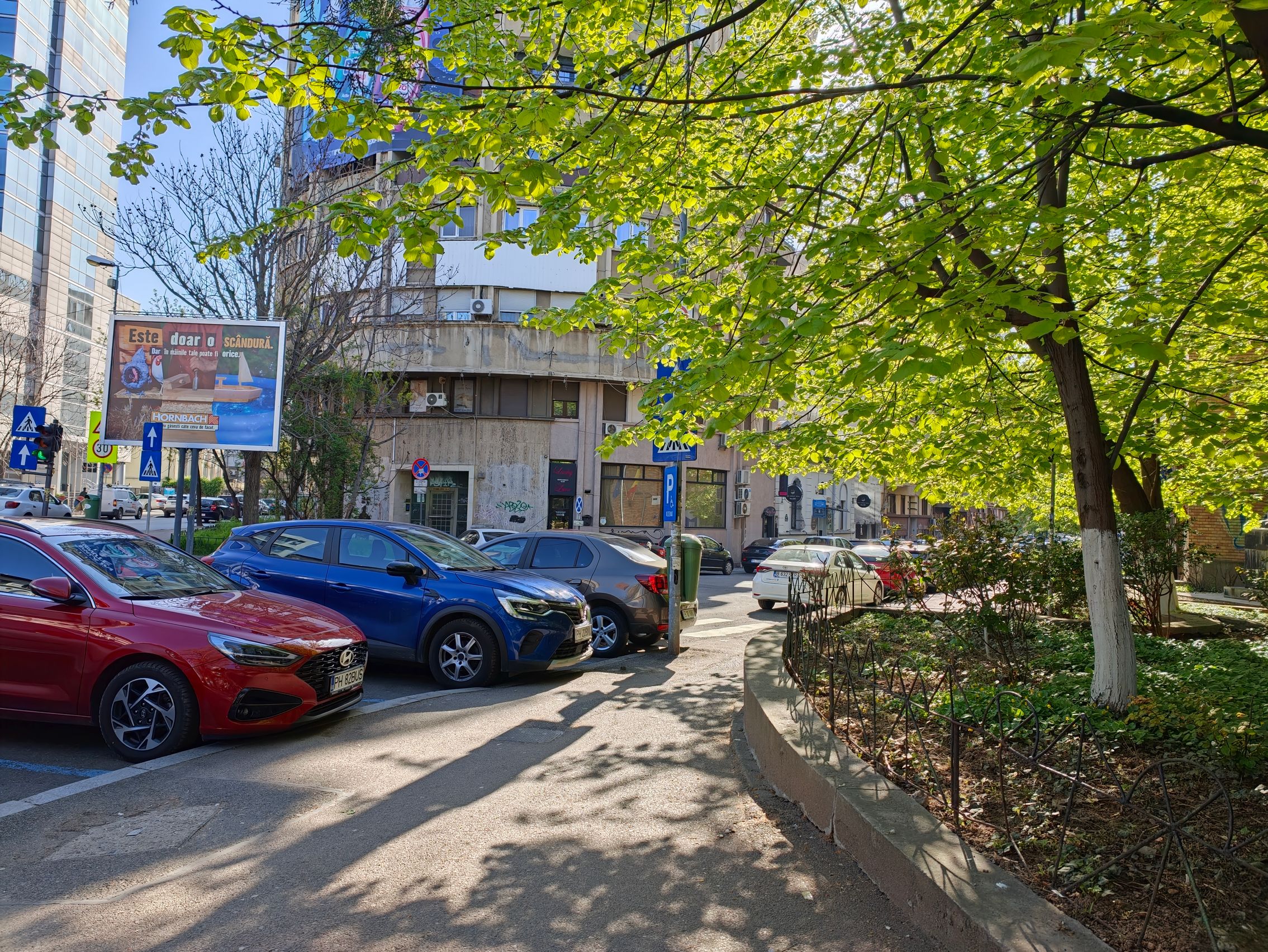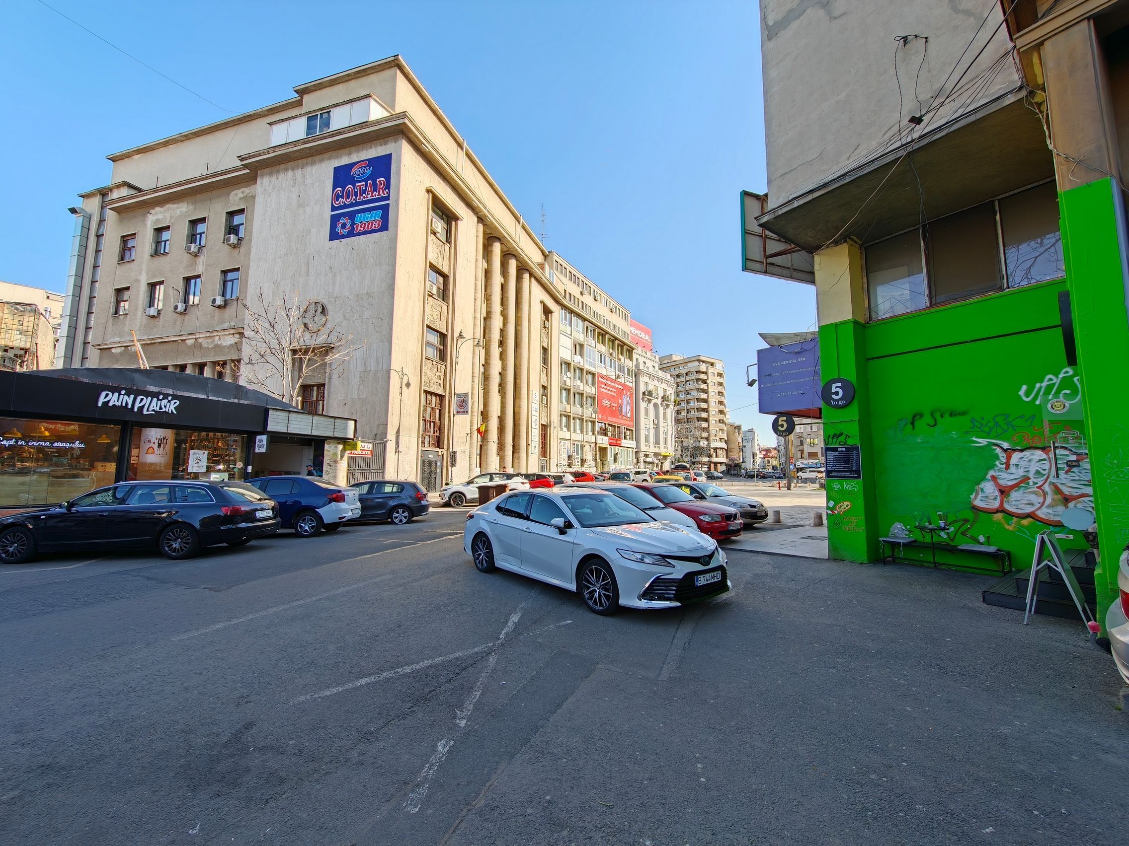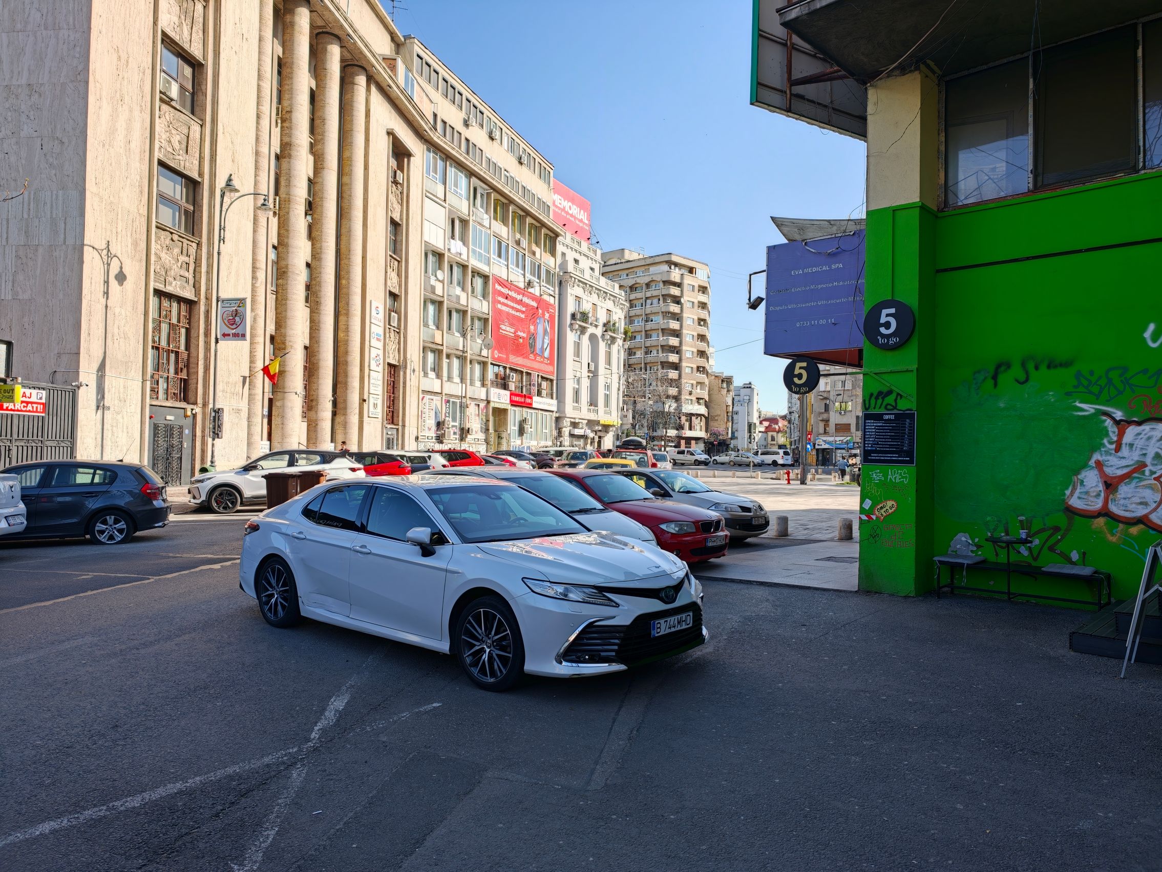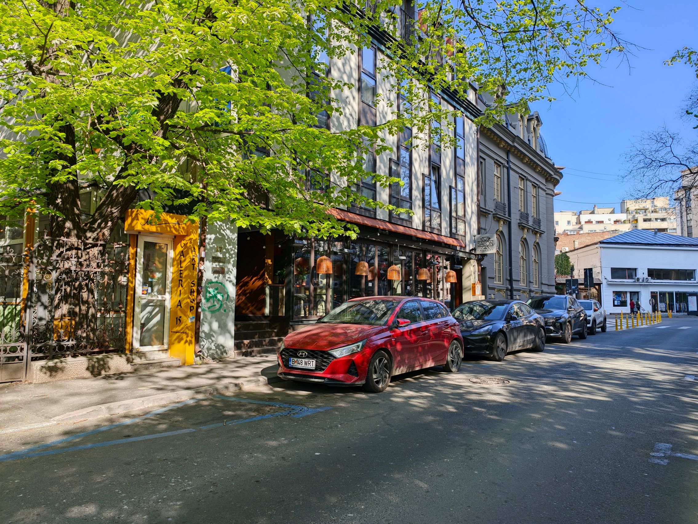 Vedem și vegetația din Cișmigiu, parcă o idee mai sus ca vibranță pe verdele de jos, dar fără exagerare. Sunt savuroase reflexiile din lac, umbrele copacilor și simt că această cameră a prins și liniștea de dimineață, cu plimbări agale prin parc și păsărele care abia se trezeau. Au fost prinse 1:1 și culorile unor grafitti de lângă parc, mai trecute prin timp și ploi. Prin zona bună de lângă hotel am văzut un Mercedes AMG colantat într-un verde care atrăgea toate privirile și la o aruncătură de băț distanță era și un Aston Martin într-un verde turcoaz ce strălucea.