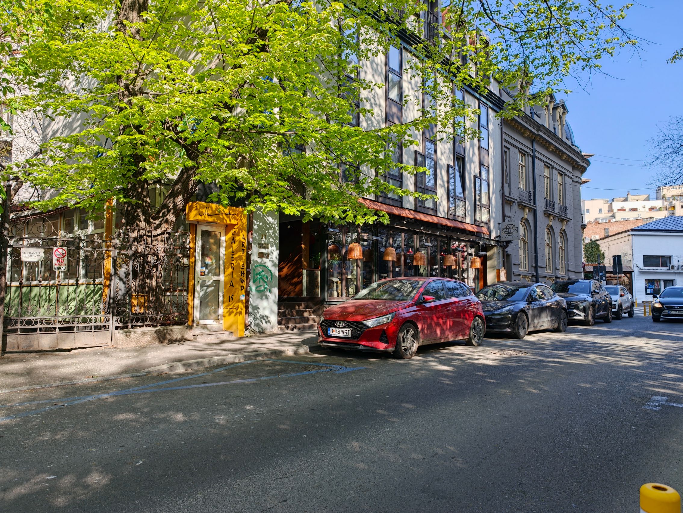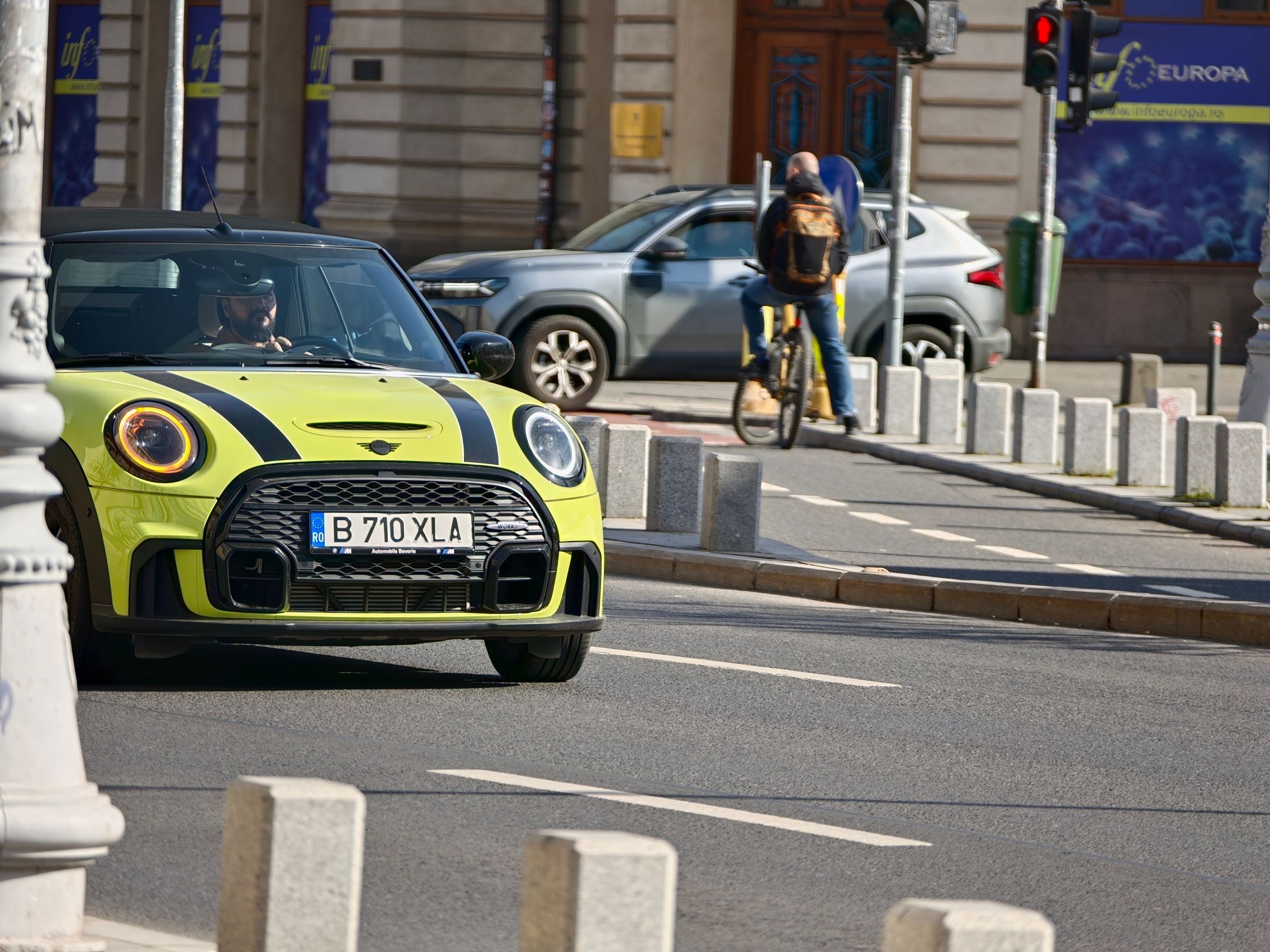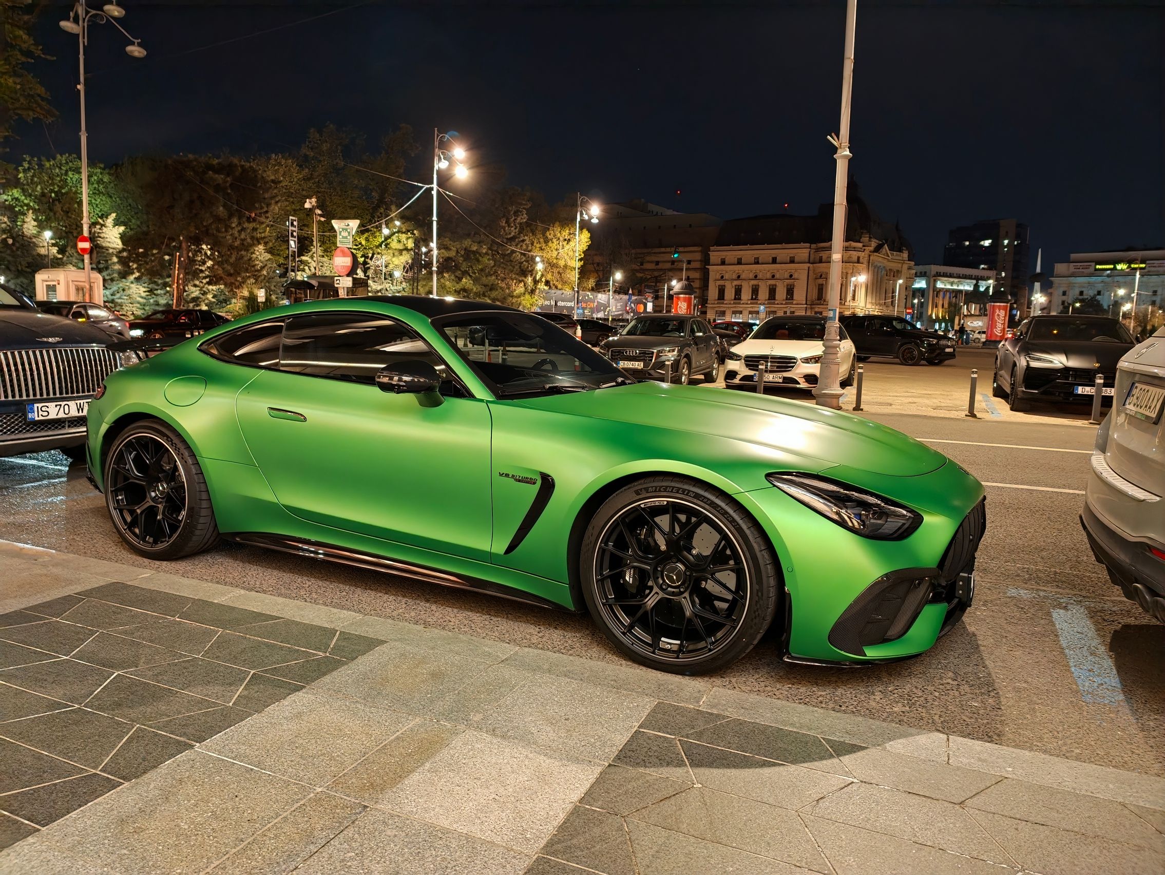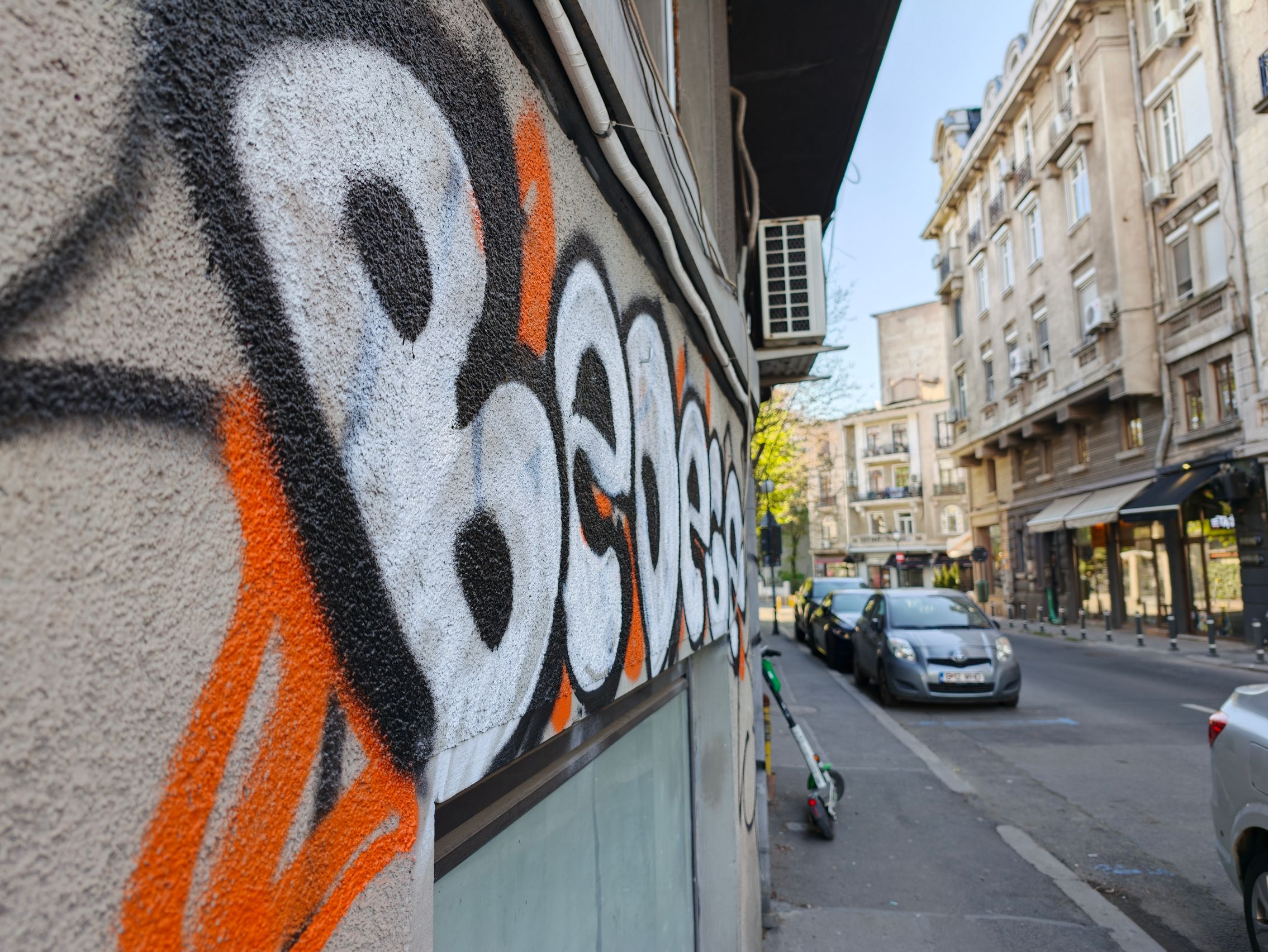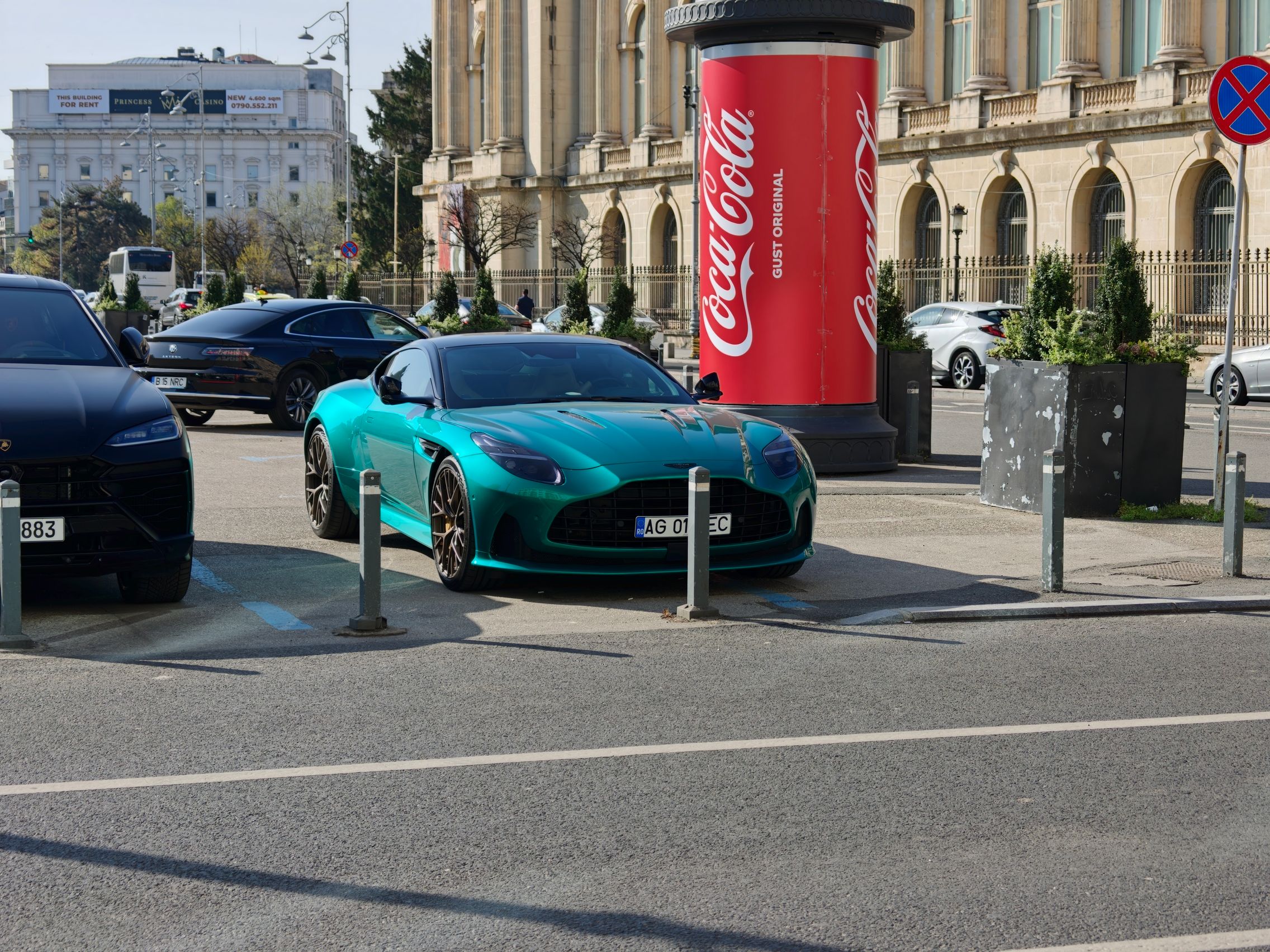 Vedem și vegetația din Cișmigiu, parcă o idee mai sus ca vibranță pe verdele de jos, dar fără exagerare. Sunt savuroase reflexiile din lac, umbrele copacilor și simt că această cameră a prins și liniștea de dimineață, cu plimbări agale prin parc și păsărele care abia se trezeau. Au fost prinse 1:1 și culorile unor grafitti de lângă parc, mai trecute prin timp și ploi. Prin zona bună de lângă hotel am văzut un Mercedes AMG colantat într-un verde care atrăgea toate privirile și la o aruncătură de băț distanță era și un Aston Martin într-un verde turcoaz ce strălucea.