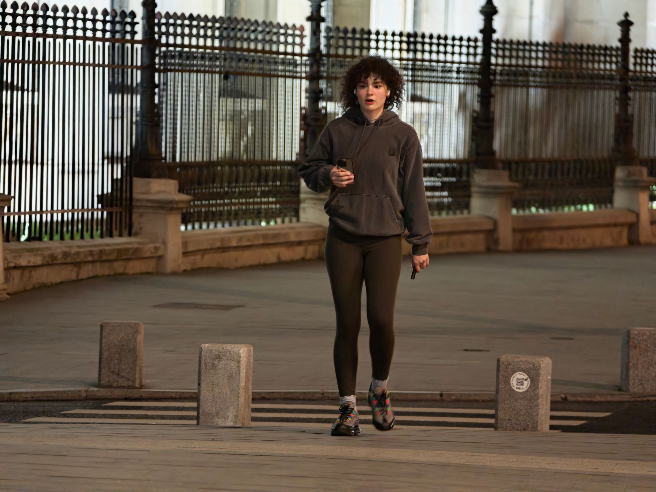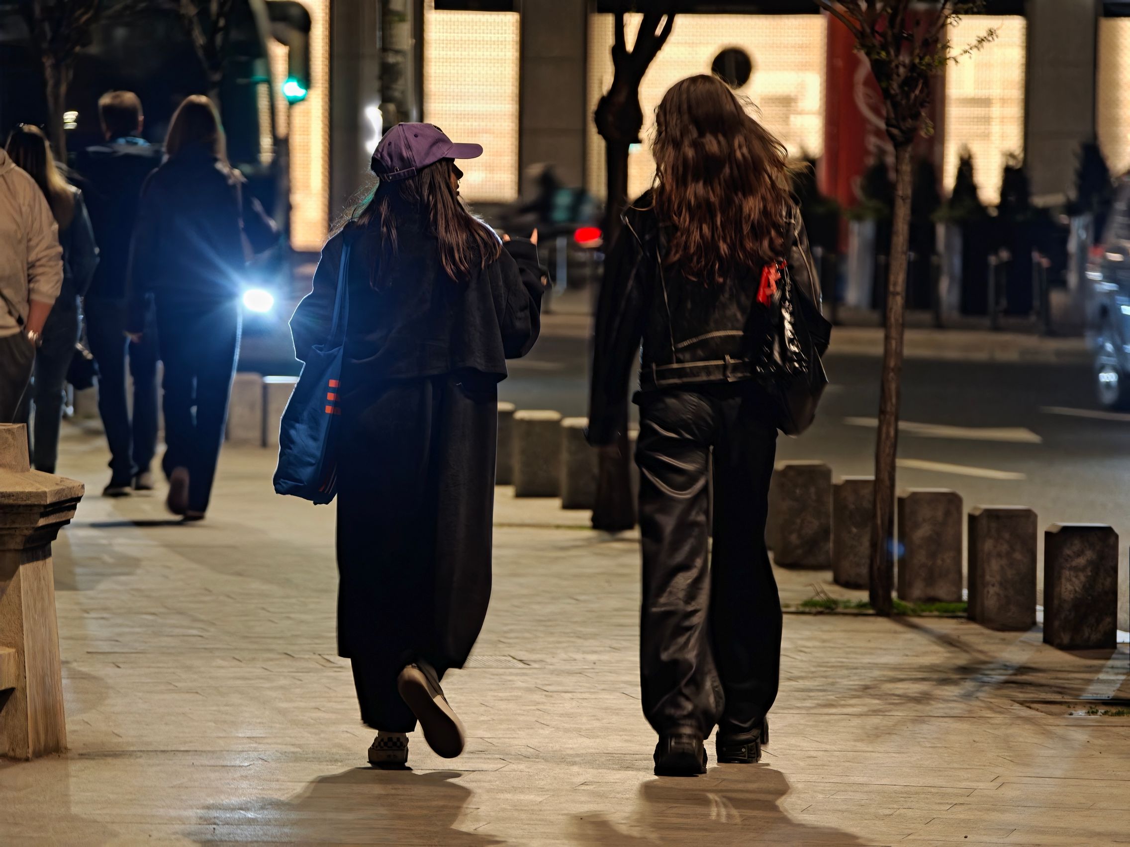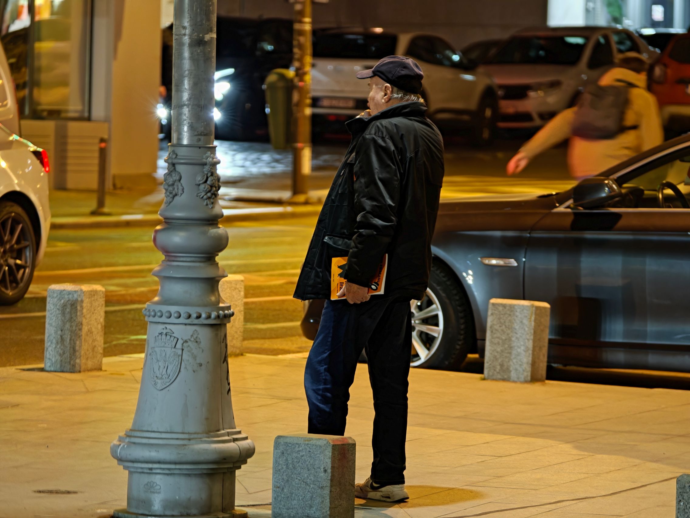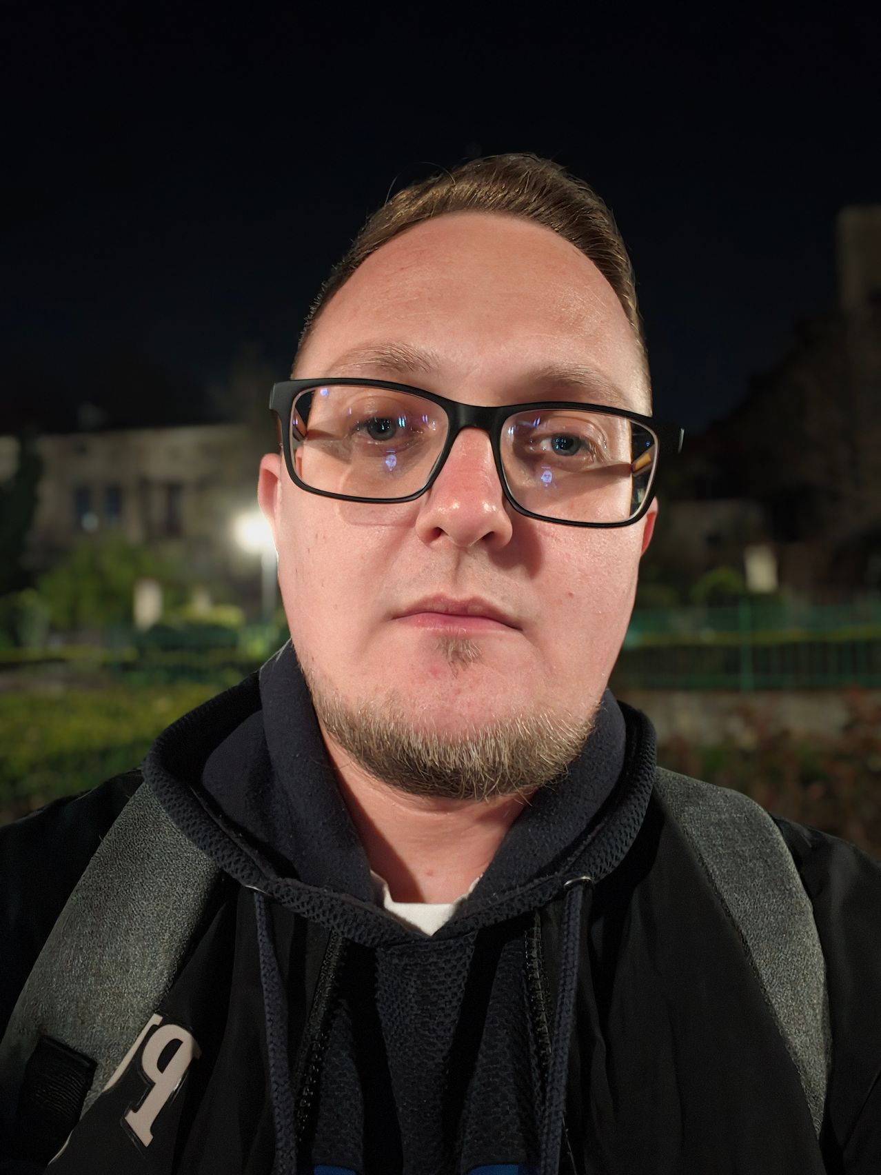 Parcă s-au mai pierdut detalii la haine și culori, dar fața a rămas în prim plan și mai apoi cu bokeh expresiile s-au accentuat, au fost scoase la iveală și culorile hanoracului și a gecii, care anterior nu se puteau distinge. Pe întiuneric dar cu lumini în jur detaliile au fost duse la nivelul următor și îmi place și mai mult ce a scos camera, mai bine decât la asfințit.