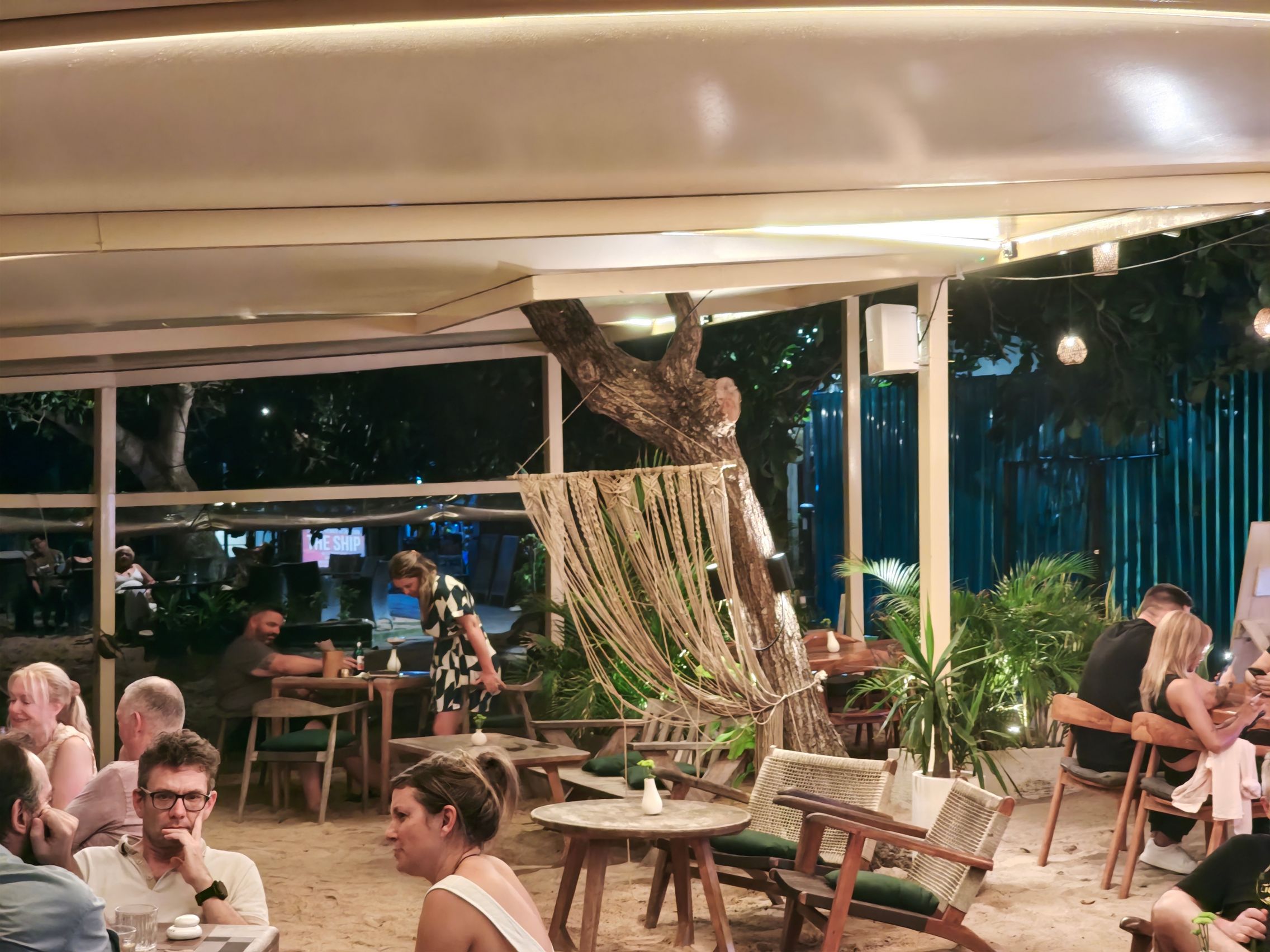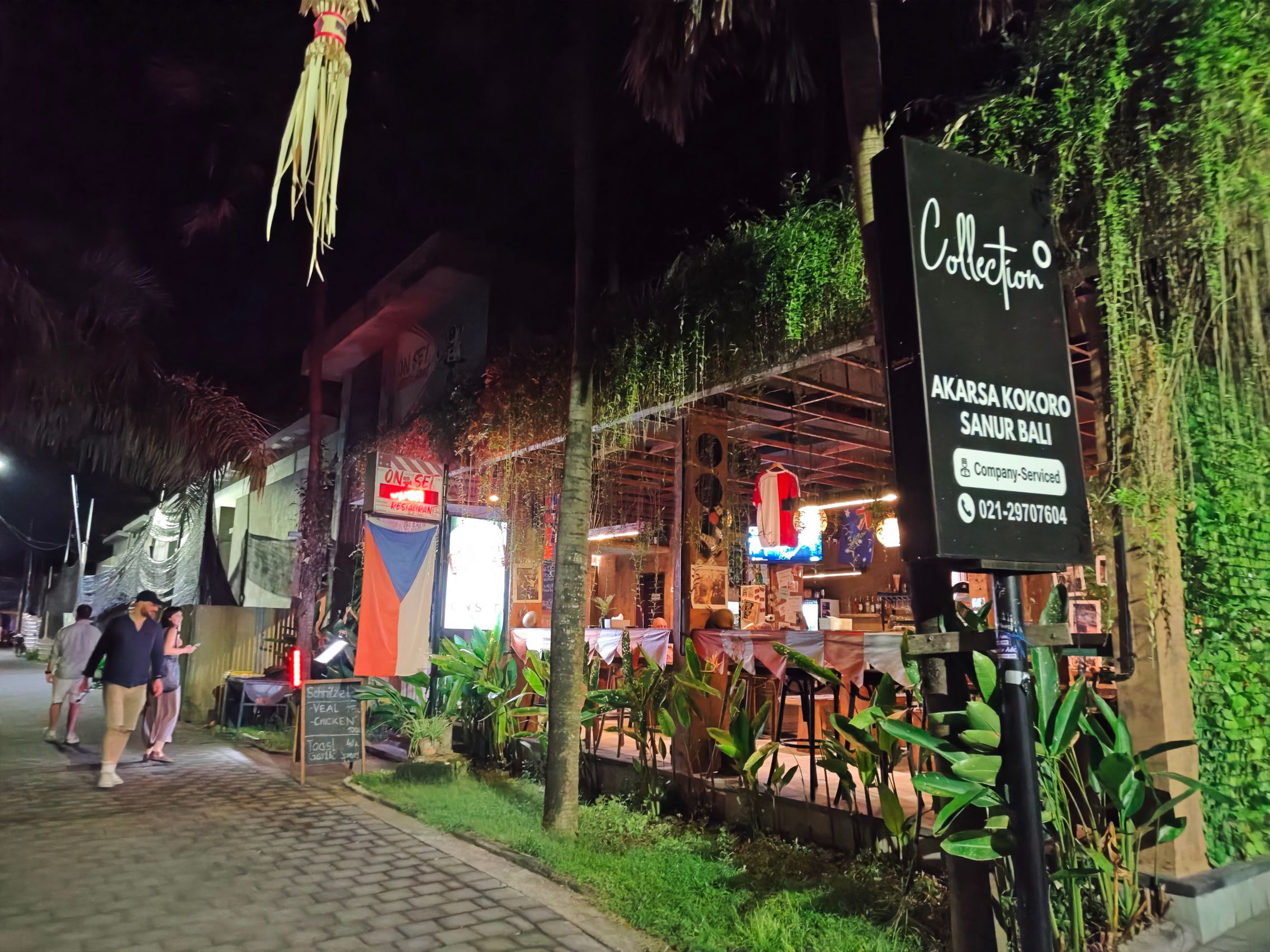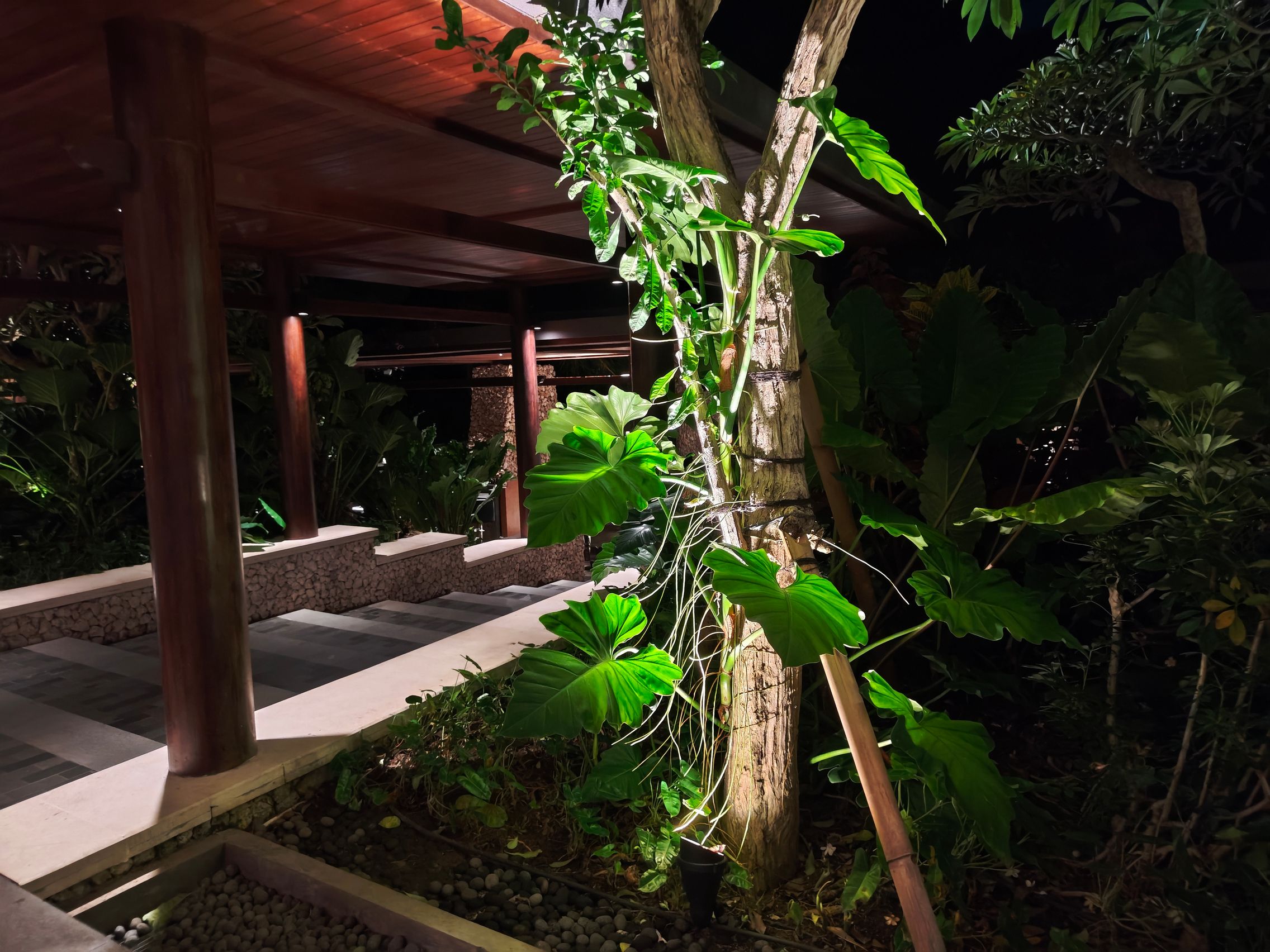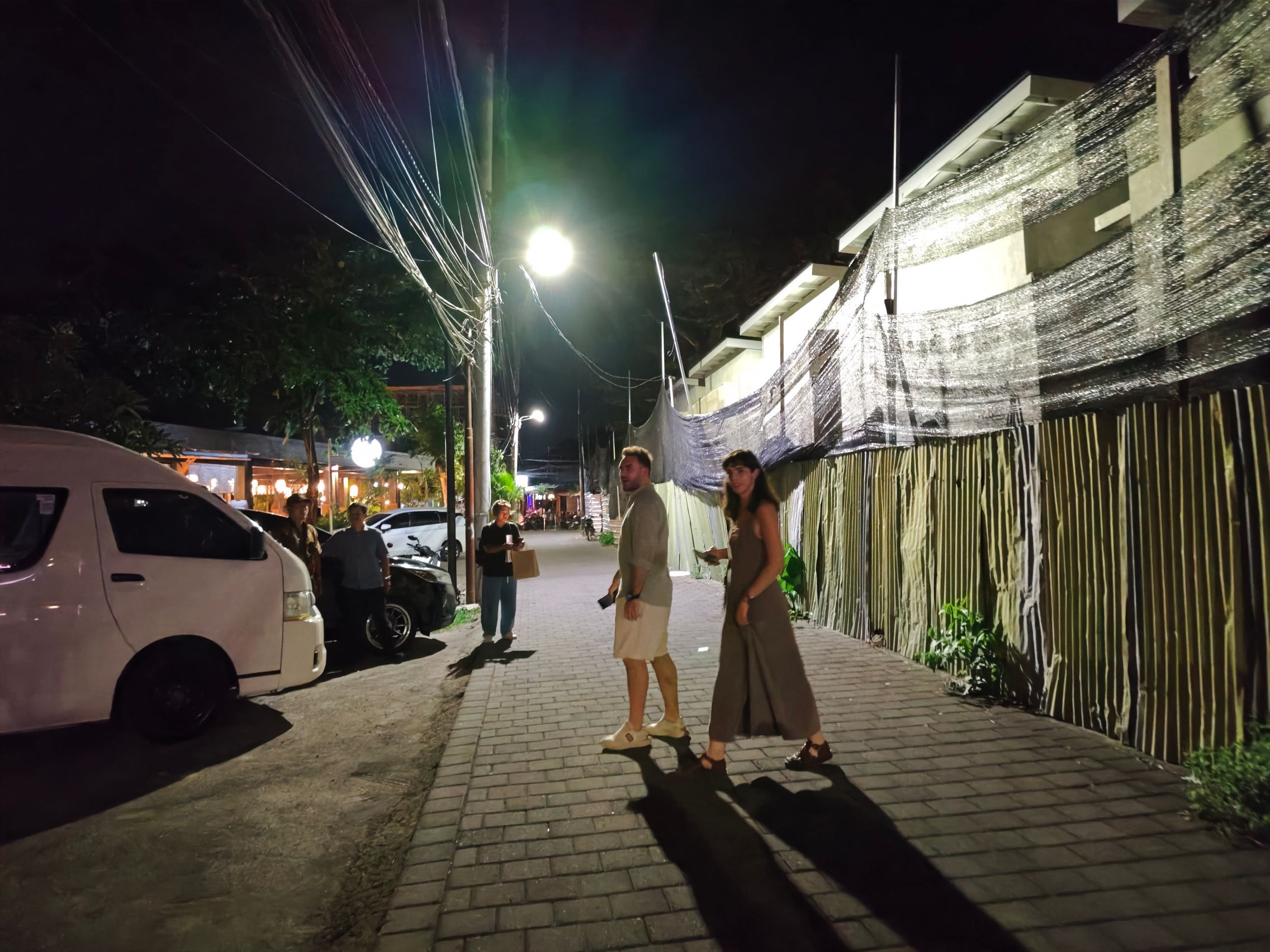 Am pornit apoi spre un mic restaurant, pe străduțele din Bali și la fel ca la iPhone apare uneori o reflexie în cadru. Stâlpul cu lumina sa măreață sus de tot creează nște raze, dar sunt mulțumit de detalii. Se simt și pașii realizați, camera având ceva probleme în a se descurca perfect pe noapte. Rămâne cu detalii și ambianța sonoră bine captată. Legat de sunet, la restaurant a avut loc un scurt moment de interpretare live iar microfoanele au făcut o treabă foarte bună.
