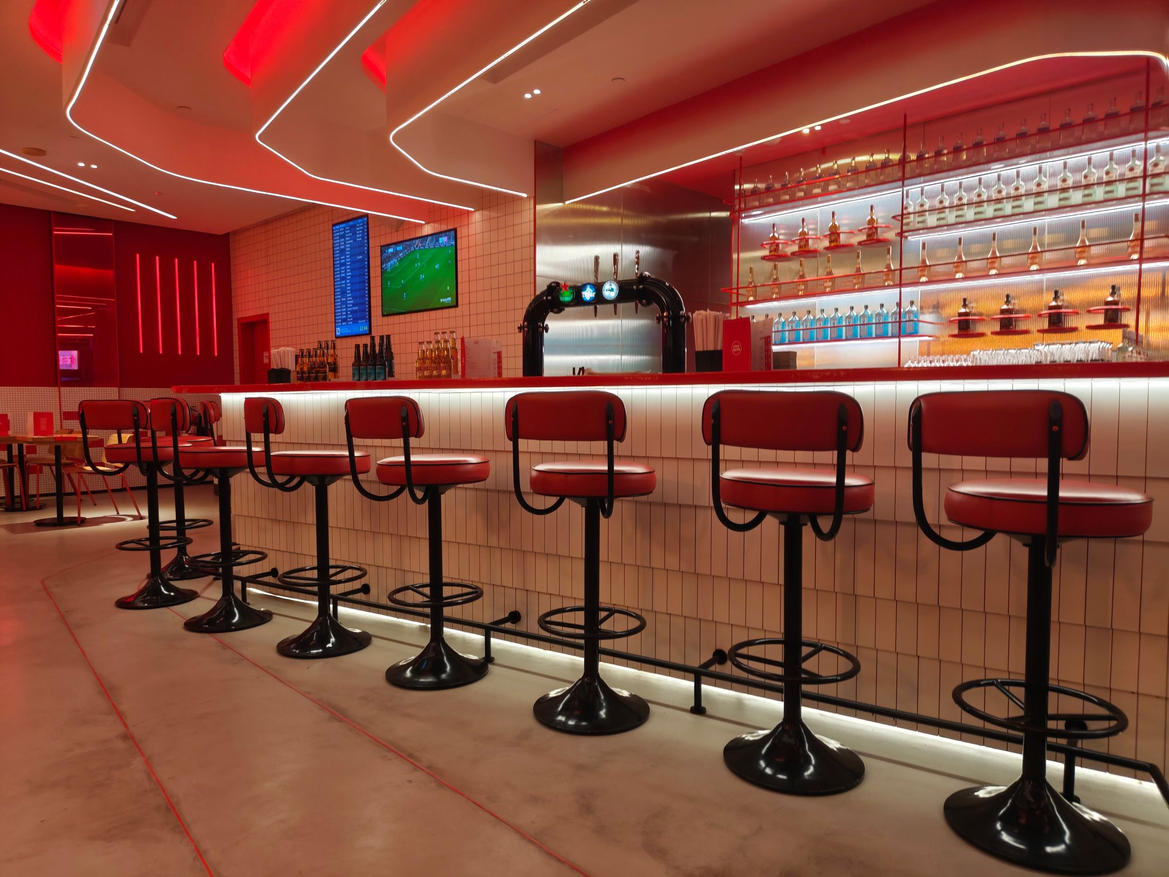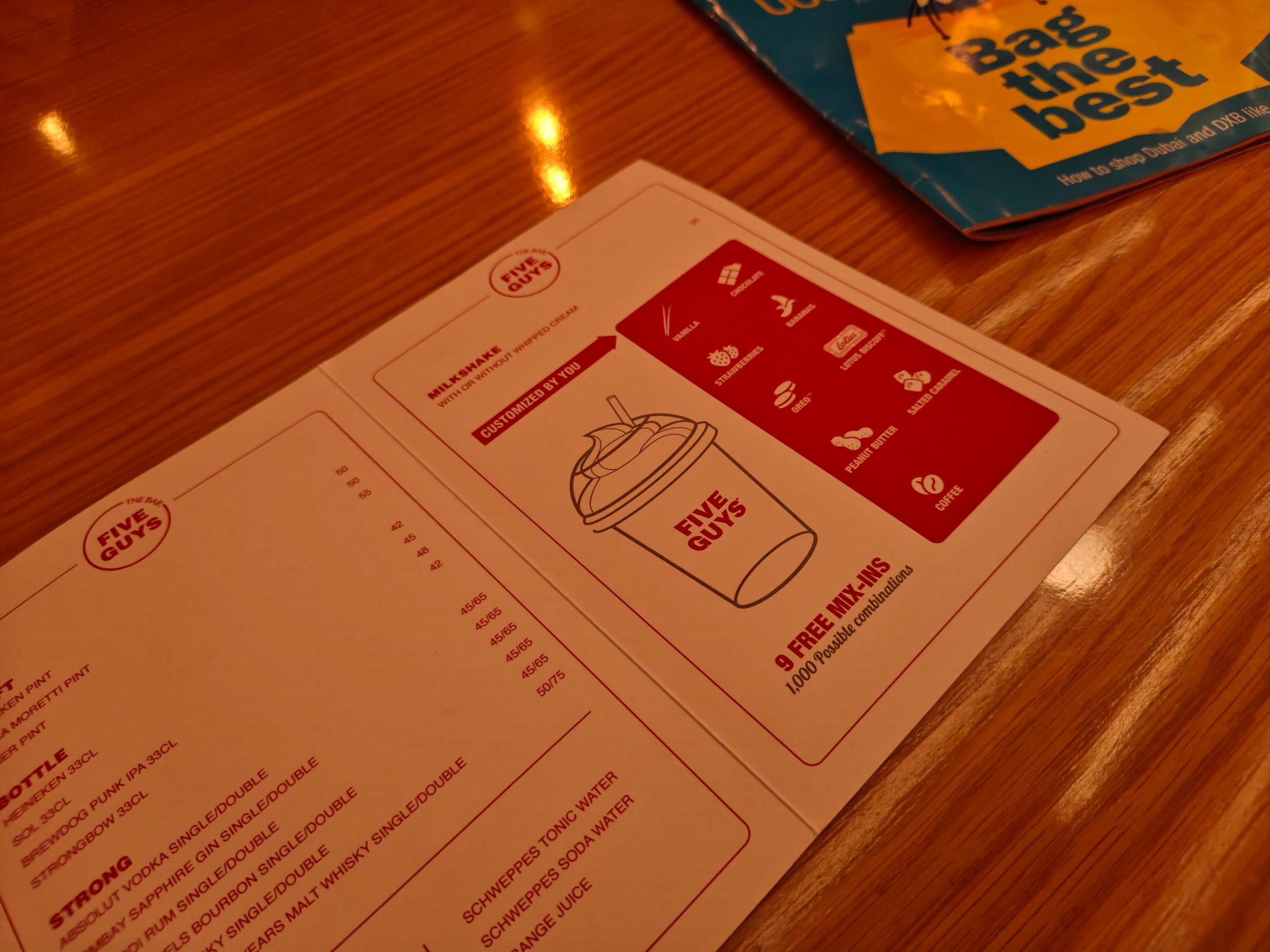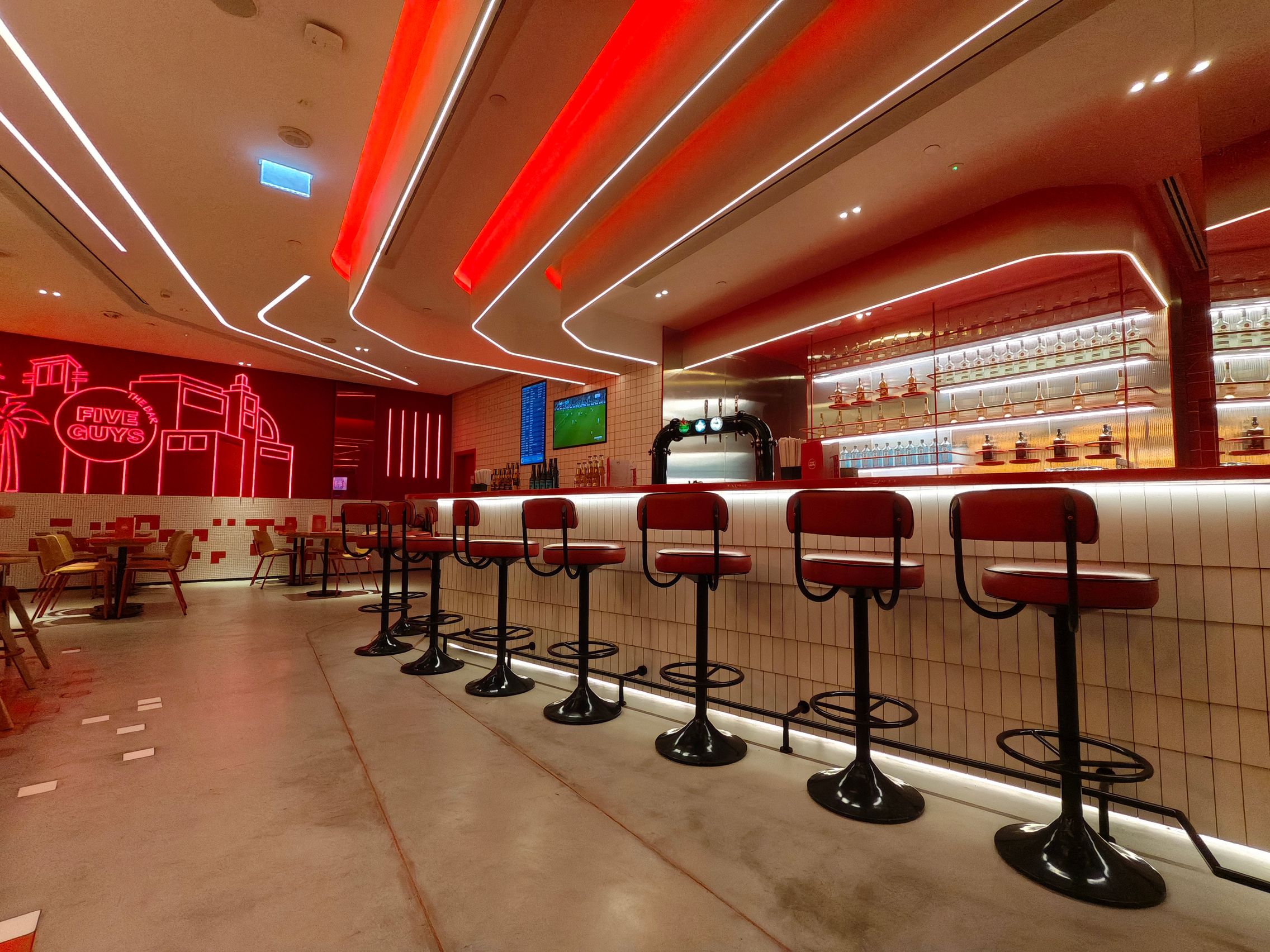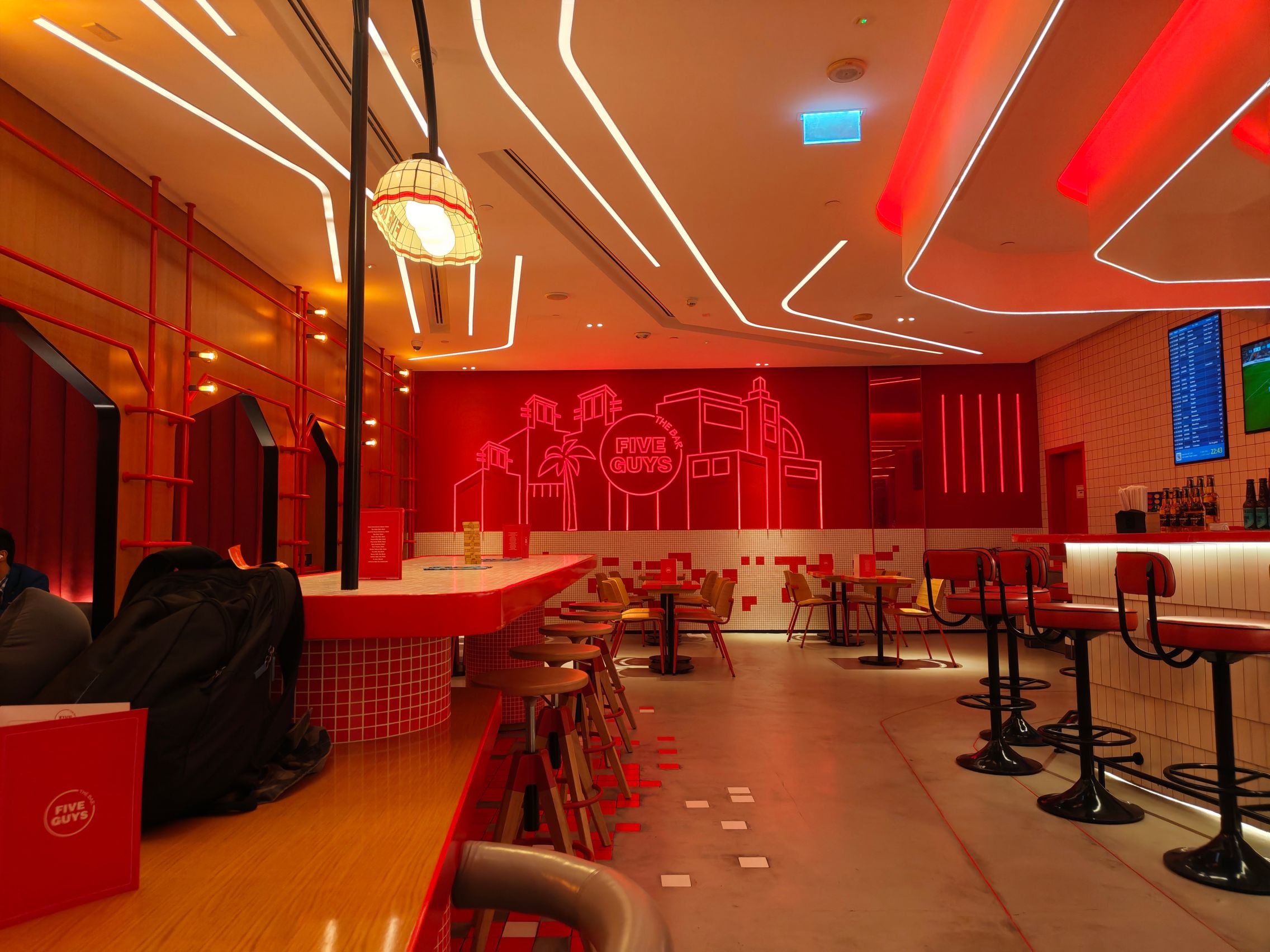 Pe timp de noapte am pus în primă fază camera lui POCO F8 Pro la treabă direct în aeroportul din Dubai unde am avut o escală lungă de 5 ore până la zborul spre Bali, iar oprirea a fost Five Guys. Cu multe lumini de ajustat și tonuri de roșu, camera nu a dezamăgit. A redat perfect atmosfera, fiind o zonă bar din restaurantul fast-food. Și cartofii lor celebrii arată tasty.