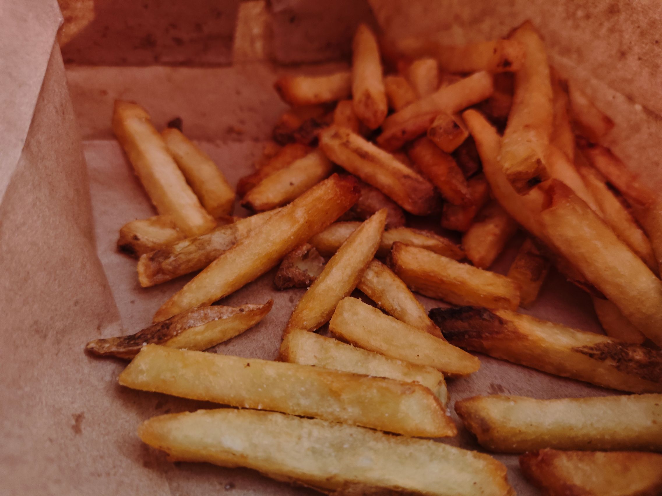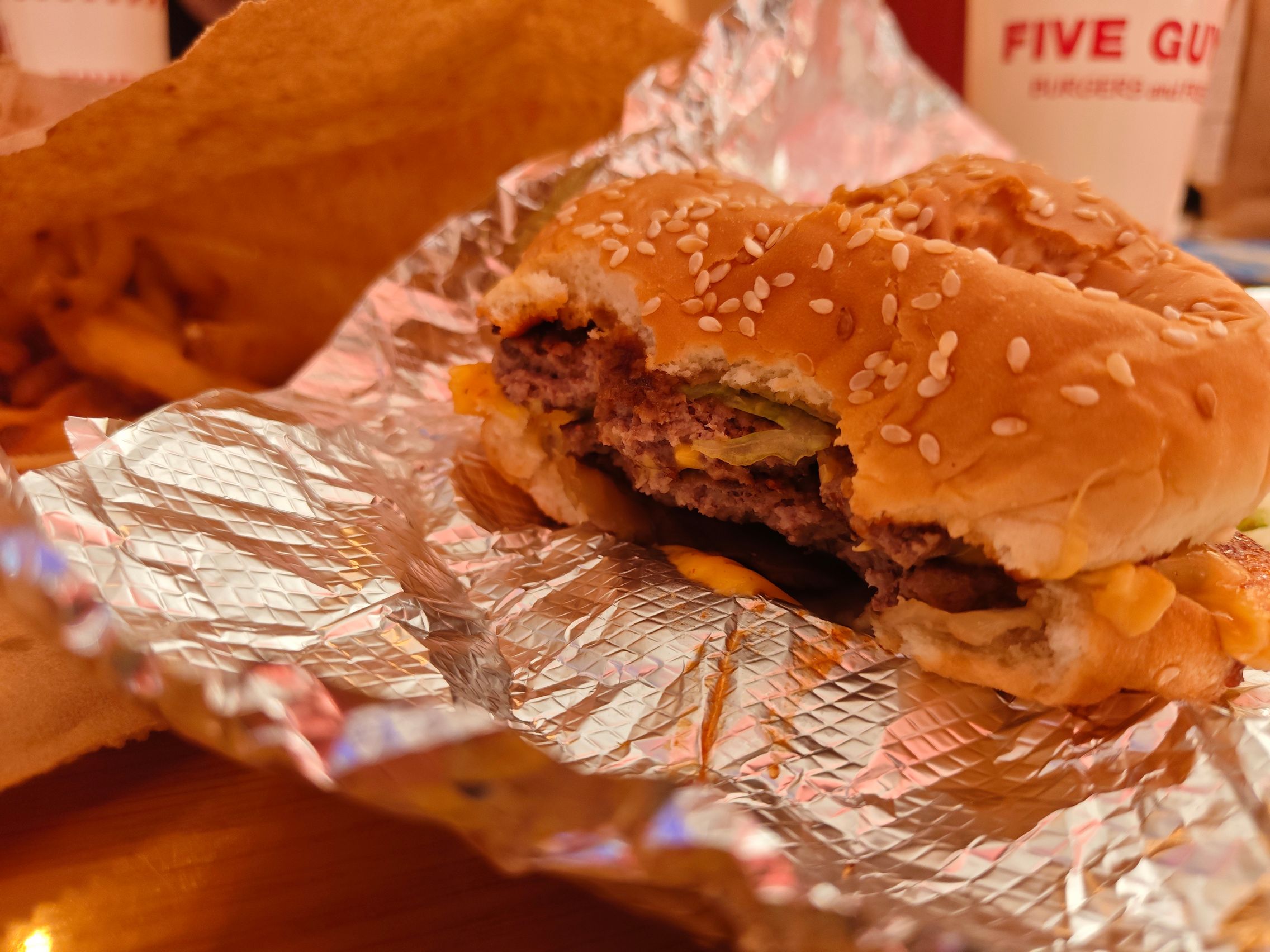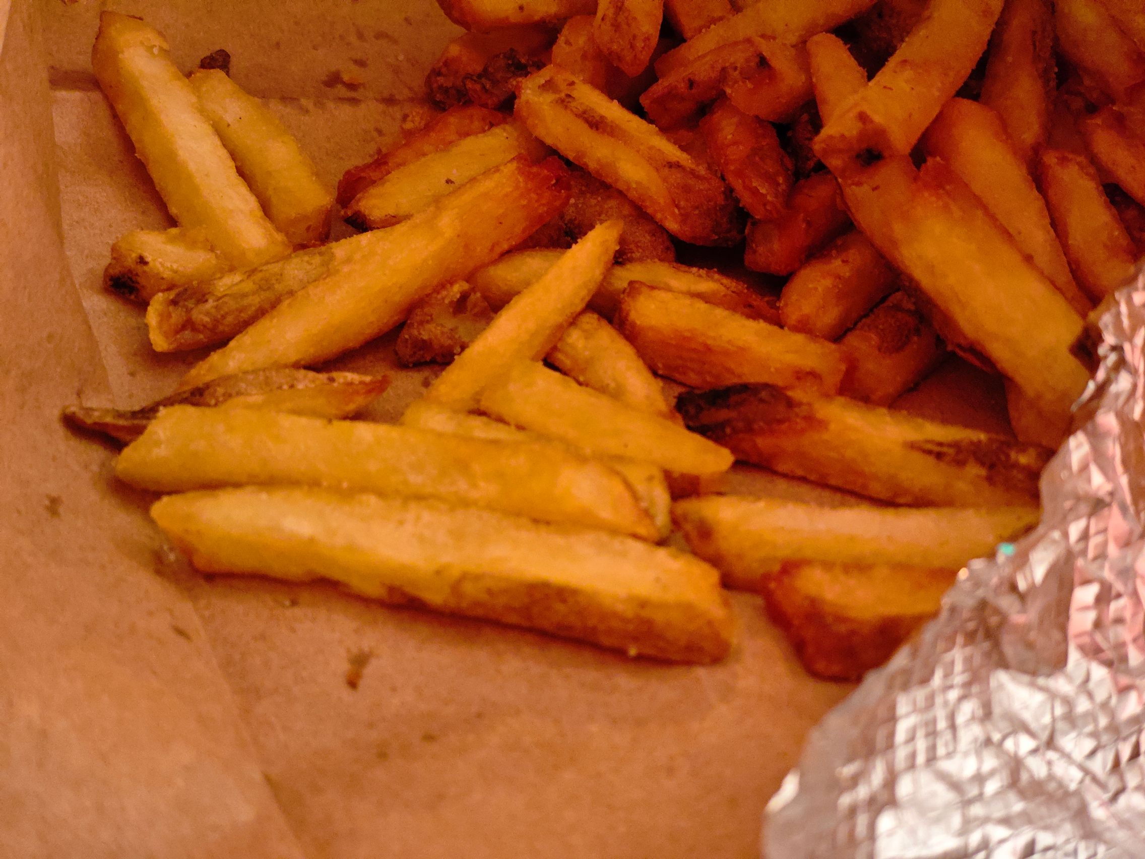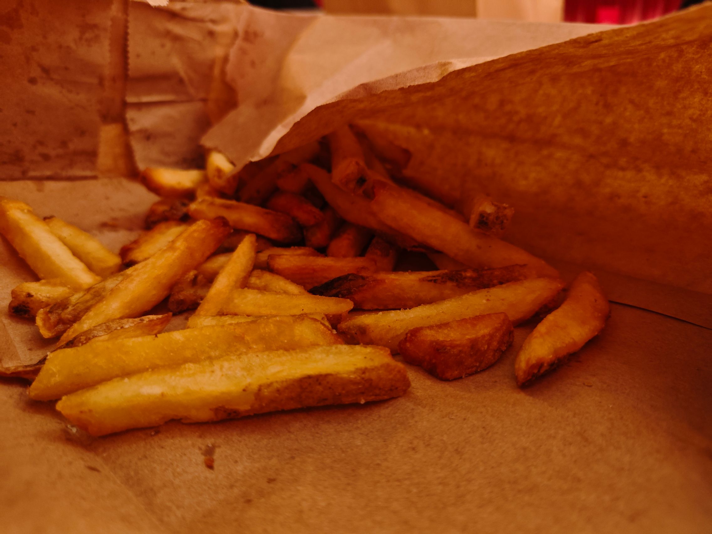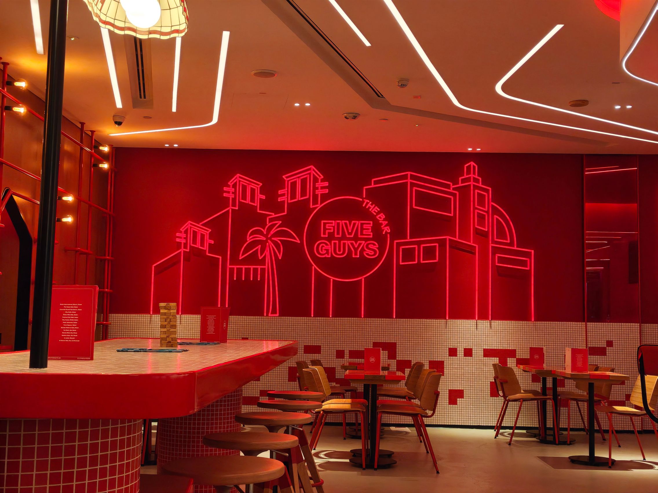Pe timp de noapte am pus în primă fază camera lui POCO F8 Pro la treabă direct în aeroportul din Dubai unde am avut o escală lungă de 5 ore până la zborul spre Bali, iar oprirea a fost Five Guys. Cu multe lumini de ajustat și tonuri de roșu, camera nu a dezamăgit. A redat perfect atmosfera, fiind o zonă bar din restaurantul fast-food. Și cartofii lor celebrii arată tasty.