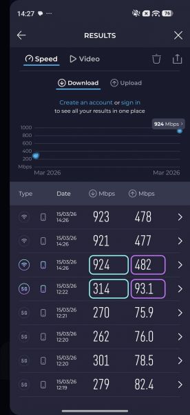 Sunt rezultate obținute în Ploiești, folosind un abonament YOXO 5G. Am obținut un maxim de 314 Mbps la download, respectiv 93.1 Mbps la upload. Sunt în continuare rezultate excelente pentru streaming și joacă on-the-go.
