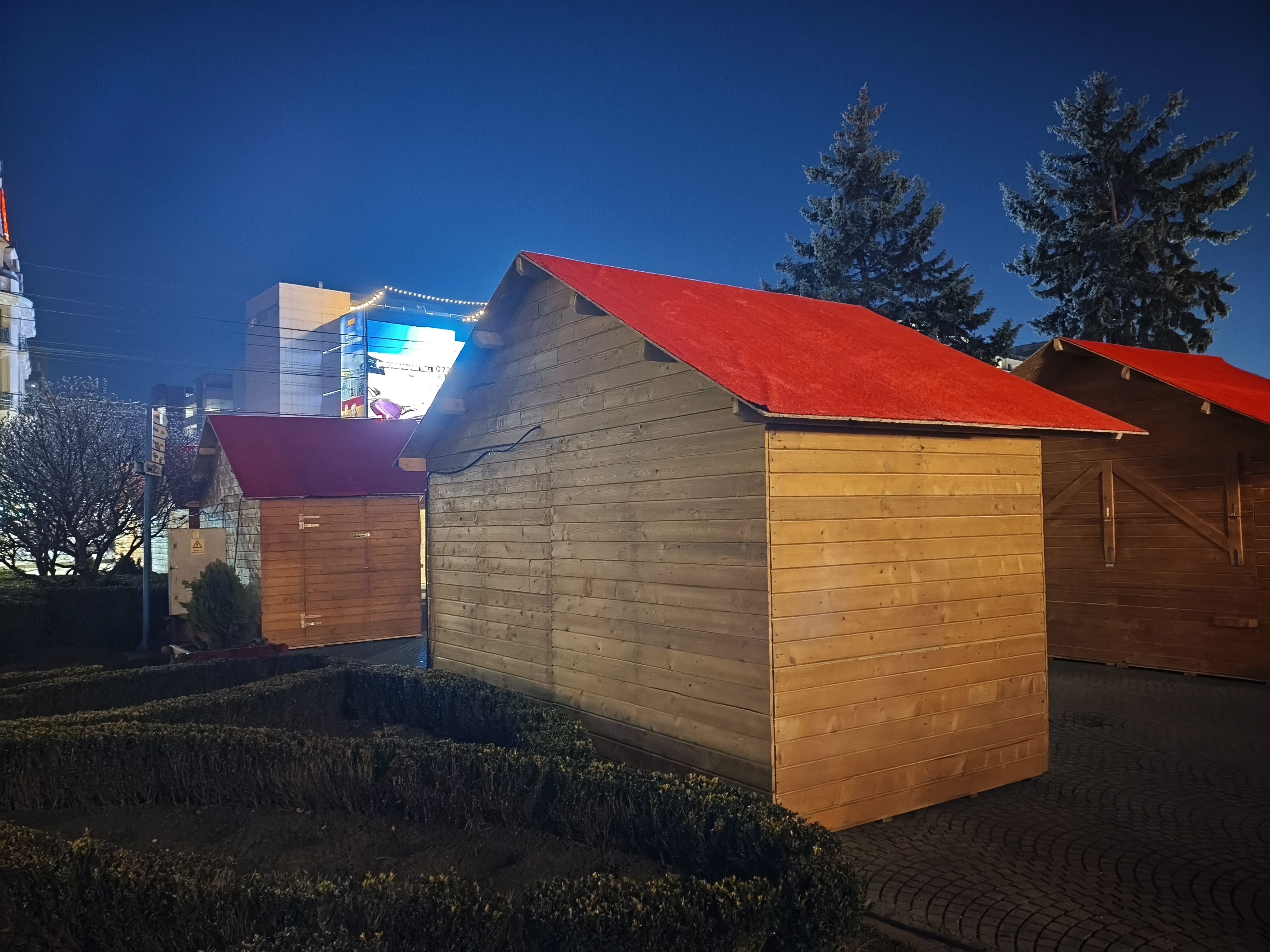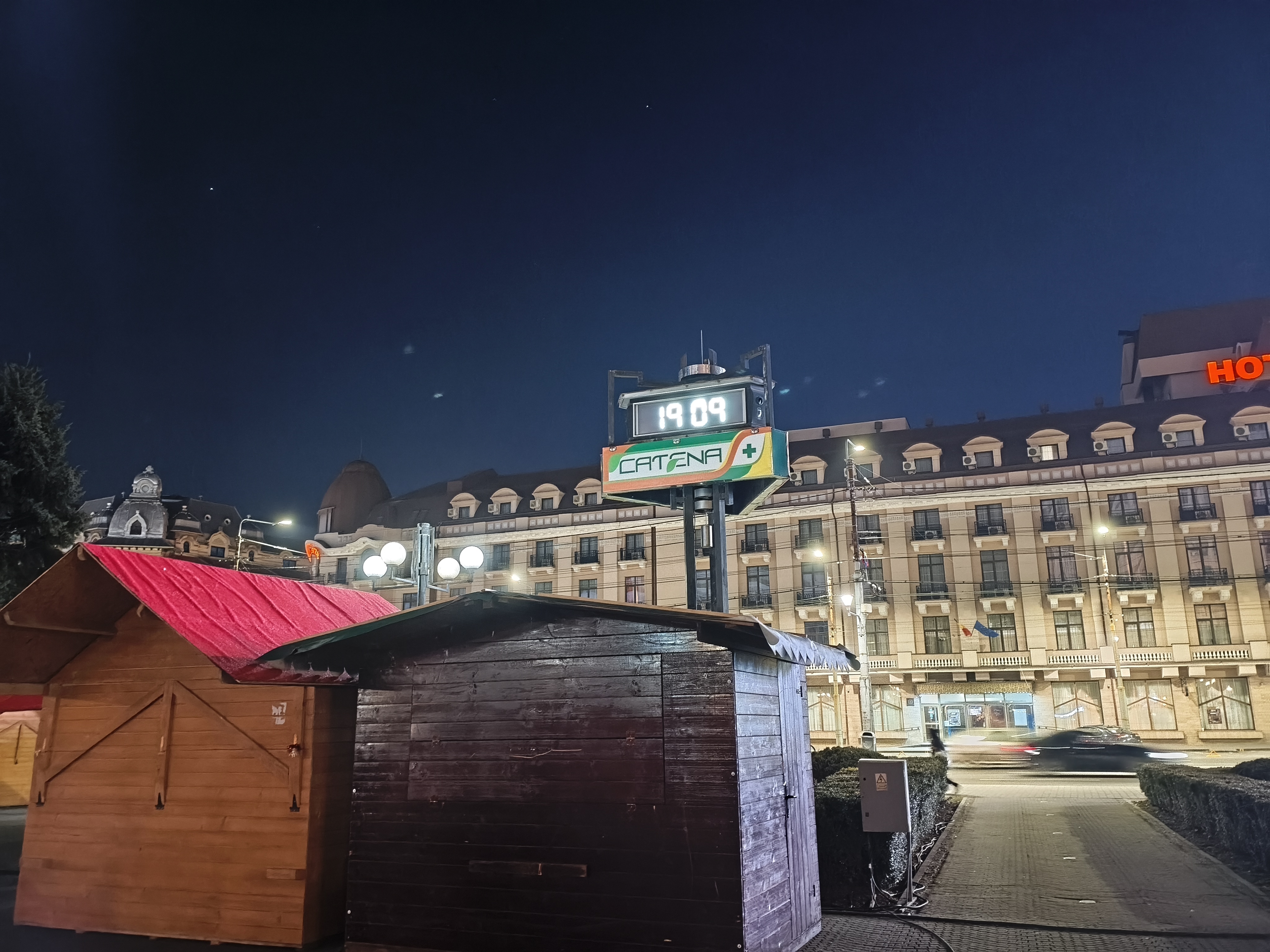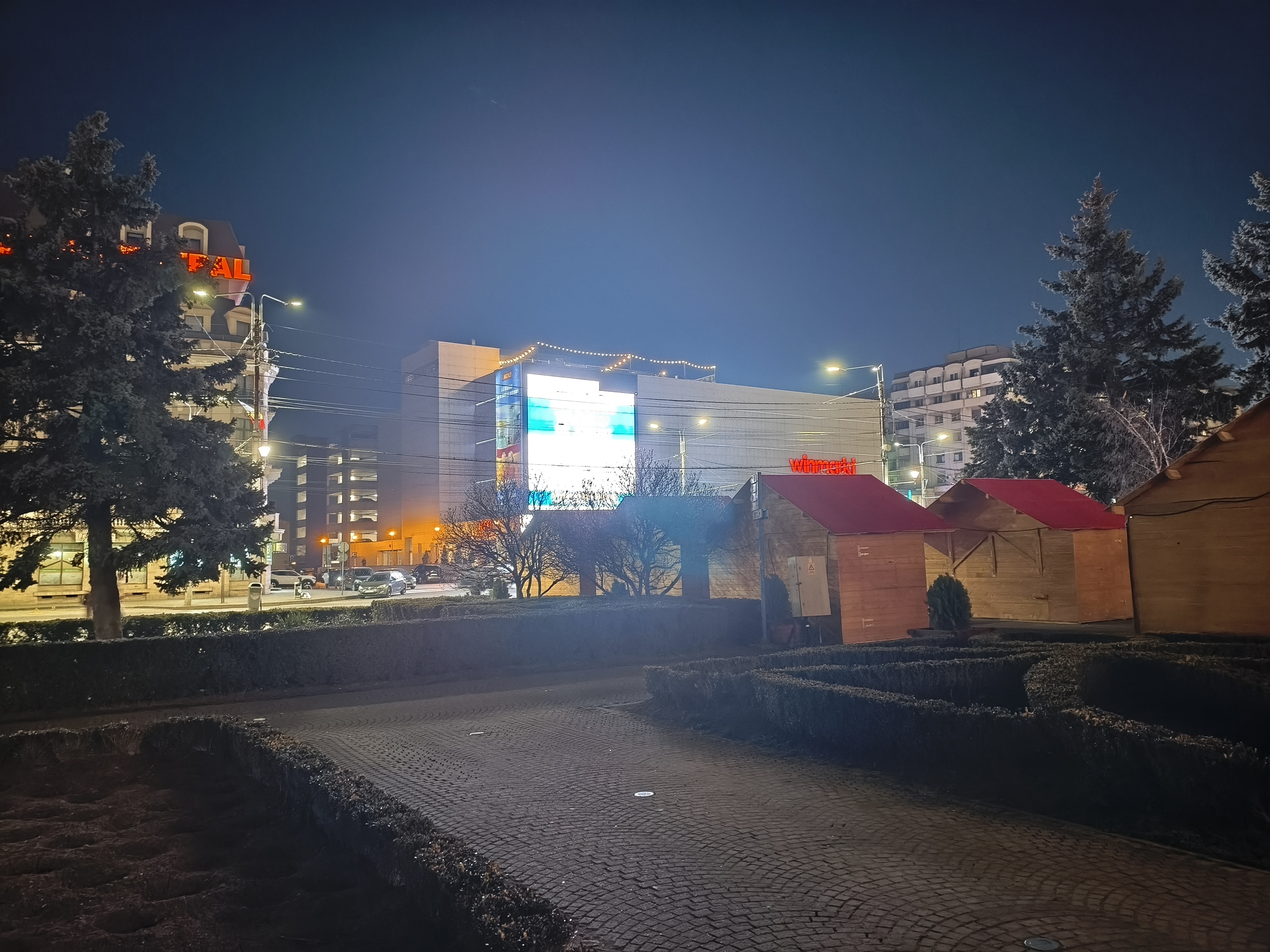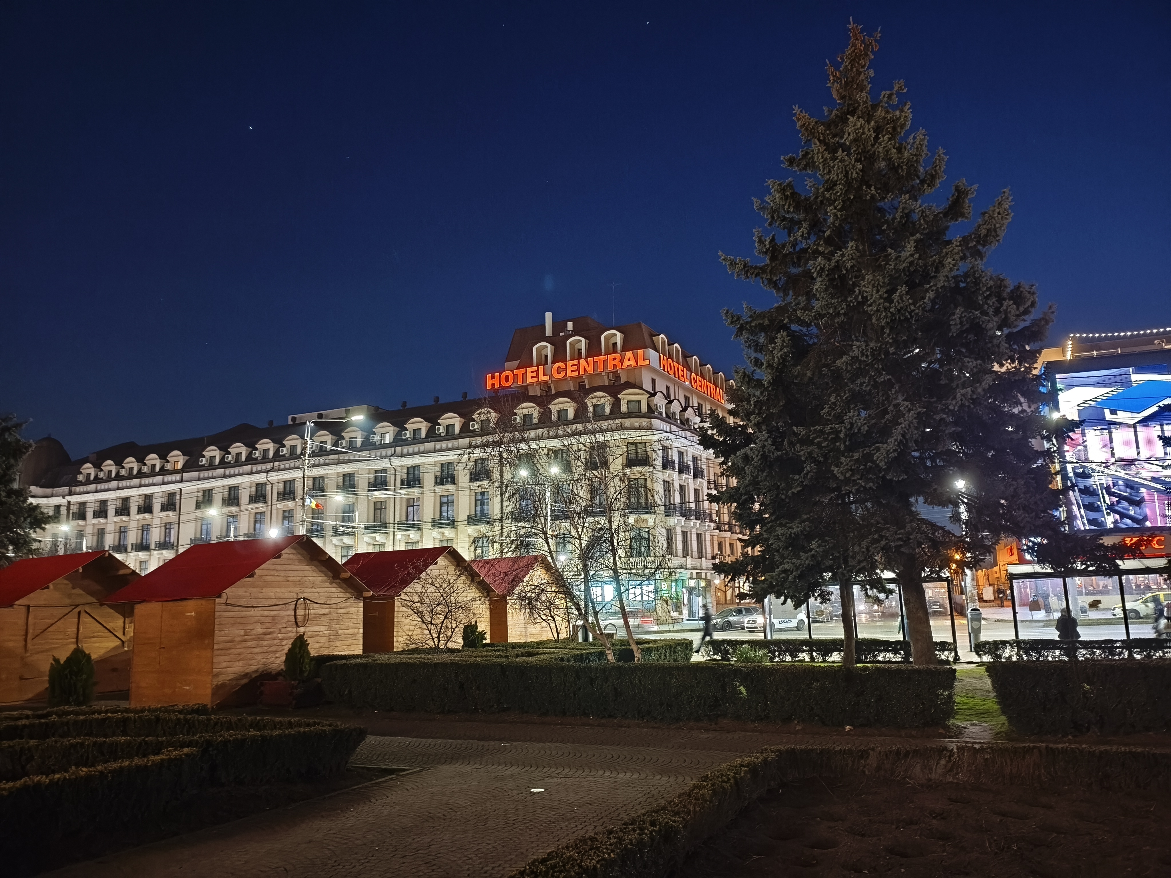 Chiar și noaptea am reușit pe alocuri să obțin un efect de bokeh plăcut (privesc spre fotografia în care apare Căsuța cu Povești). Zoom-ul pe Hotel Central e plăcut până pe la 3X, deși digital, iar în poza cu căsuțele amplasate pentru Târgul de Paște observ un cer corect redat, plăcut.