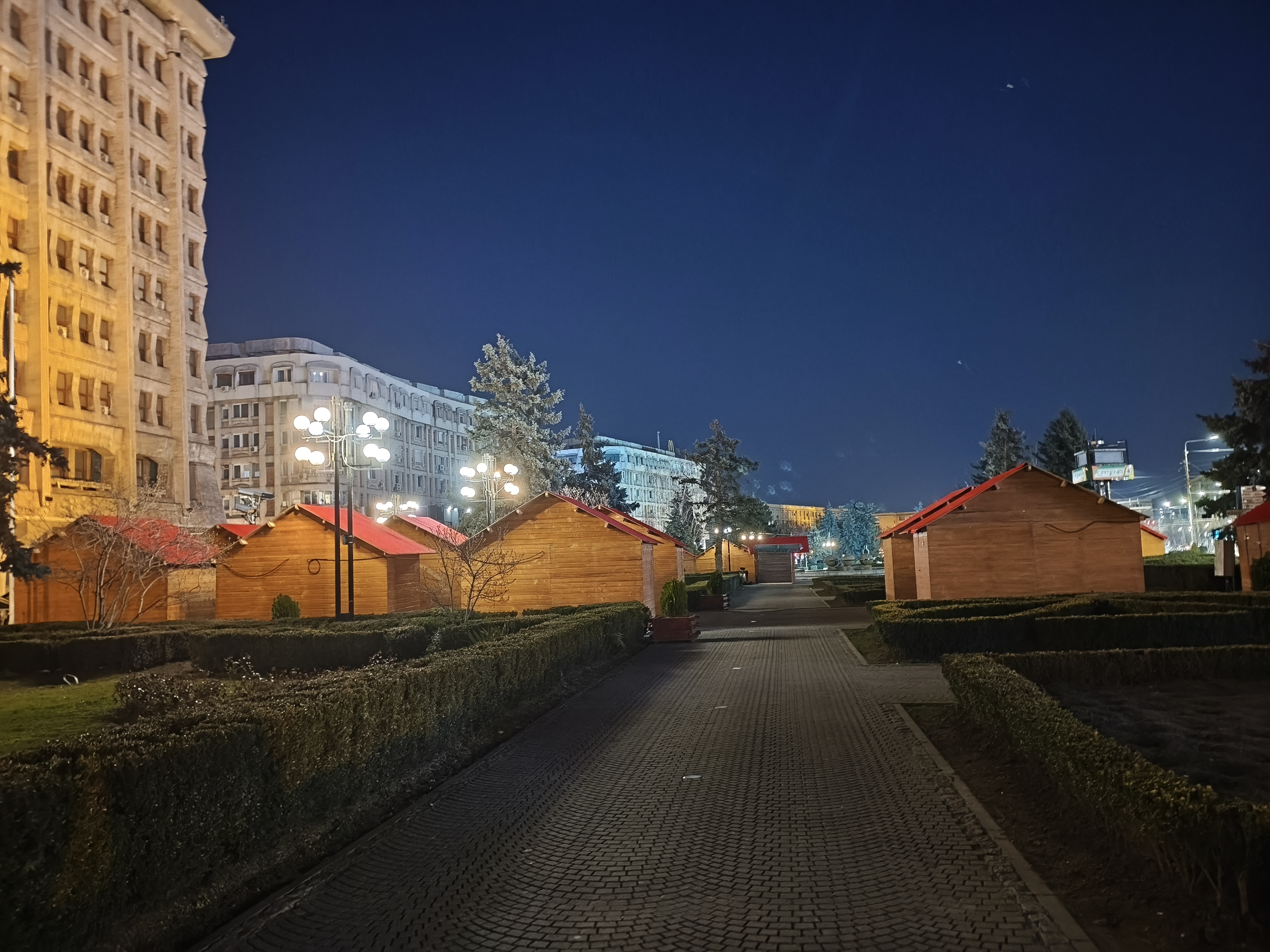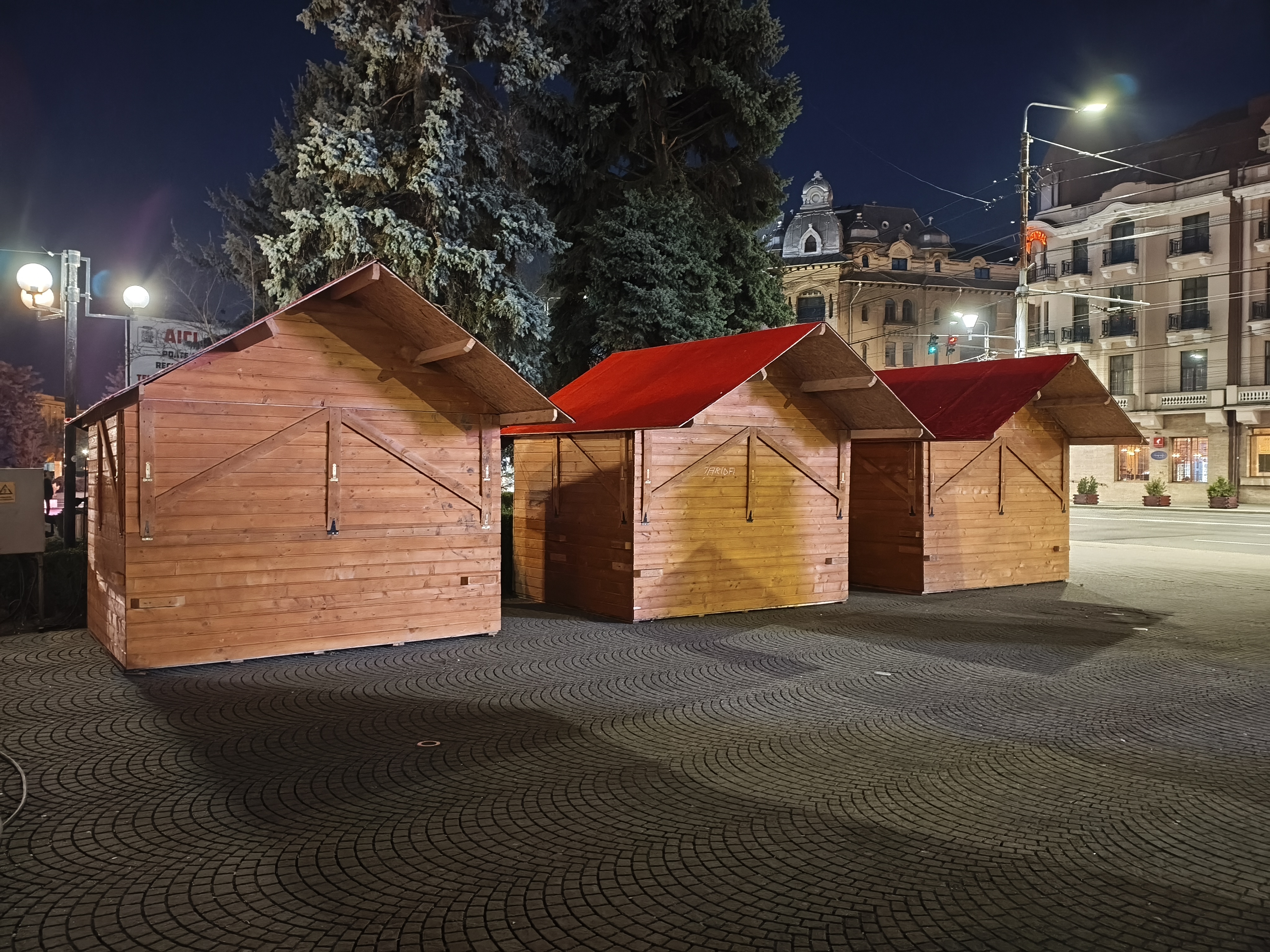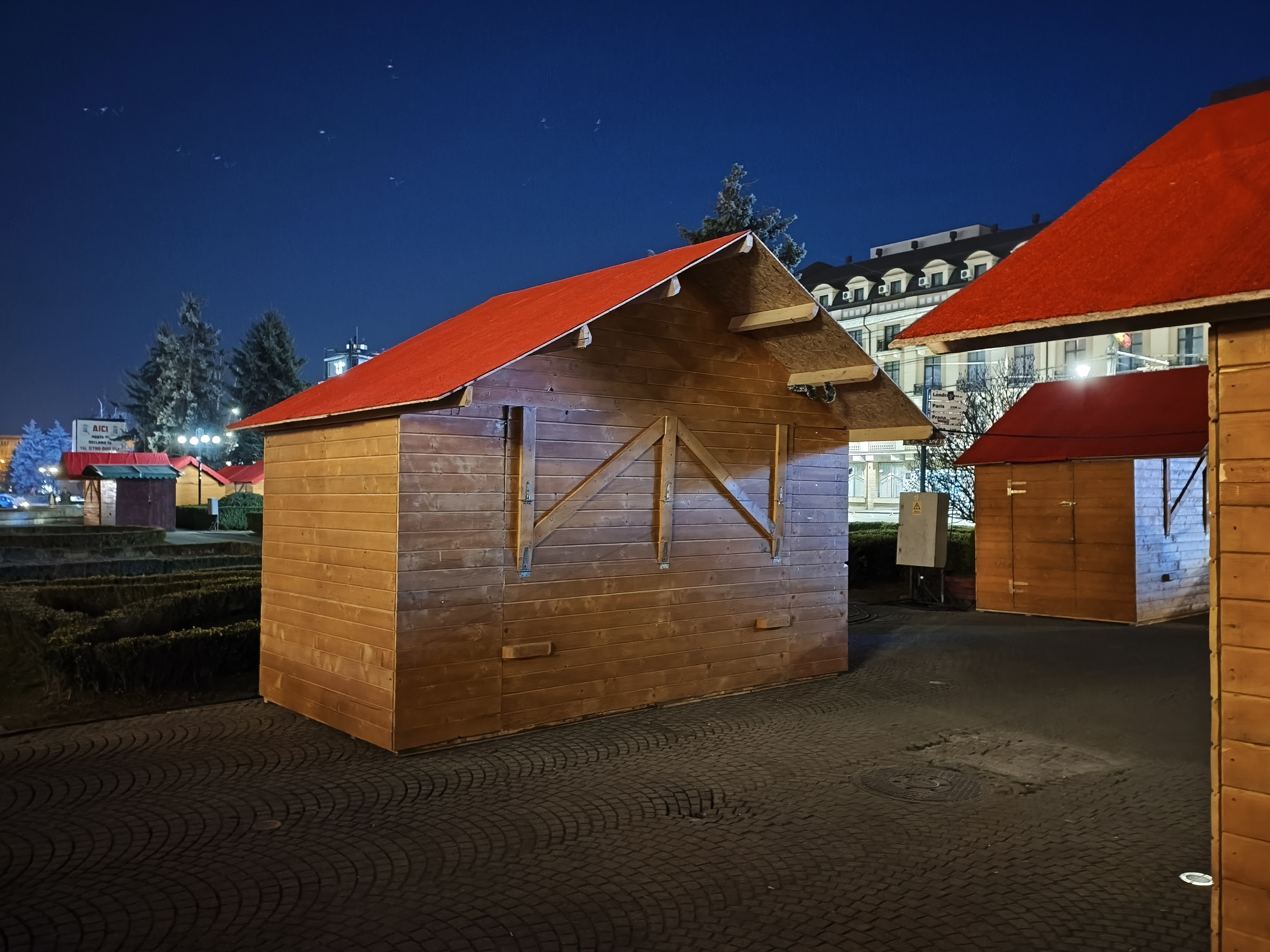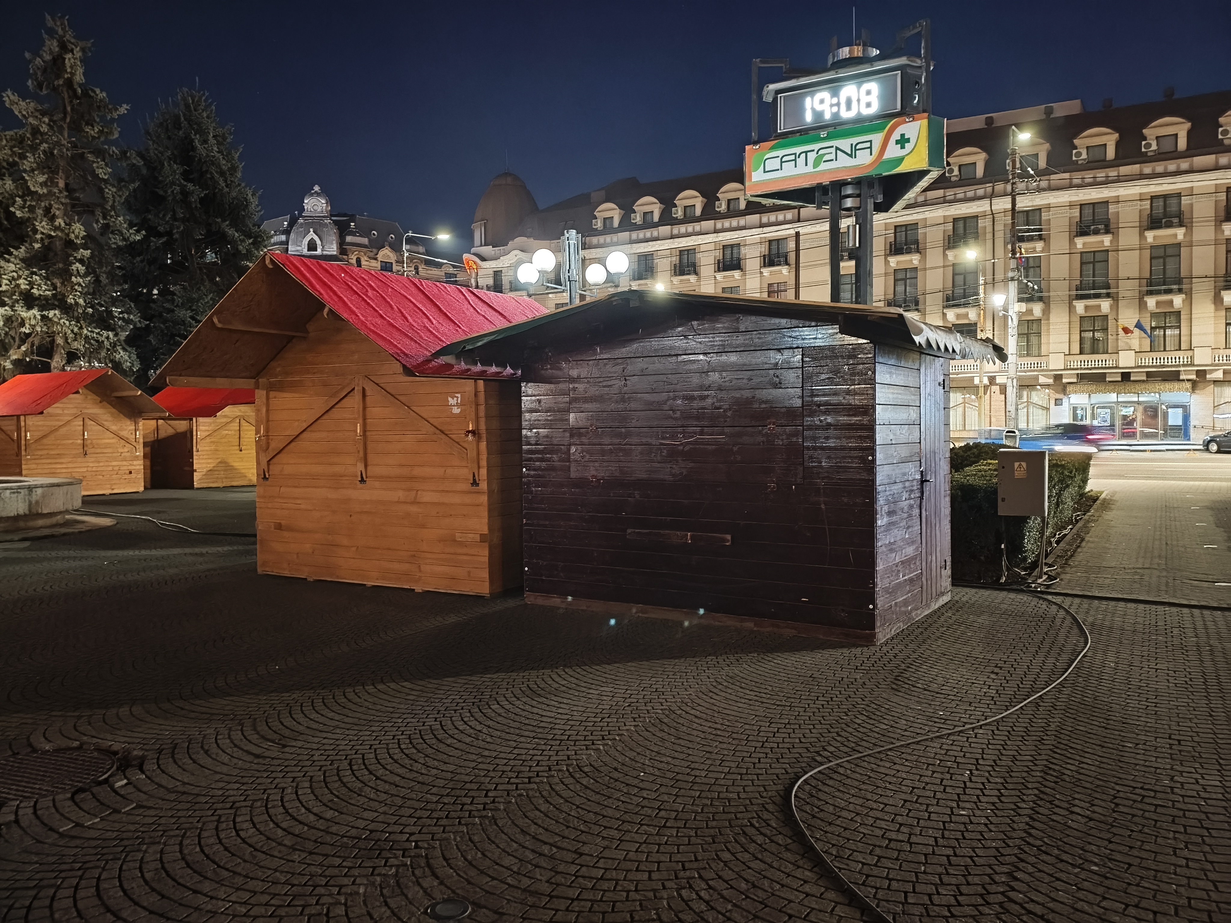 Chiar și noaptea am reușit pe alocuri să obțin un efect de bokeh plăcut (privesc spre fotografia în care apare Căsuța cu Povești). Zoom-ul pe Hotel Central e plăcut până pe la 3X, deși digital, iar în poza cu căsuțele amplasate pentru Târgul de Paște observ un cer corect redat, plăcut.