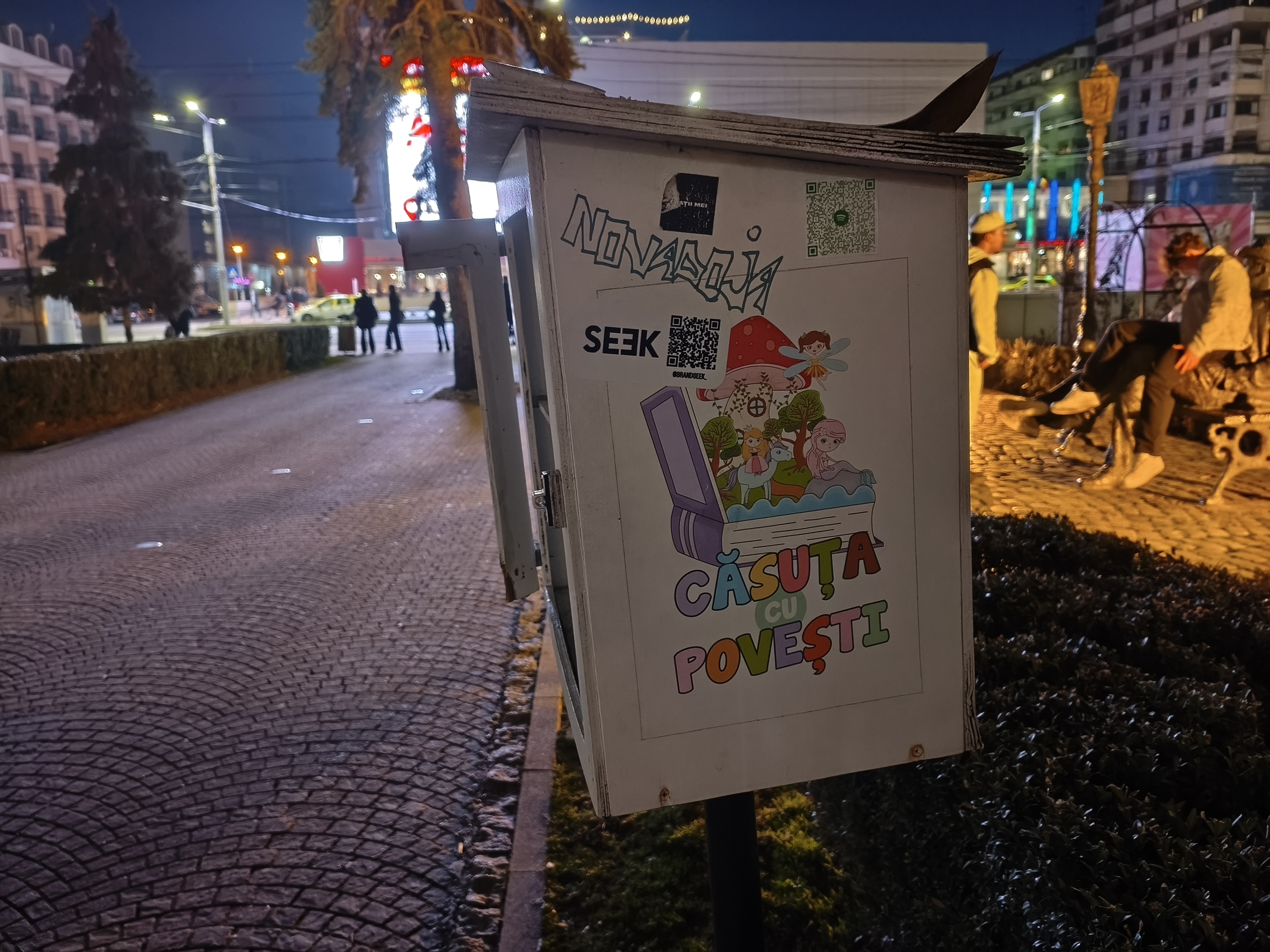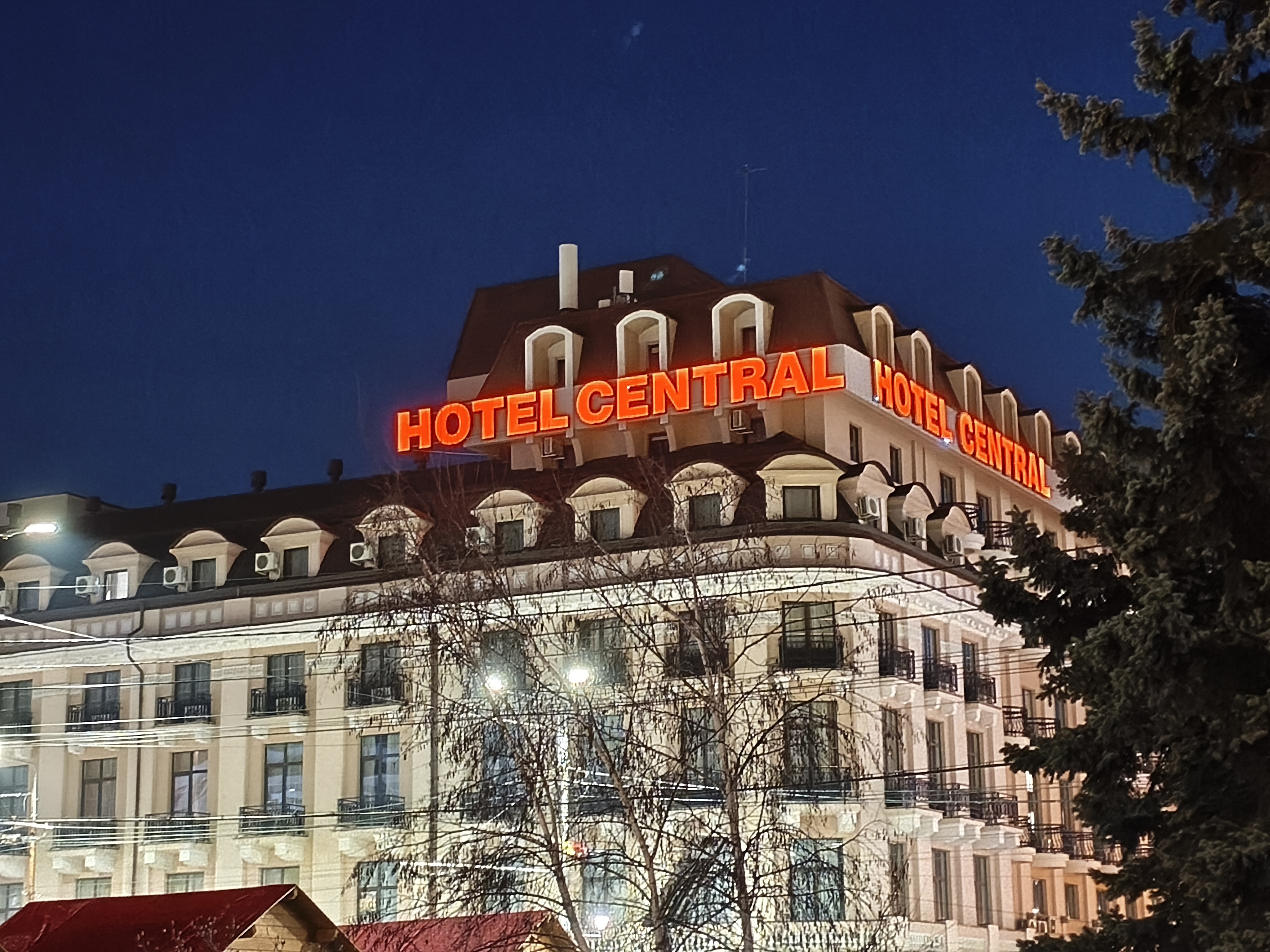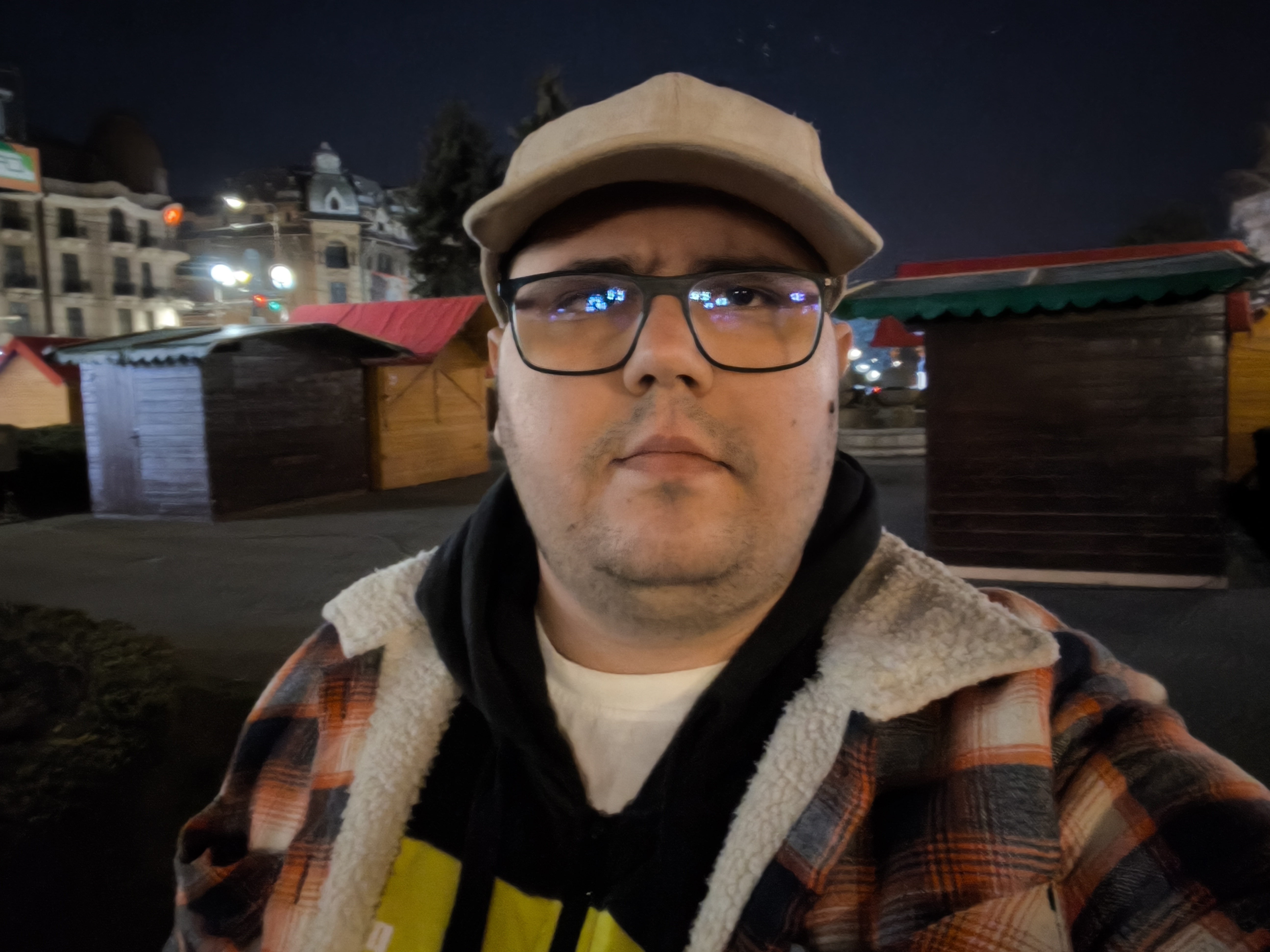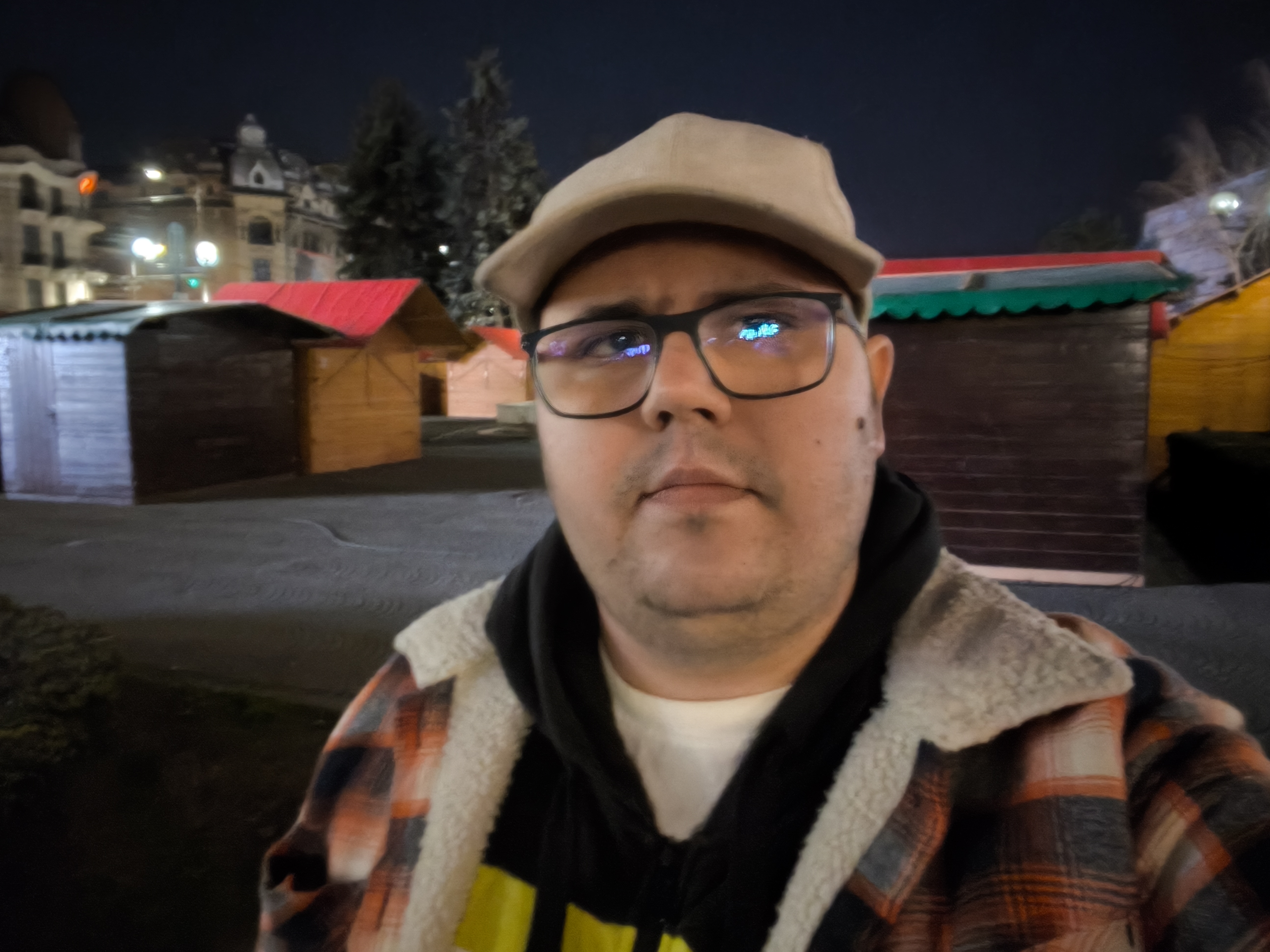 Chiar și noaptea am reușit pe alocuri să obțin un efect de bokeh plăcut (privesc spre fotografia în care apare Căsuța cu Povești). Zoom-ul pe Hotel Central e plăcut până pe la 3X, deși digital, iar în poza cu căsuțele amplasate pentru Târgul de Paște observ un cer corect redat, plăcut.