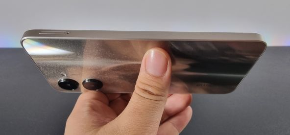 Smartphone-ul a sosit la mine pe nuanța „Sandy Gold” și în ciuda denumirii, nuanța bate mai mult spre argintiu. Mai există și versiunile Night Sea (negru) și Aqua Blue, însă. Acest model cântărește 187 de grame și măsoară 164.2 x 75.7 și are 8.3 mm în talie. Corpul său e fabricat în mare parte din plastic, avem un spate și muchii drepte, în stil iPhone 12 / 13 și colțuri rotunjite.