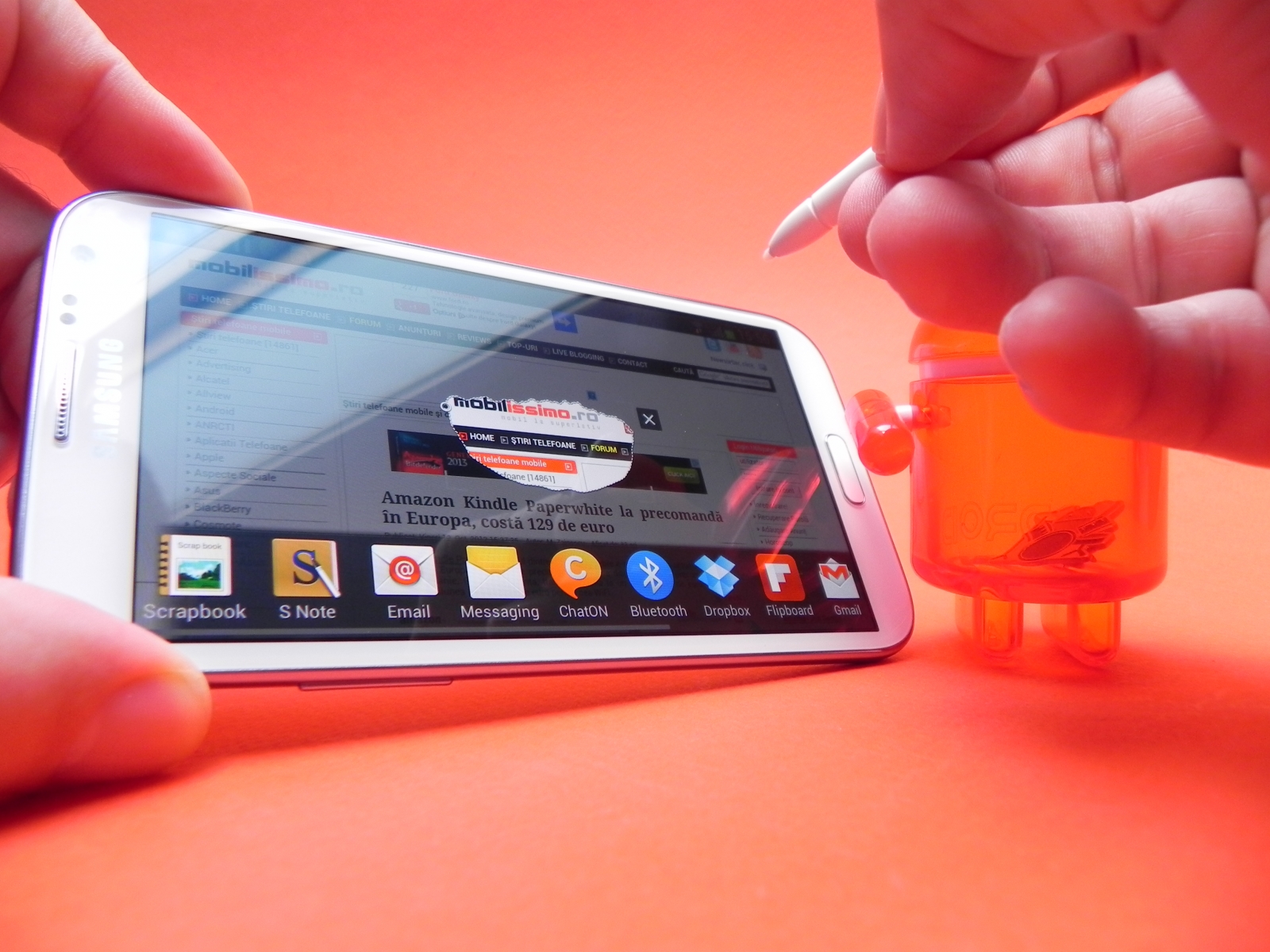 Ca și la Galaxy S III puteți face captură de ecran și măturând ecranul cu palma. Probabil funcția lui Note II care mi-a plăcut cel mai mult, multitasking-ul unic de aici începe cu apăsarea butonului Back. Astfel se declanșează funcția Multi Window, care implică o bară laterală plină de aplicații. Cu acestea puteți face drag and drop pe ecran în vreme ce folosiți alte aplicații și display-ul lui Note II se va împărți în două, în vreme ce priviți un clip pe YouTube sus, iar jos trimiteți un mail, luați notițe, sau căutați ceva pe web.