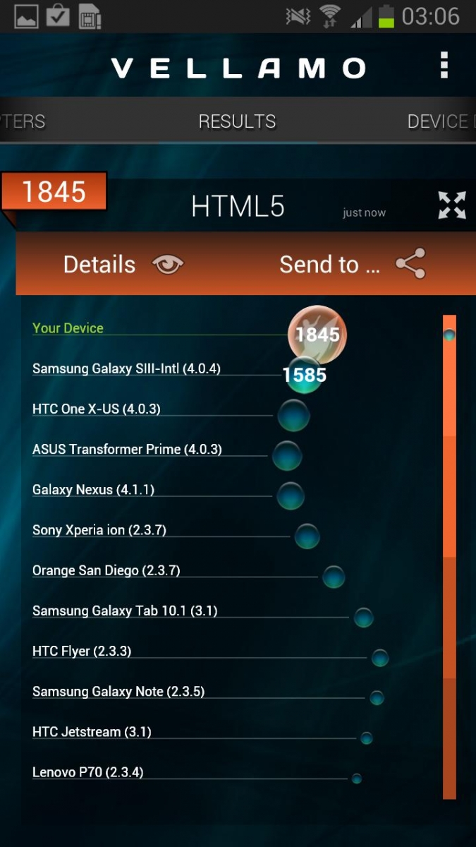 în AnTuTu obținem un impresionant scor de 13629 puncte, față de cele 9921 ale lui Galaxy S III, 11.200 ale lui HTC One X și 10.950 ale lui Nexus 7. De GPU și partea grafică se ocupă NenaMark 2, în care am scos 58 FPS, exact ca și Galaxy S III, în vreme ce HTC One X obține 47 FPs, iar Nexus 7 un admirabil 55.8 FPS. Doar HTC One S și ASUS PadFone au depășit Galaxy Note II, cu 60 FPS, datorită lui Snapdragon S4. în Vellamo batem iar recorduri, cu 1845 puncte, peste Galaxy S III, cu 1600 sau Nexus 7, cu 1773 puncte.