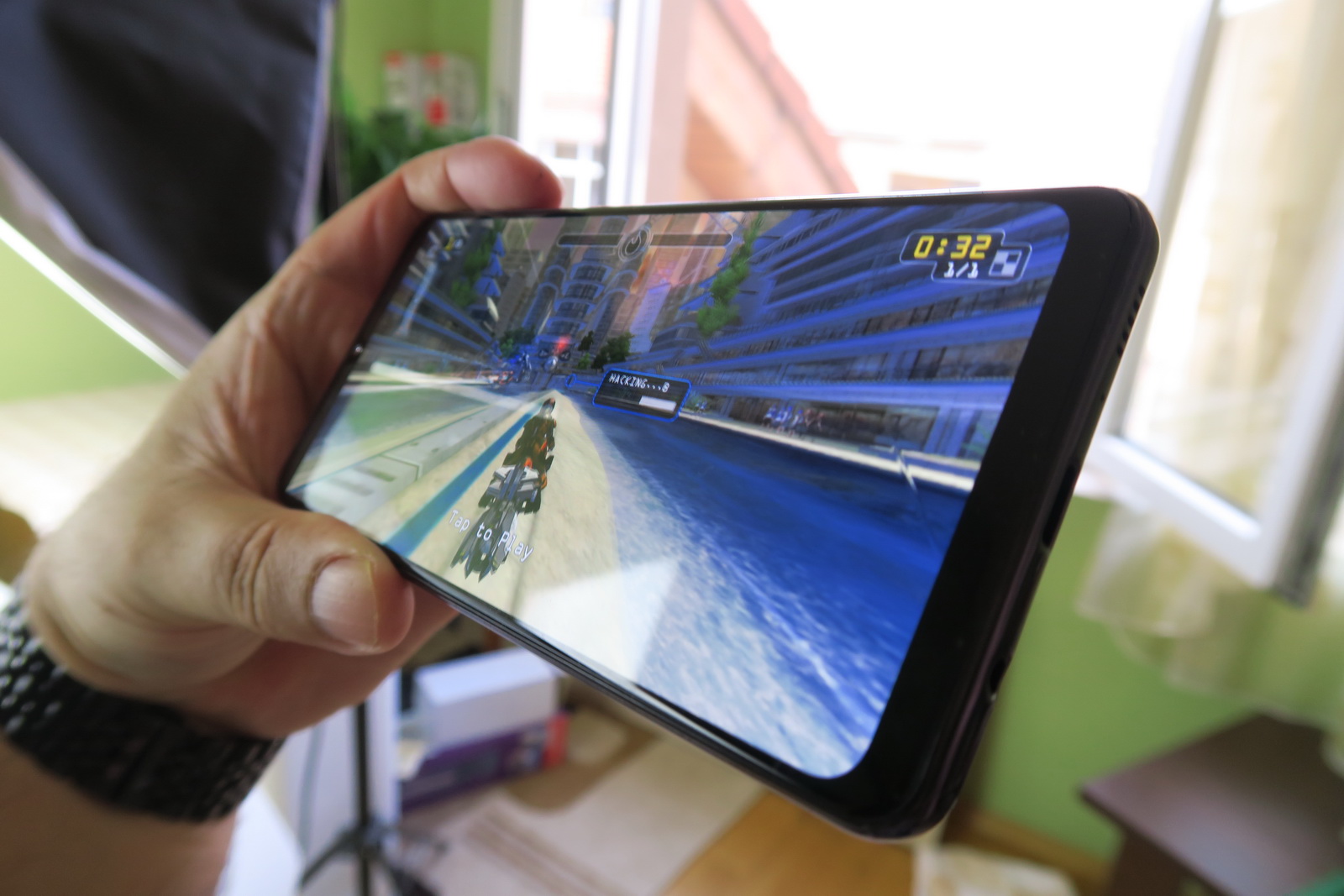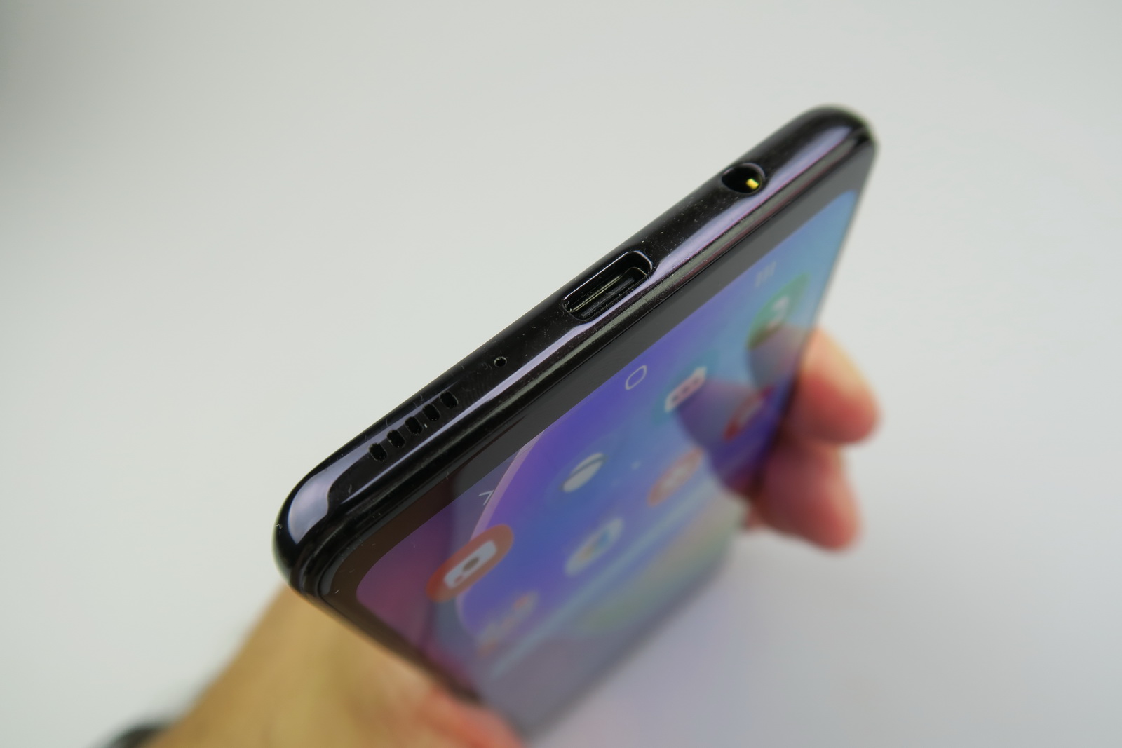 Noi avem varianta neagră, care prinde efecte de curcubeu în bătaia luminii, pe prismele ascunse în spate. Modelul negru atrage ceva mai multe amprente decât alte variante de culoare aş zice. Find vorba de plastic aici, aţi face bine să faceţi rost şi de o husă, altfel se lasă cu zgârieturi. Galaxy A31 e uşor alunecos şi vine cu o talie de 8.6 mm şi greutate de 185 de grame. E mai manevrabil decât te-ai aştepta pentru un telefon cu baterie de 5000 mAh.