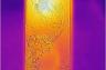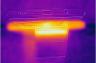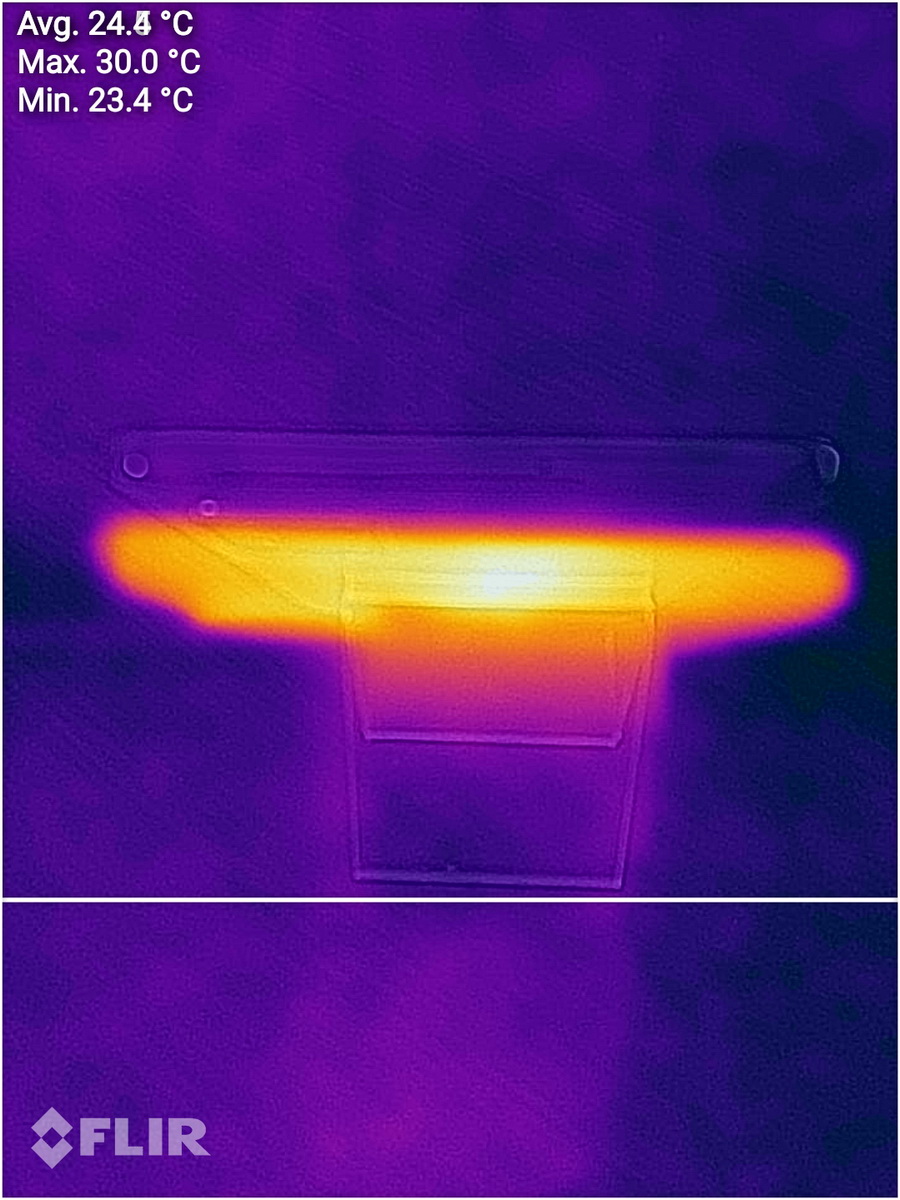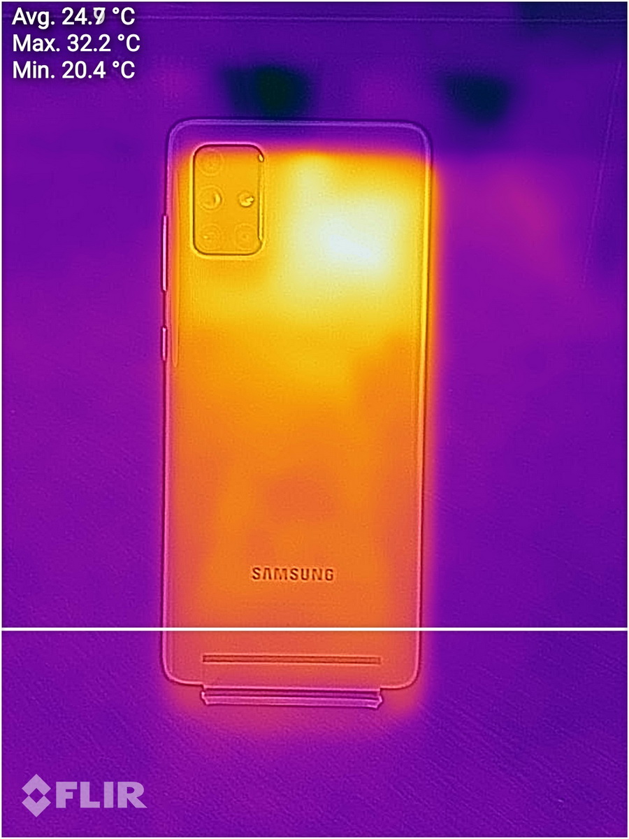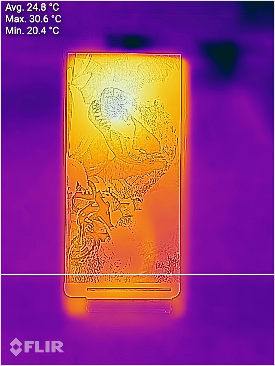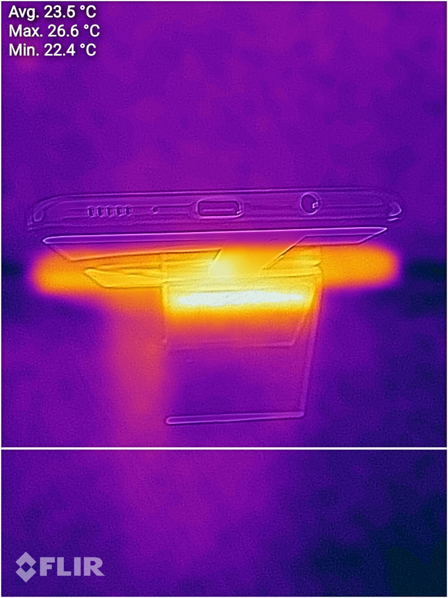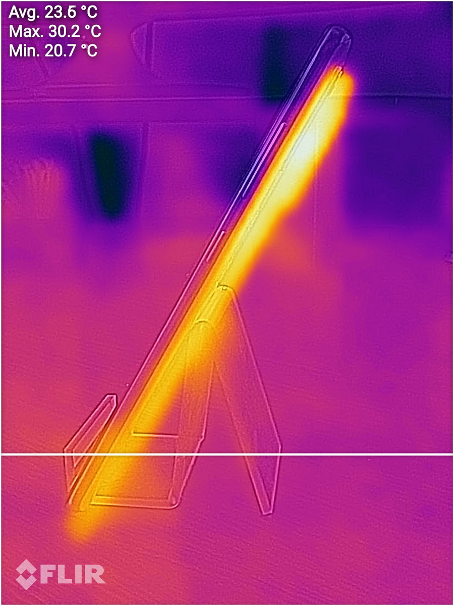 Avem şi o hartă termică în care se vede că doar zona de sus a telefonului e mai caldă, dar nici aceea excesiv şi căldura se disipează bine.