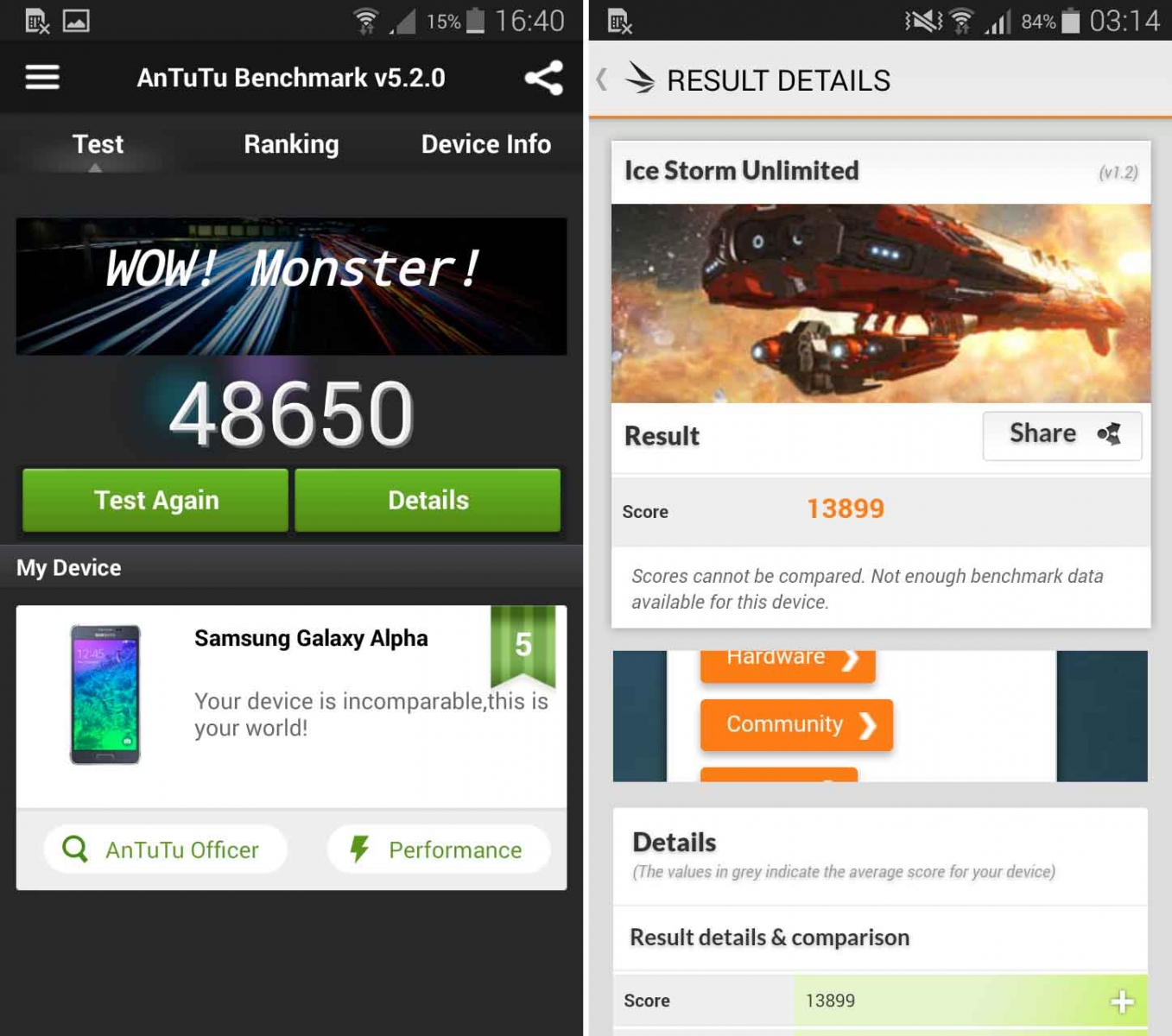 Bătălia se dă aici între două terminale cu procesor Snapdragon 801, unul cu Exynos 5 Octa de 20 nm și unul cu Apple A8, iar Galaxy Alpha câștiga 4 din 10 bătălii. Acest model e egal uneori cu Galaxy S5 în unele teste, dar în ciuda rezultatelor, nu avem pic de lag și putem rula orice joc cu grafică 3D fără probleme. Avem aici același TouchWiz pe care îl știm deja din precedentele recenzii, cu zona multitasking cu thumbnail-uri mari, My Magazine cu homescreen dedicat și Flipboard la bază și widgeturi custom.