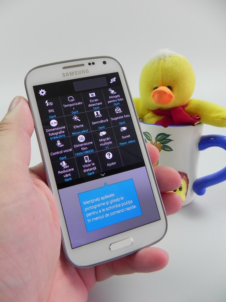 Nici fotografierea nu pot spune că e prea rapidă, iar dacă țineți ecranul apăsat puțin și faceți un mic drag and drop cu acel pătrat galben, veți putea regla focalizarea și expunerea imediat. Interfața e una tipică pentru un terminal Samsung, cu o serie de shortcut-uri personalizabile în stânga și o zonă amplă de setări. Aceasta oferă opțiuni pentru blitz, timer, detection display, țap to take picture și rezoluție (5184 x 3888 în 4:3, 5184 x 3456 în 3:2 sau 5184 x 2916 în 16:9). Tot setările oferă și Efecte, Semnătura pentru fotografii, Photo Suggest (prin Panoramio), control vocal, calitate la captura video (Full HD la 30 sau 60 FPS, HD etc), dar și opțiunea Mulți Motion (captură slow motion de până la 8 ori mai lentă și fast motion de până la 8 ori mai rapidă).