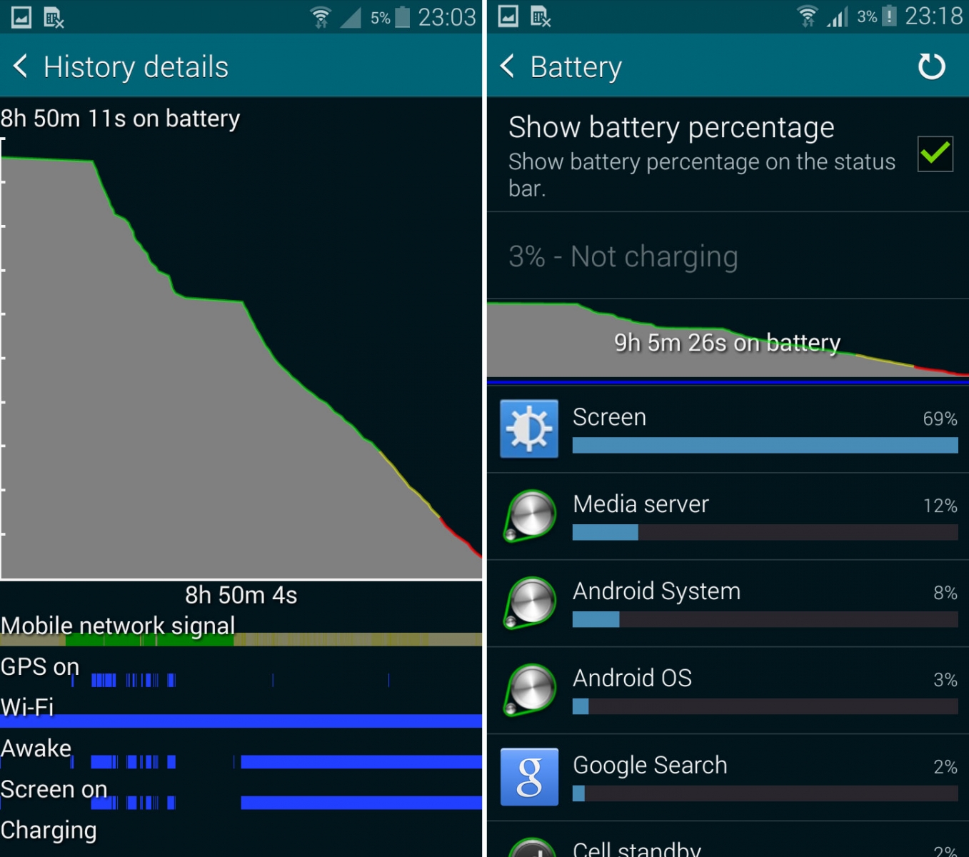 Pe hârtie aceasta baterie asigura 9 ore de browsing web via WiFi, 11 ore de playback video HD sau 47 de ore de playback audio. La testul nostru, de playback video HD, cu WiFi pornit și luminozitate la 50% am atins în total 9 ore și 7 minute, ceea ce e destul de bine, în condițiile în care alt cameraphone celebru, Lumia 1020 atinge 6 ore de playback HD. Xperia Z2 în schimb atinge 11 ore. încărcarea acestui model durează 2 ore, ceea ce e OK. Există și funcții Power Save evident, care includ opțiuni pentru dezactivarea vibrațiilor, blocarea transferului de date în fundal, limitarea performanței procesorului, reducerea frame rate-ului ecranului și dezactivarea butoanelor touch de sub ecran, dar și dezactivarea GPS-ului.