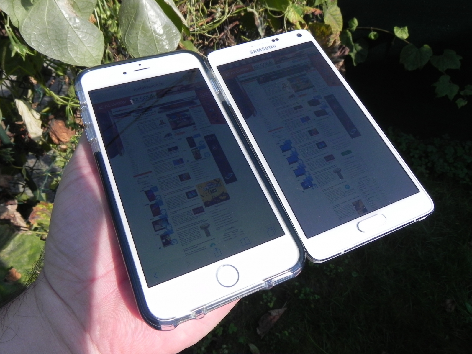 Astfel, Galaxy Note 4 e campion pe partea de luminozitate, dintre toate terminalele testate de noi. Avem și o fotografie cu Note 4 în bătaia soarelui, astfel încât o parte din ecran să fie în umbră și să remarcați diferența. Ideea e că telefonul se vede fără probleme în bătaia soarelui. Atunci când puneți iPhone 6 Plus și Note 4 unul lângă altul în bătaia soarelui, Note 4 se vede puțin mai bine. în mod diferențiat de restul terminalelor, luminozitatea acestui phablet este mai ridicată în mod Auto (cu slider-ul la +5 ce- drept), decât în modul Manual la maxim.