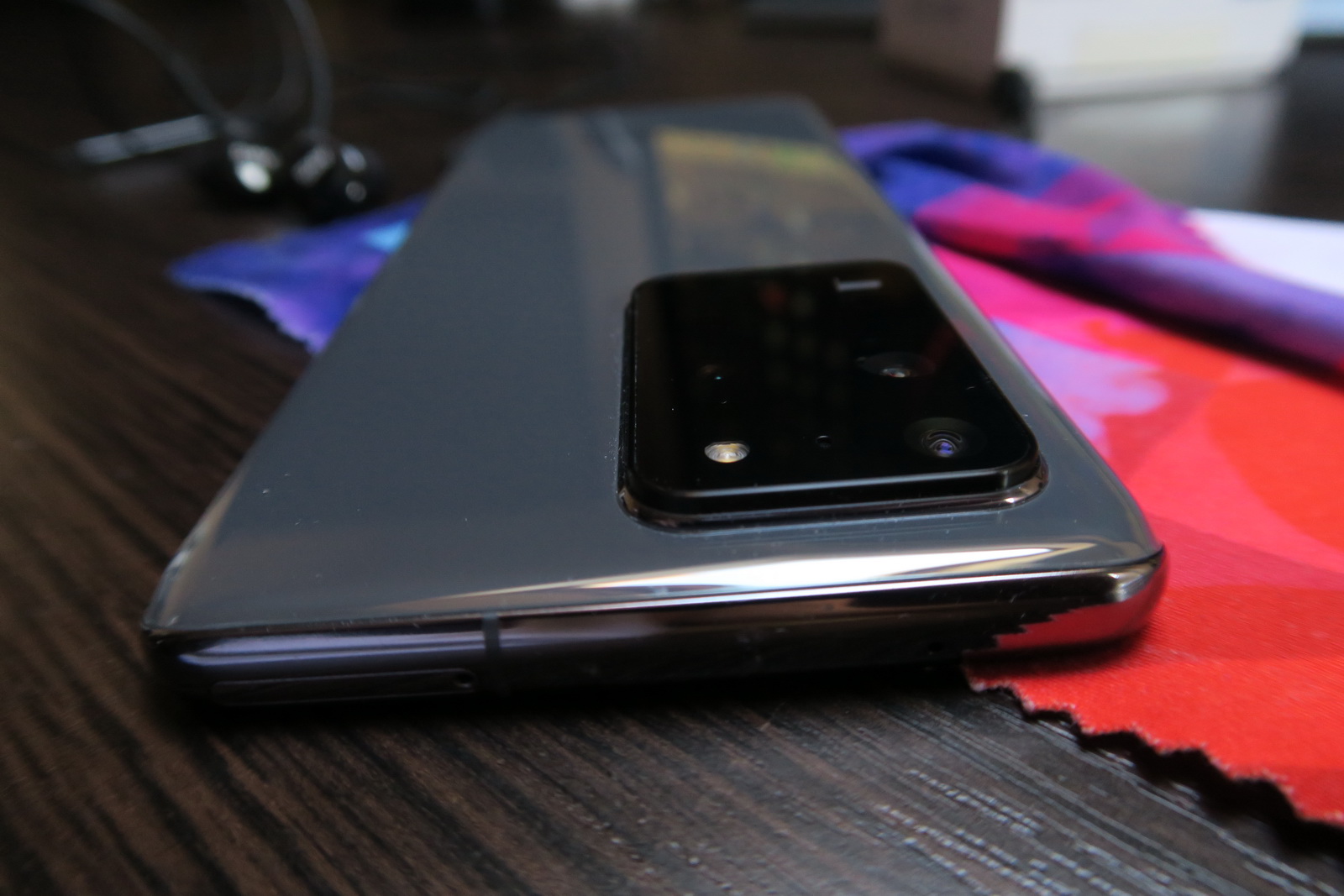 Galaxy S20 Ultra 5G măsoară 8.8 mm în talie şi cântăreşte 222 de grame (mai puțin decât iPhone 11 Pro Max la 226 grame ale sale). Sunt mult mai bine distribuite aceste grame decât la iPhone 11 Pro Max sau ASUS ROG Phone II. Panoul frontal este acoperit cu Gorilla Glass 6, peste un ecran cu muchii foarte subţiri şi uşor de tot, aproape insesizabil curbat. Aproape că aş spune că avem o curbură mai proeminentă în spate, pentru a adânci telefonul mai bine în palmă. Apoi vine rama metalică, iar aici dezbaterea continua între aluminiu şi oţel, dar aş zice că e aluminiu.