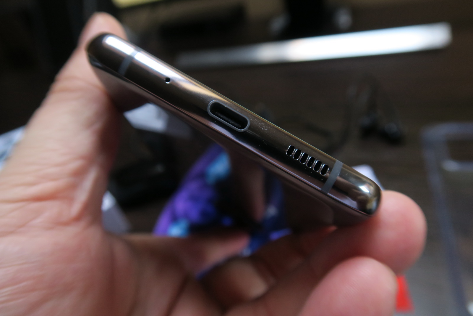 Are şi certificare IP68, pentru rezistenţa la apă şi praf şi are aderență bună. Îl ajută o uşoară angularitate ce apare pe curbura spatelui, care "agață" telefonul de mână. Butoanele fizice sunt mai comode în dreapta, decât acel Power din stânga lui Note 10+. Avem o cameră selfie decupată în ecran, dar ne-am obişnuit deja cu acel orificiu şi nu ne mai deranjează. Deasupra să se afla un speaker atât de mic pentru convorbiri, încât e invizibil, iar al doilea speaker este jos, lângă portul USB-C. Nu avem jack audio.