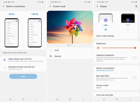 E şi foarte responsiv şi are setări speciale pentru afişaj, precum Vivid sau Natural, în funcţie de ce tip de culoare preferaţi. Avem şi filtru de lumină albastră, Dark Mode, reglaje de font, Easy Mode, plus opţiuni pentru balans de alb mai cald sau rece şi slidere Roşu, Verde şi Albastru. Un ecran complet dotat pentru un flagship de 2020.