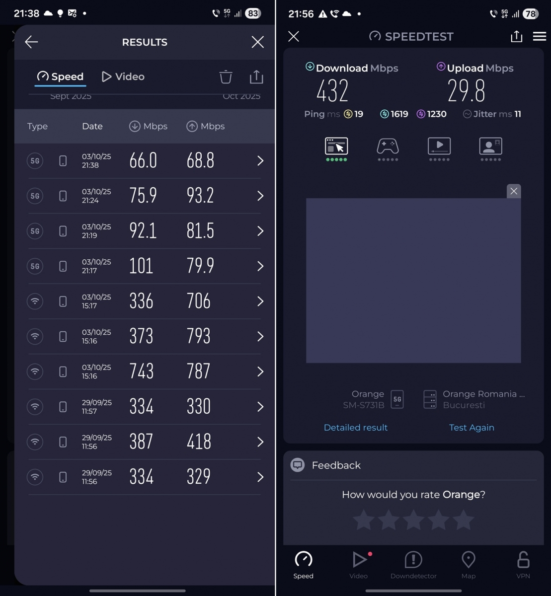 Conectivitatea 5G pare afectată de vijeliile din ultimul timp, astfel că am obținut doar 432 Mbps la download, respectiv 93.8 Mbps la upload, în rețeaua Orange România. Testul a fost realizat în București.