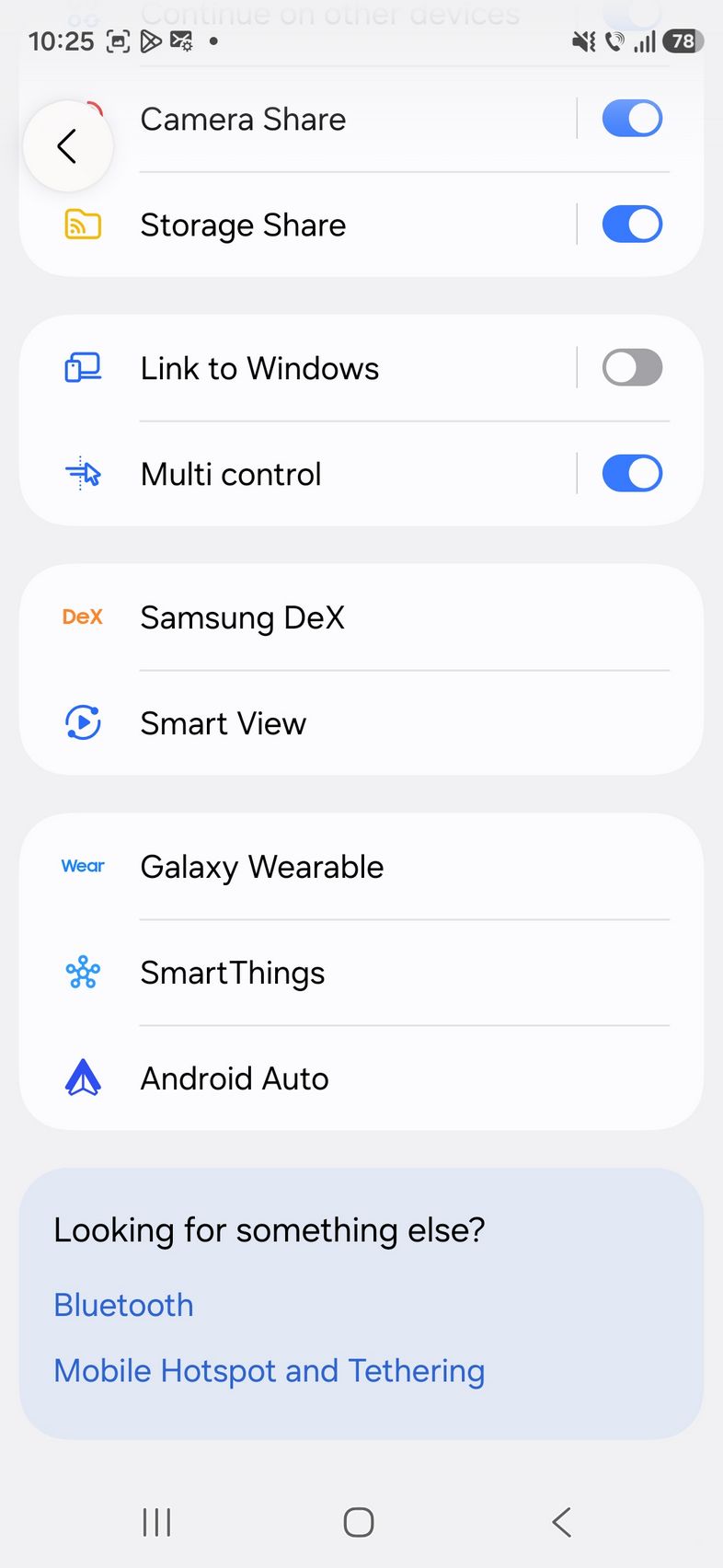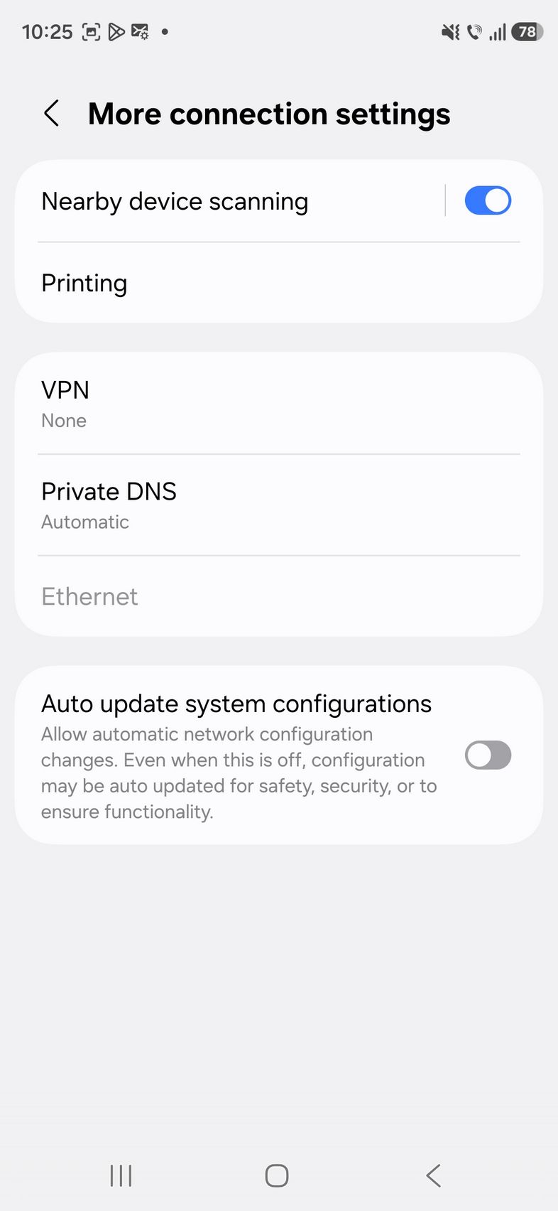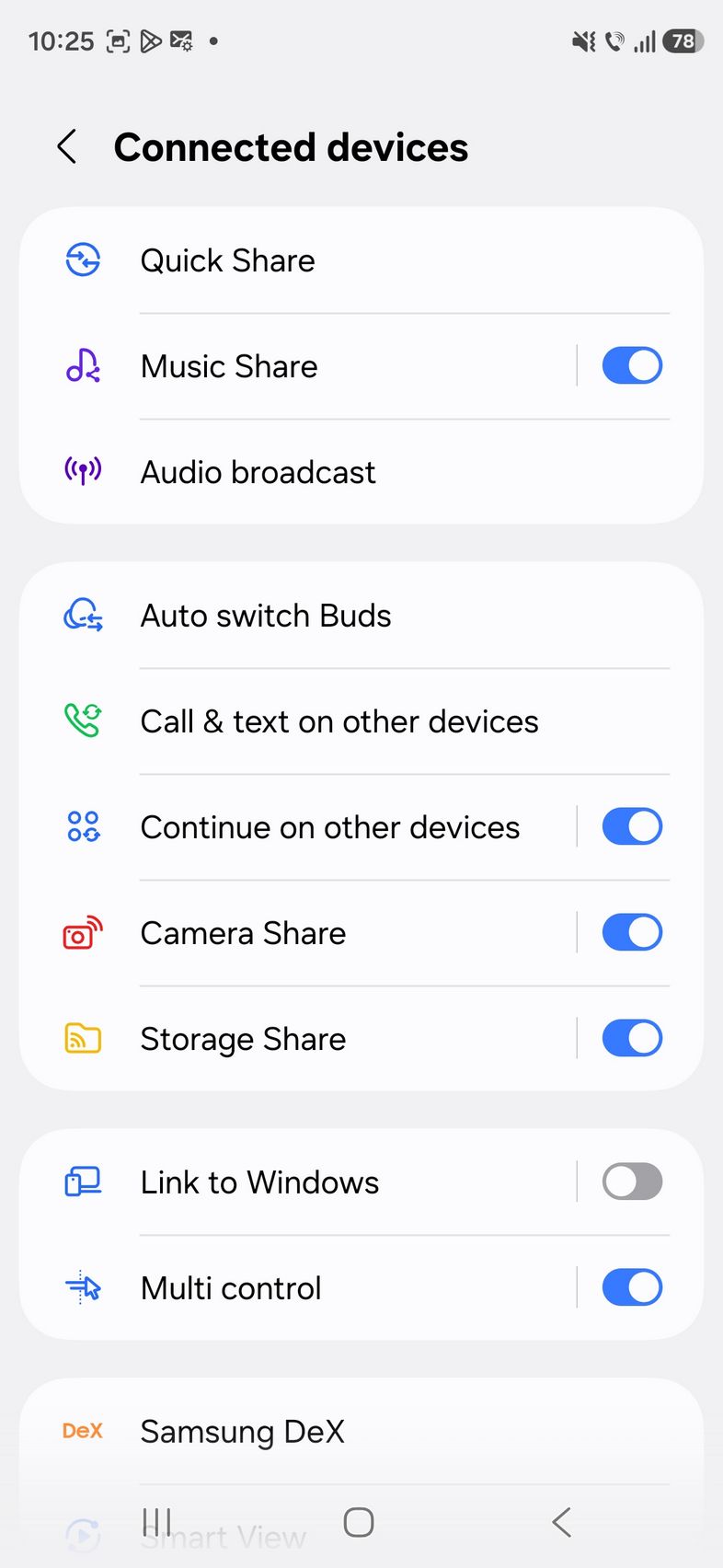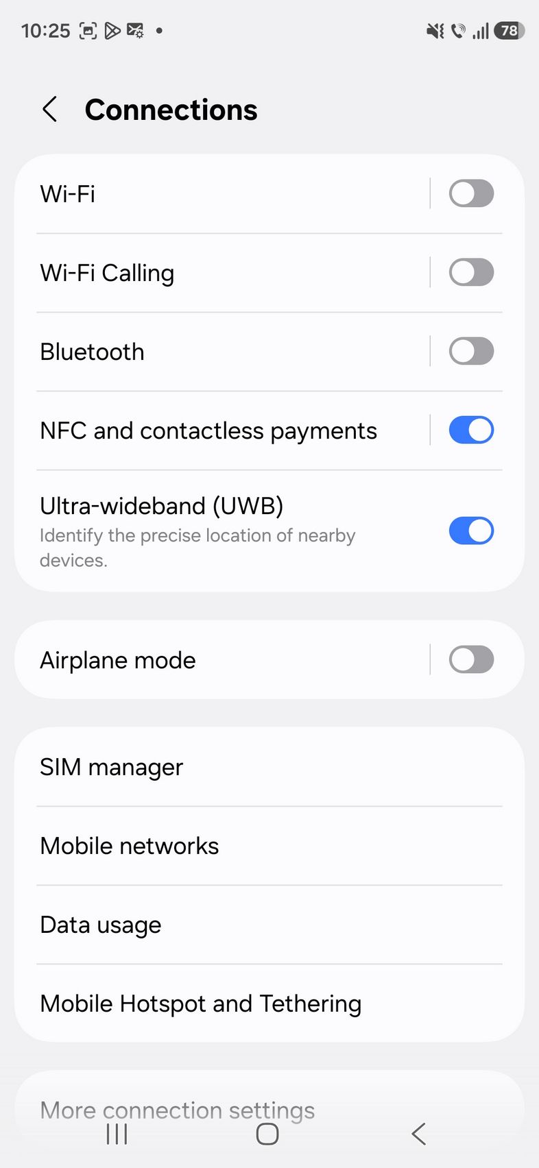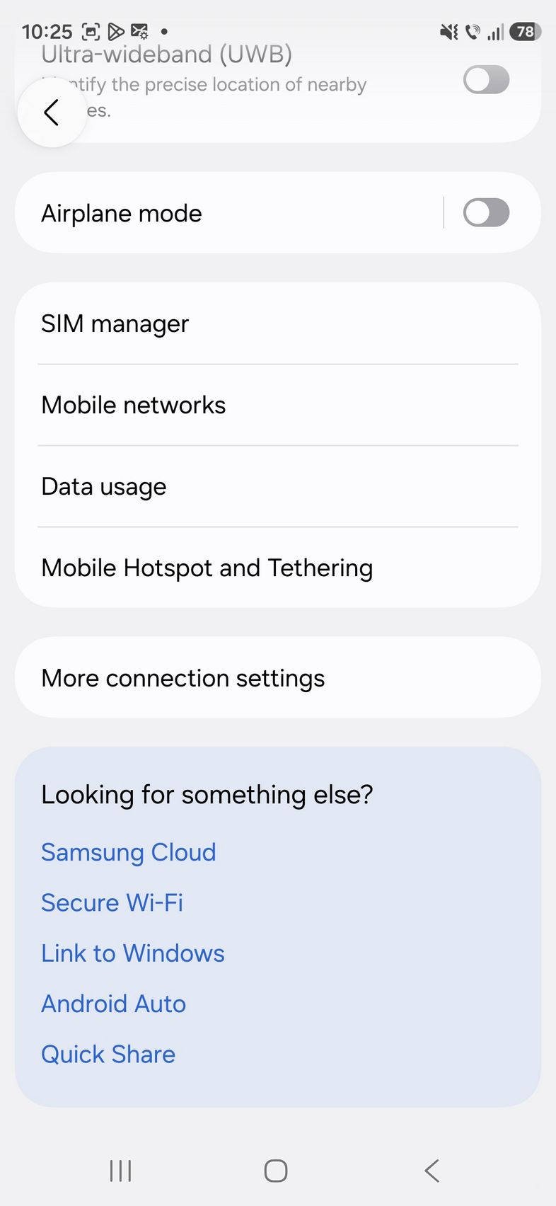Prin setări am mai găsit Quick Share, Music Share, Audio Broadcast, Camera Share, Auto switch Buds, Call & text on other devices, Continue on ther devices, Storage Share, Link to Windows, Multi Control, Smart View. Sunt și opțiunile NFC, UWB, SIM manager, VPN și Private DNS.