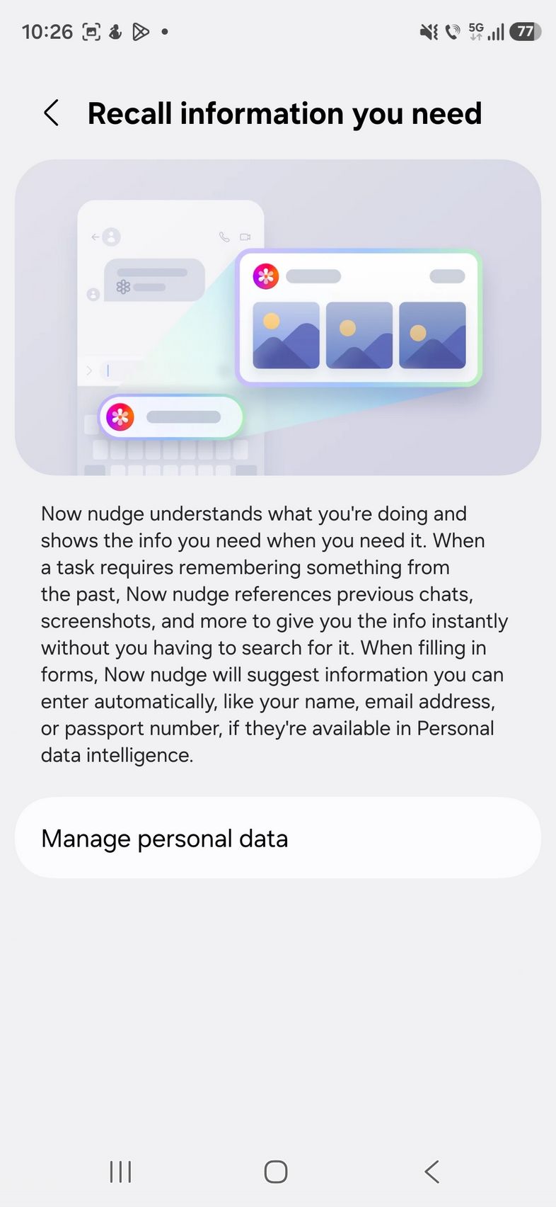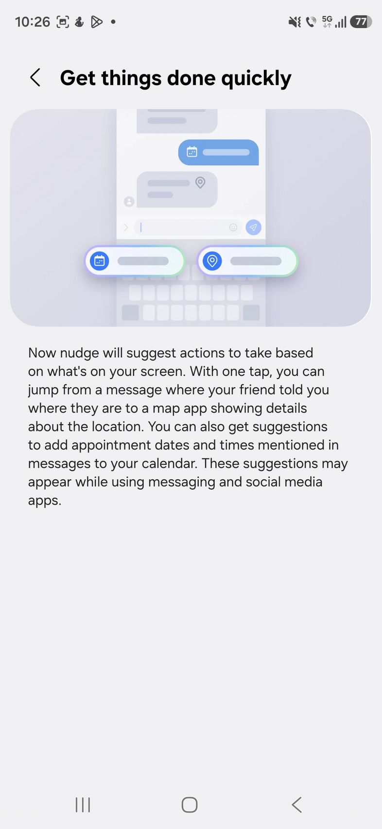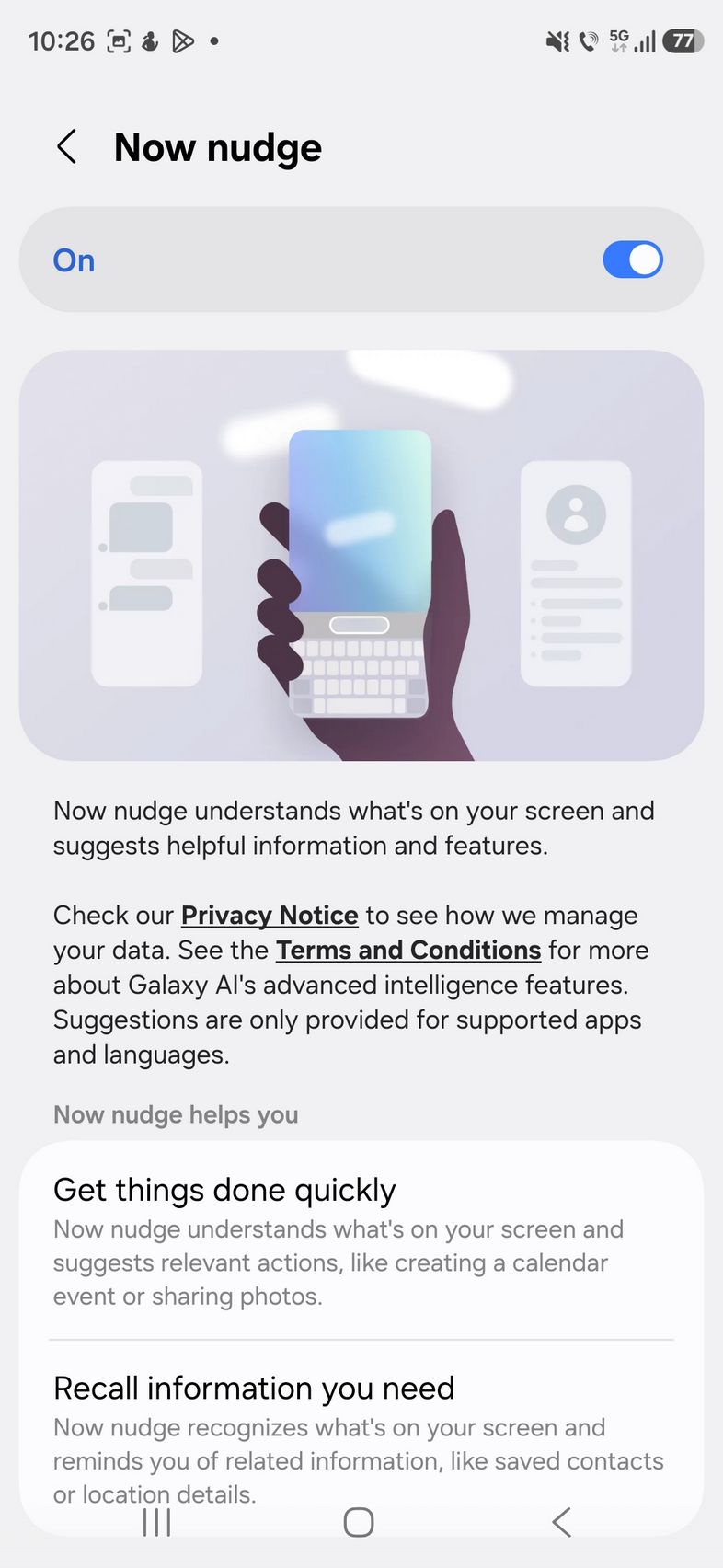 Mai pe scurt Now Nudge înțelege ce faci și îți prezintă informația pe care o vrei atunci când o vrei. Te scapă de căutarea manuală prin telefon. Există suport și în aplicații de mesagerie 3rd party, inclusiv Samsung Messages, Google Messages, Google Chat, Whatsapp, Whatsapp Business și altele. Acest Now Nudge are nevoie de învățare pus pe un telefon nou precum este S26 Ultra unde conținutul abia s-a adunat precum în cazul meu.