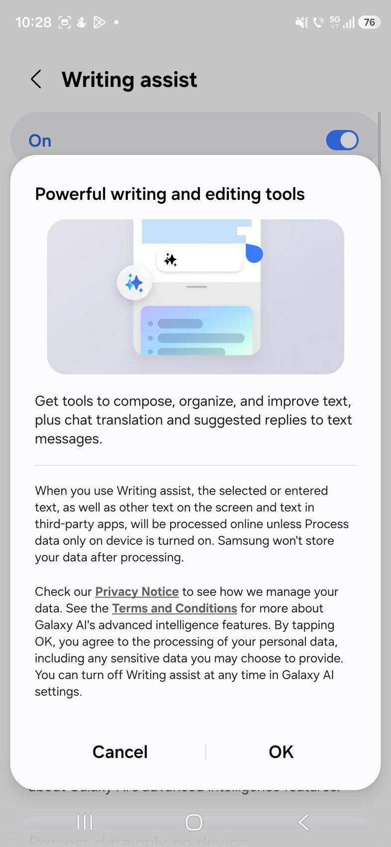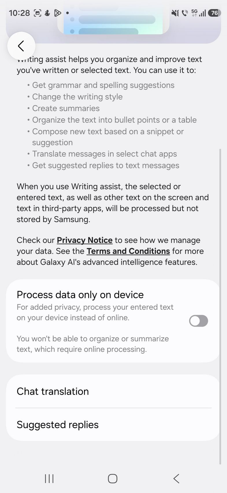 - Writting Assist - ajută la organizarea și îmbunătățirea textului scris sau selectat, inclusiv limba română
