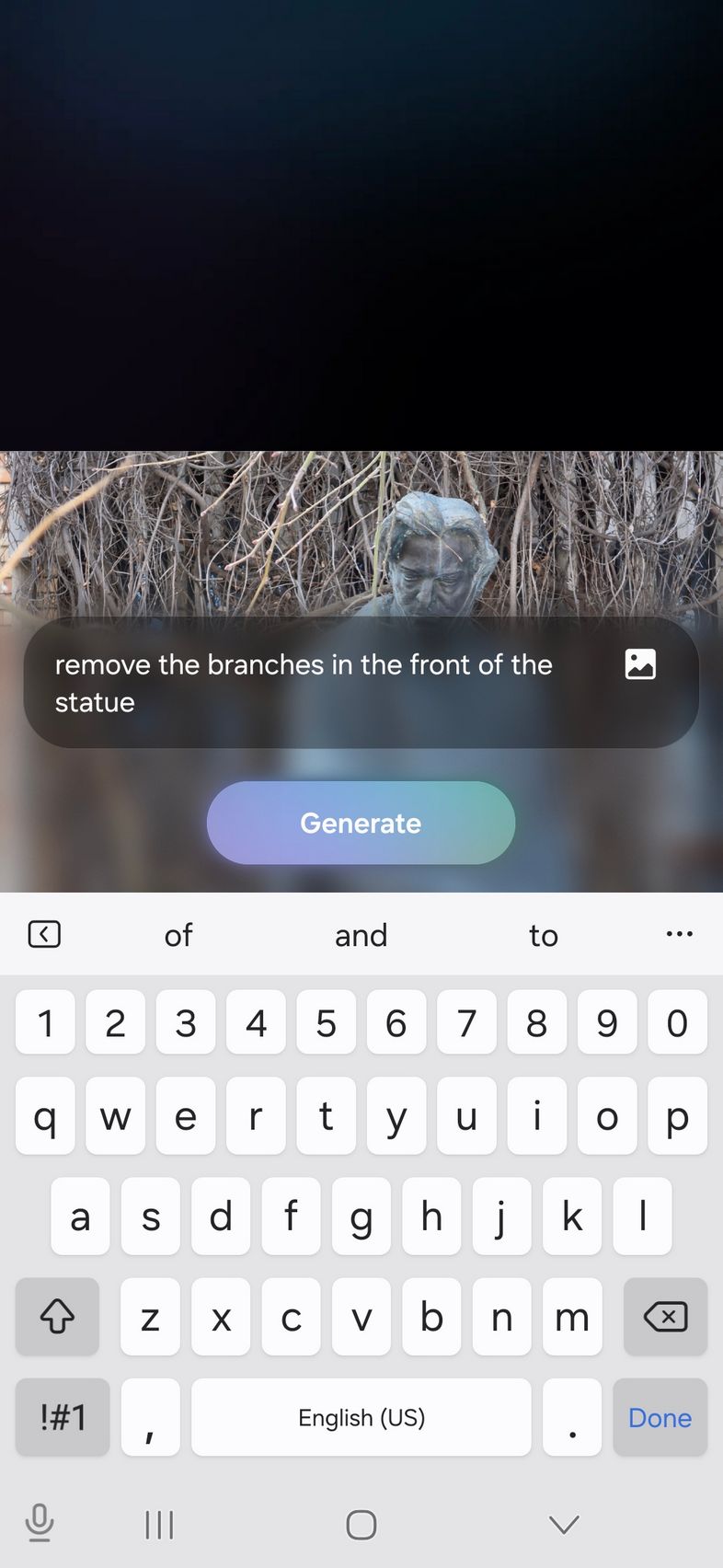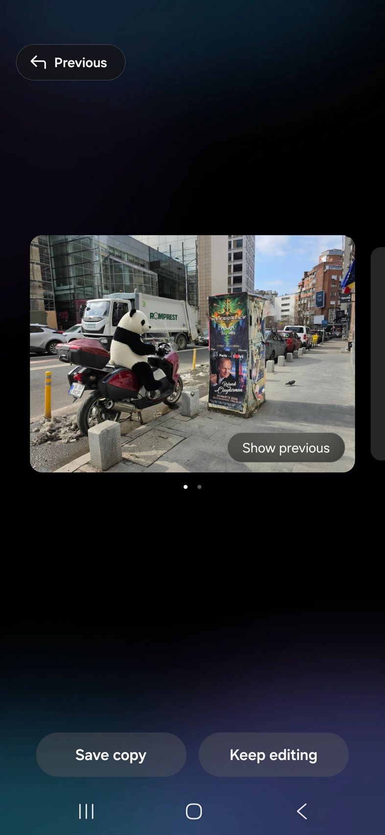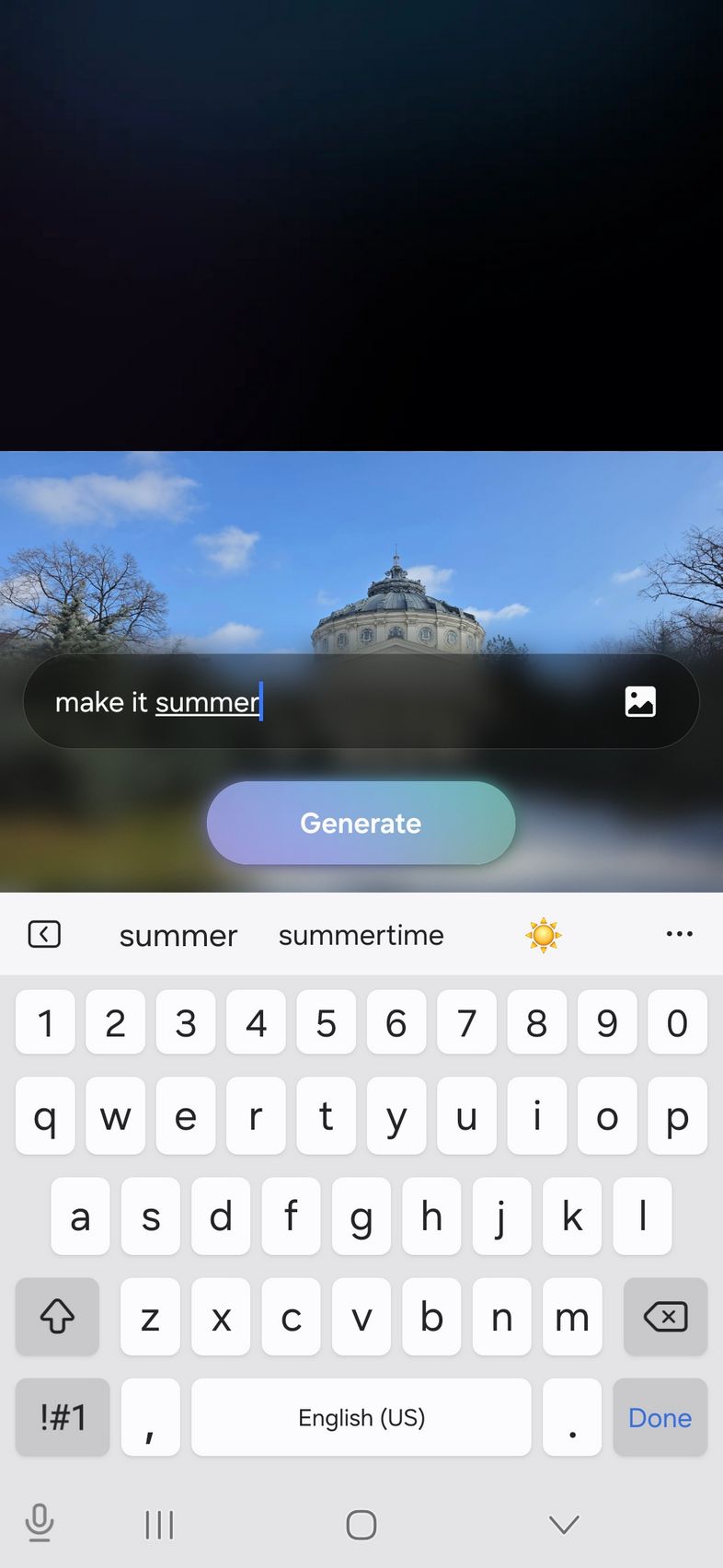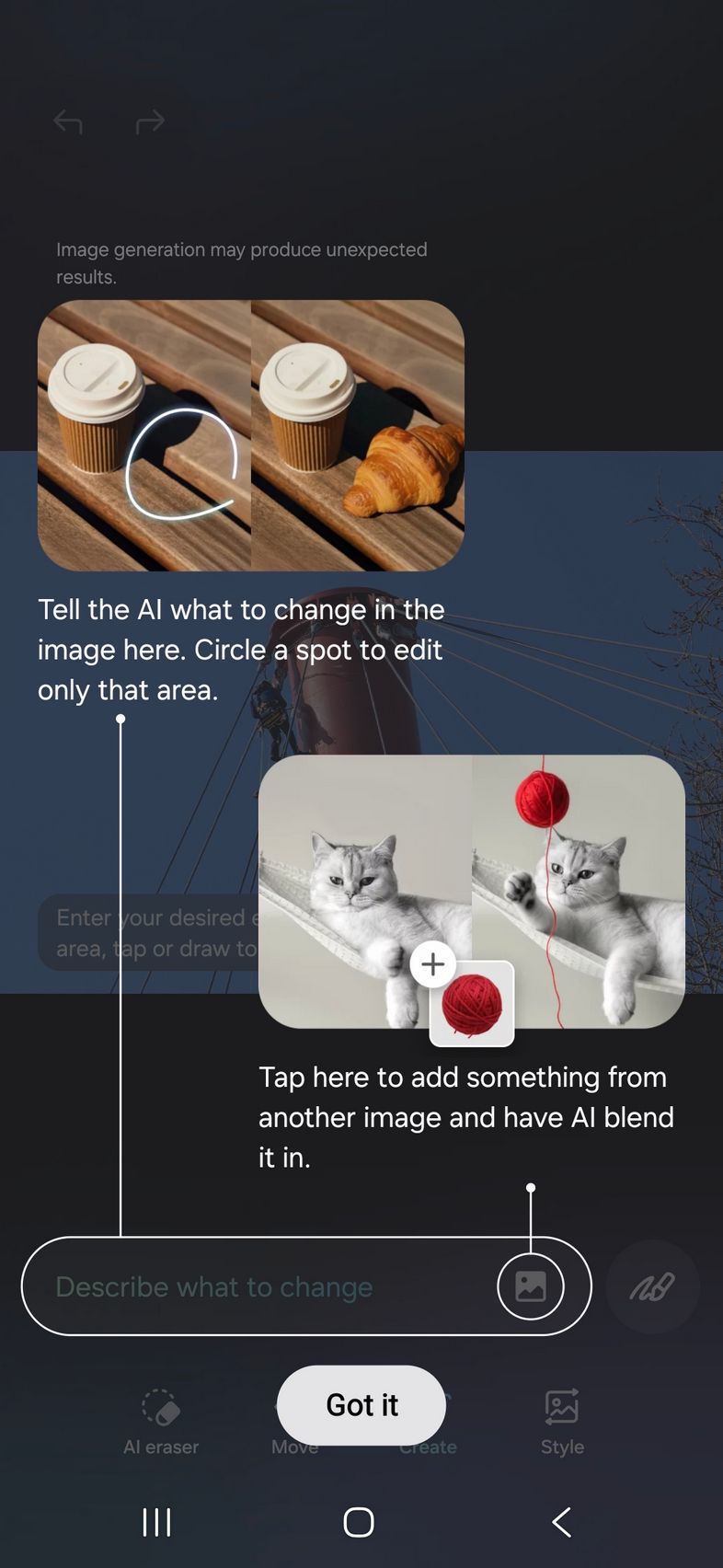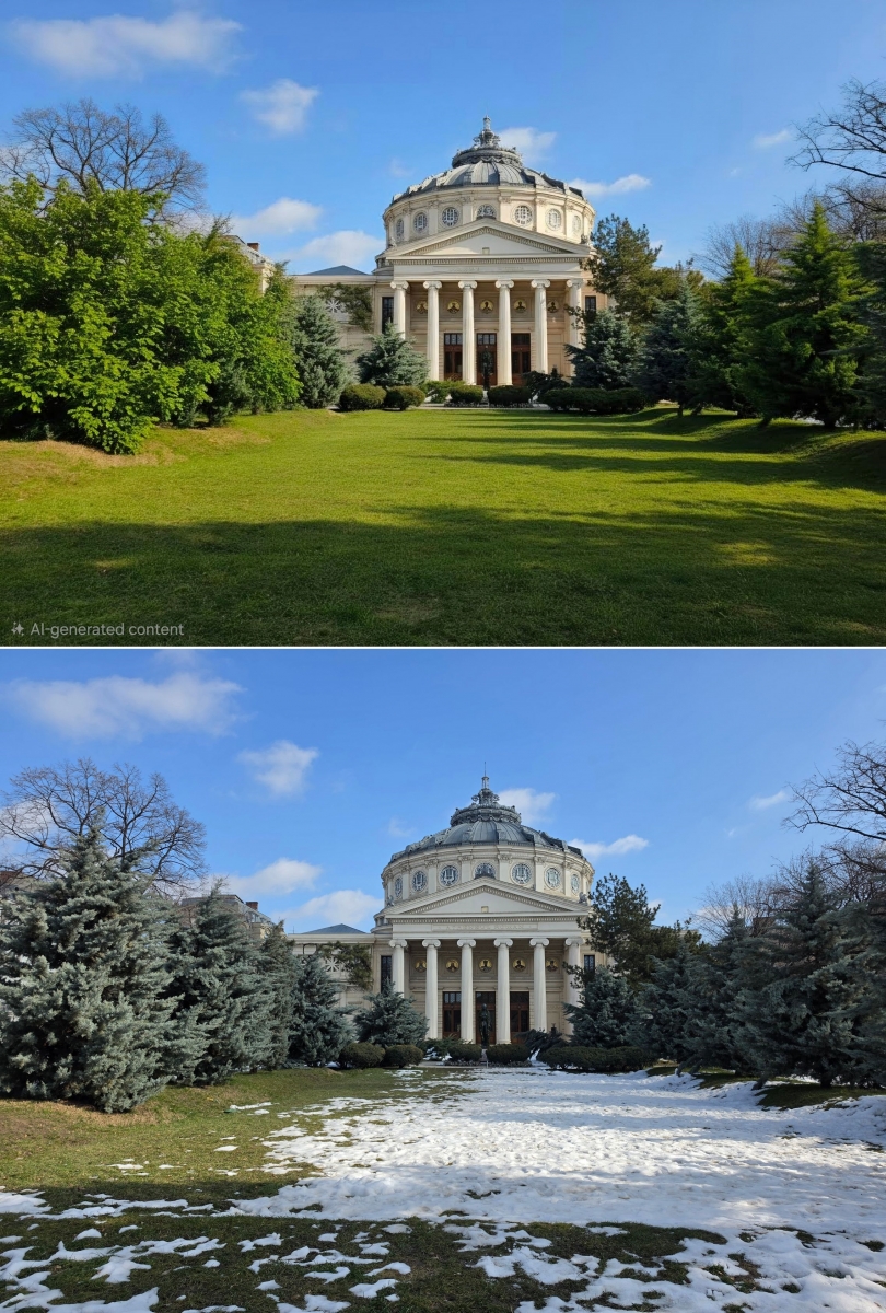 Pe partea de creativitate avem un upgrade adus lui Photo Assist acolo unde îmi amintesc că anterior desenam pe fotografii ce elemente voiam să fie adăugate, sau selectam eu zona/persoana care să fie ștearsă. Acum poți doar să scrii ce vrei să se schimbe, cum am făcut eu.