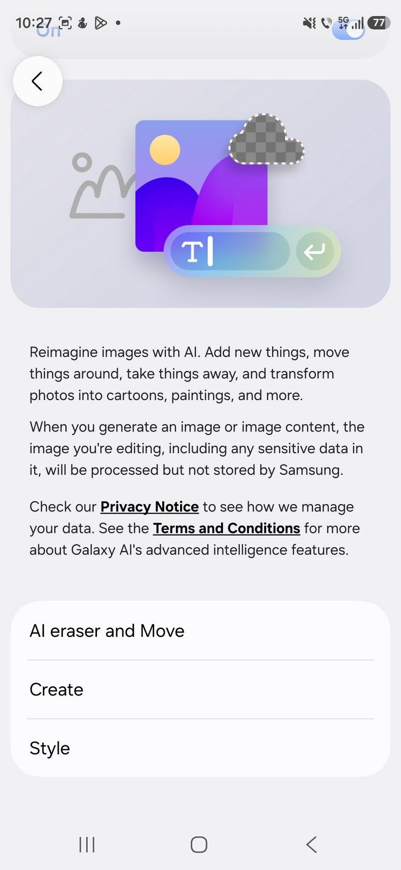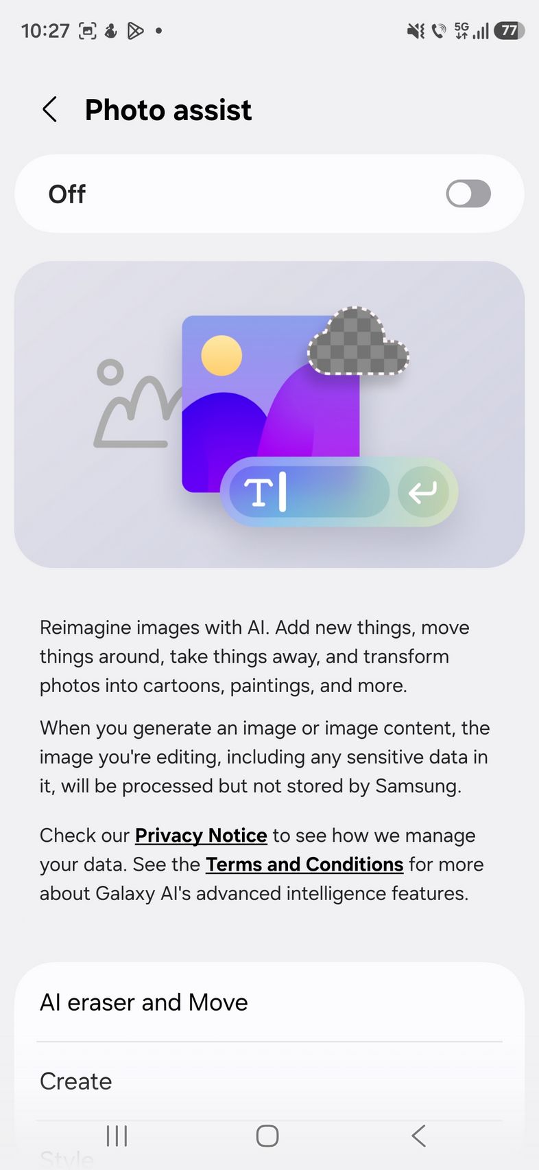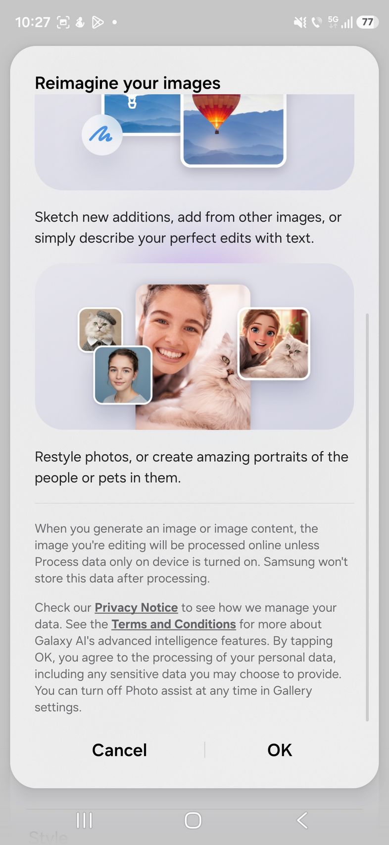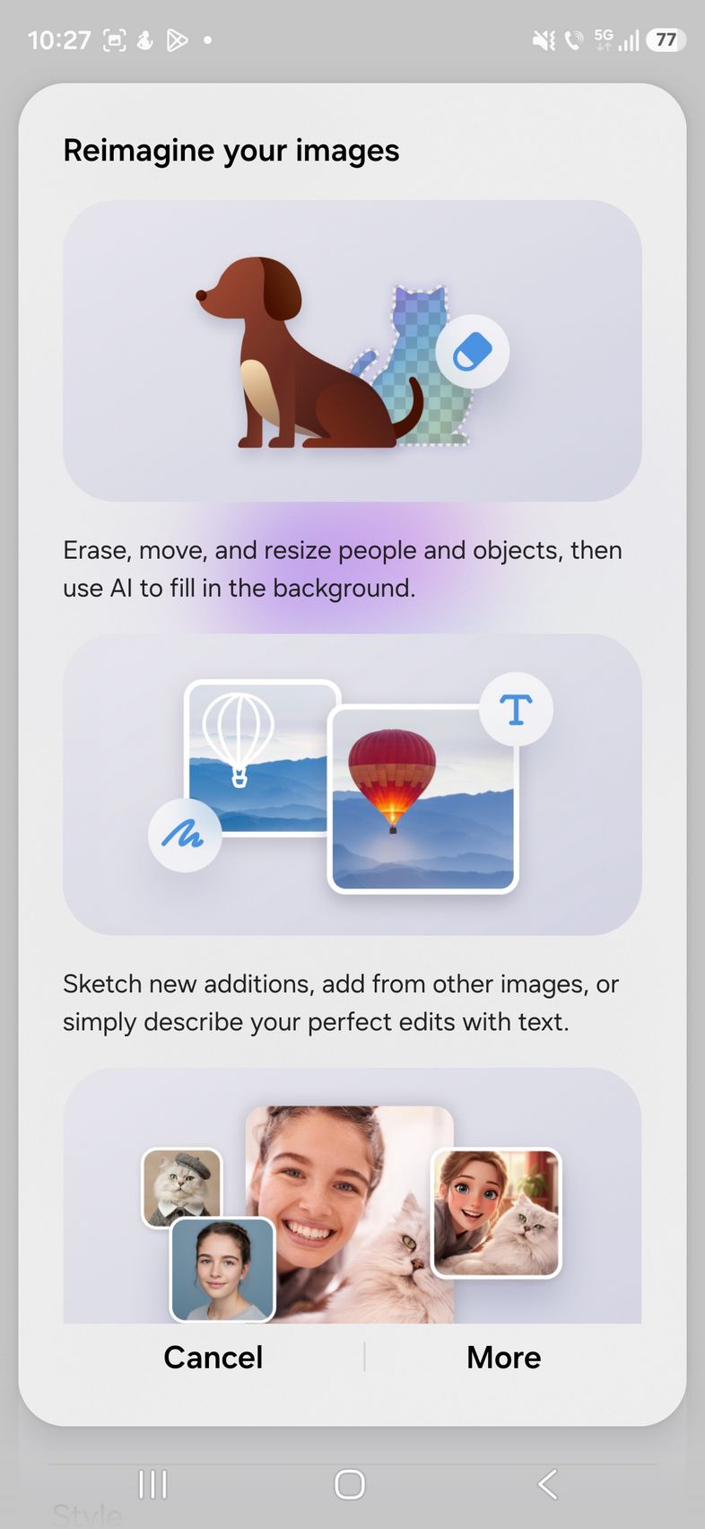 Pe partea de creativitate avem un upgrade adus lui Photo Assist acolo unde îmi amintesc că anterior desenam pe fotografii ce elemente voiam să fie adăugate, sau selectam eu zona/persoana care să fie ștearsă. Acum poți doar să scrii ce vrei să se schimbe, cum am făcut eu.