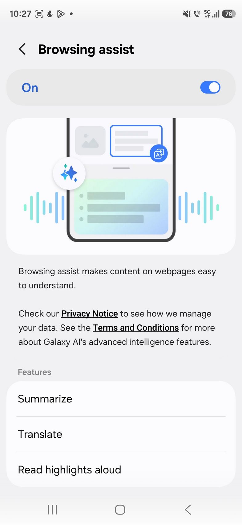 - Browsing Assist - rezumat, traducere, citire cu voce tare, inclusiv limba română