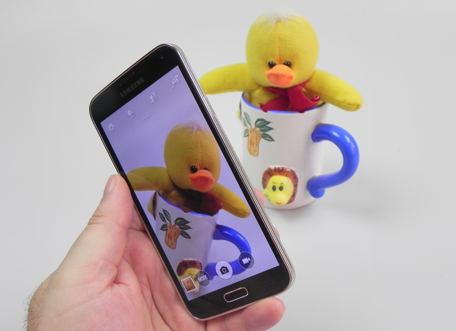Camera vine cu deschidere F/2.2 ca și Galaxy S4, iar acum lungimea focală este de 4.8 mm în loc de 4.24 mm cât avea predecesorul. Smartphone-ul flagship Samsung pe 2014 poate focaliza în doar 0.3 secunde, performanță similară cu a lui HTC One M8. Interfața camerei lui S5 este diferită față de cea a lui S4, totul fiind acum mai centralizat. Sus în stânga avem opțiunea pentru camera frontală, în vreme ce tot în stânga în mijloc putem plasa 3 opțiuni/setări personalizabile.