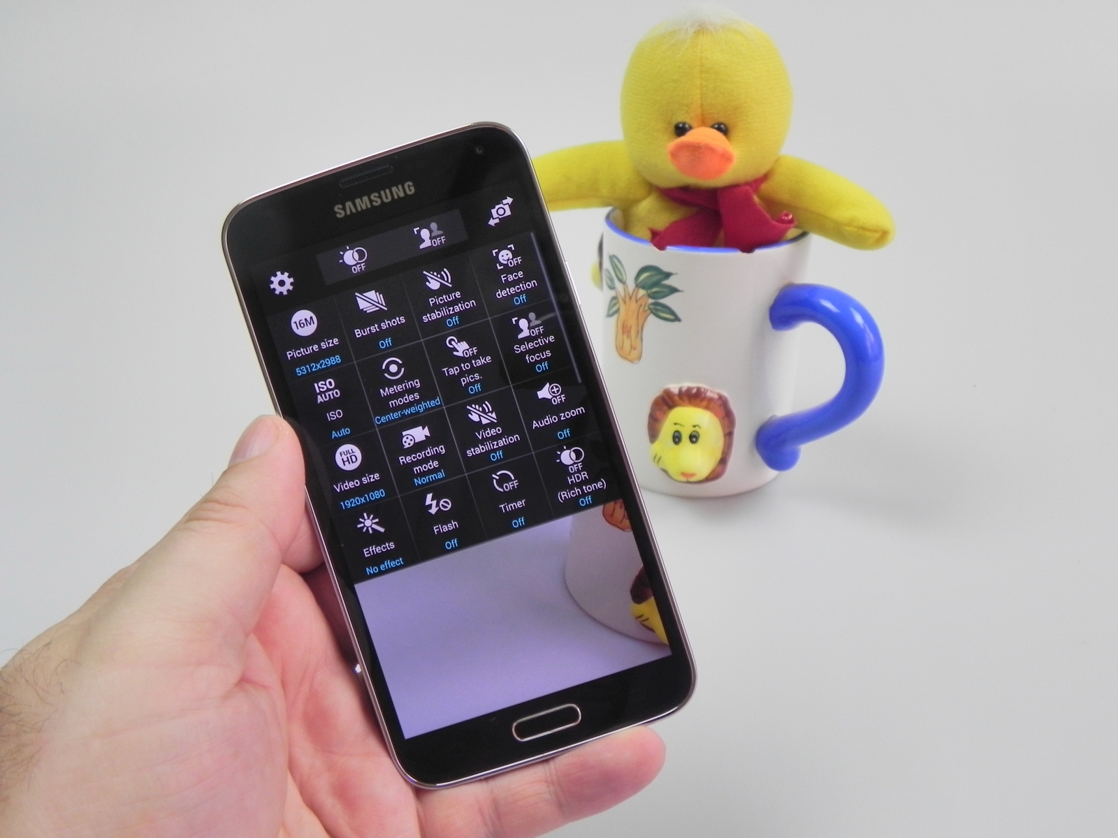 în zona Settings din camera lui S5 găsim foarte multe opțiuni, de la mărimea fotografiei (5312 x 2988 maxim în 16:9) la captură în rafală, stabilizare a imaginii, detectare facială, ISO (până la 800) și metering (center/matrix/spot). Avem și opțiunea Tap to Take Picture, iar opțiunile pentru captura video nu lipsesc nici ele. Putem filma până la rezoluție 4K, dar există și full HD și HD că opțiuni. Tot la captura video avem filmare normală, filmare slow motion, fast motion și smooth, adică la 60 FPS.
