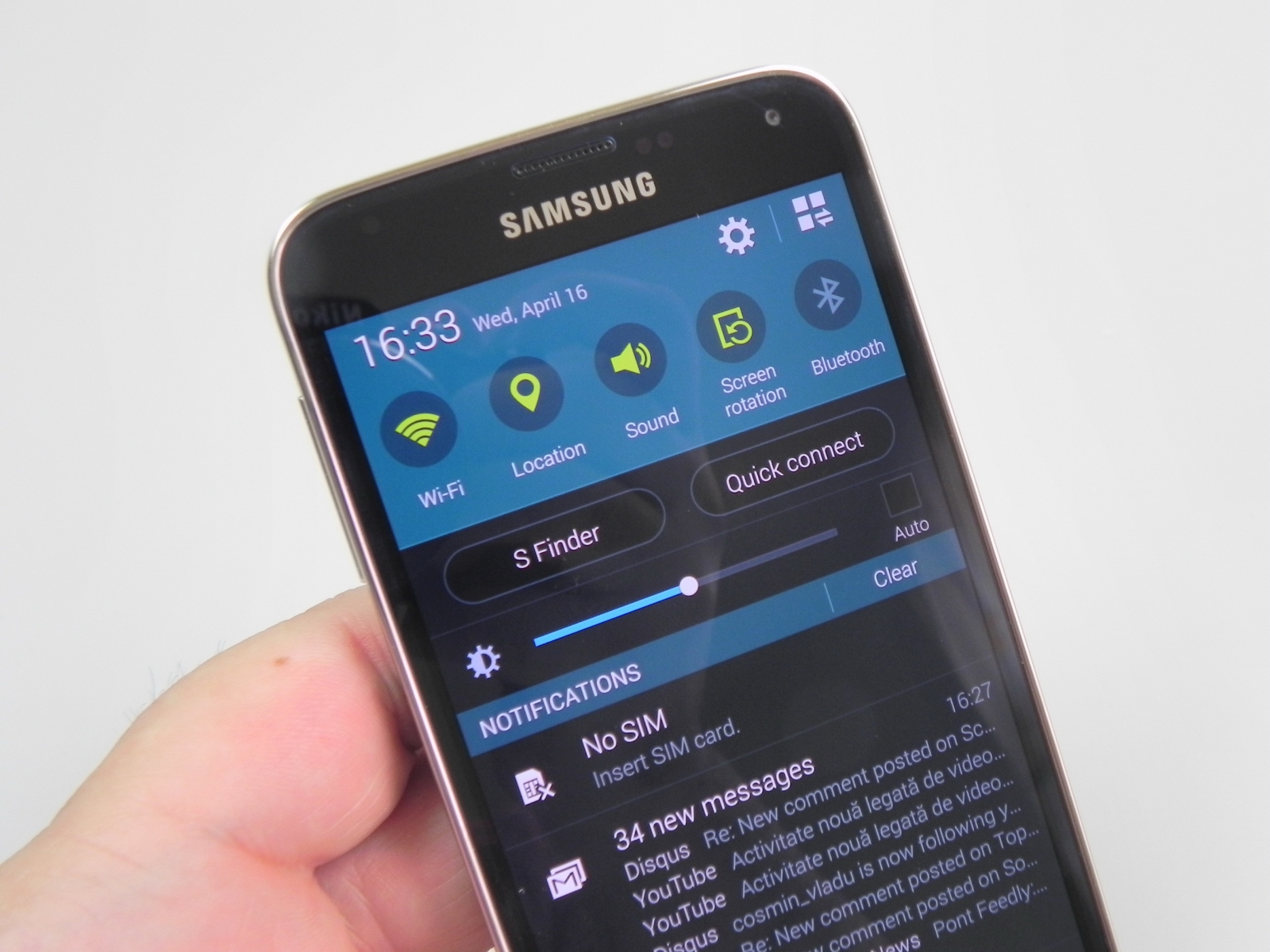 Samsung Apps e magazinul de aplicații Samsung, în continuare fără conținuturi prea tentante, iar apoi vine rândul lui Smart Remote, aplicație de tip telecomanda cu care controlați televizorul, blu ray playerul și alte terminale compatibile. Revenim puțin în zona de notificări, unde găsiți S Finder, o funcție de căutare universală pe Galaxy S5, care suporta taguri și caută printre muzică, video-uri și conținuturi de tot soiul. Tot acolo avem Quick Connect care activează WiFi și Bluetooth în căutarea unei conexiuni cu un terminal aflat în zonă.