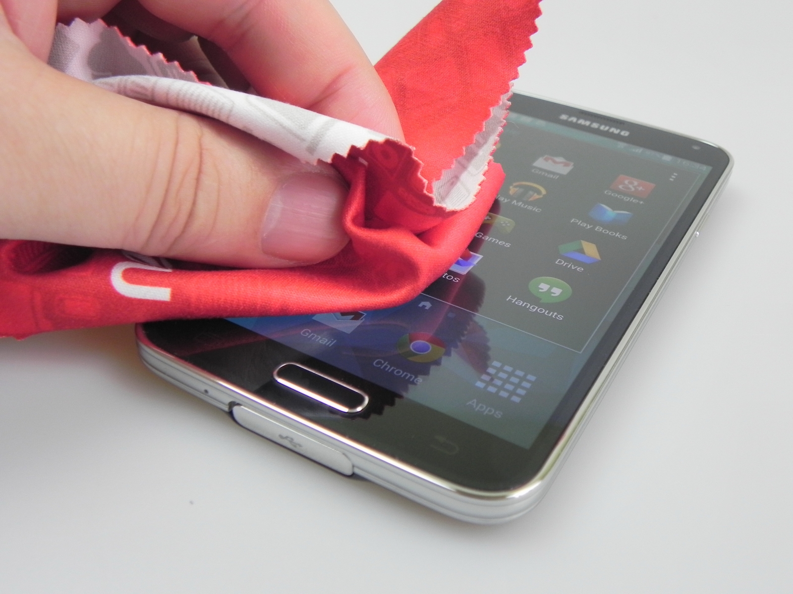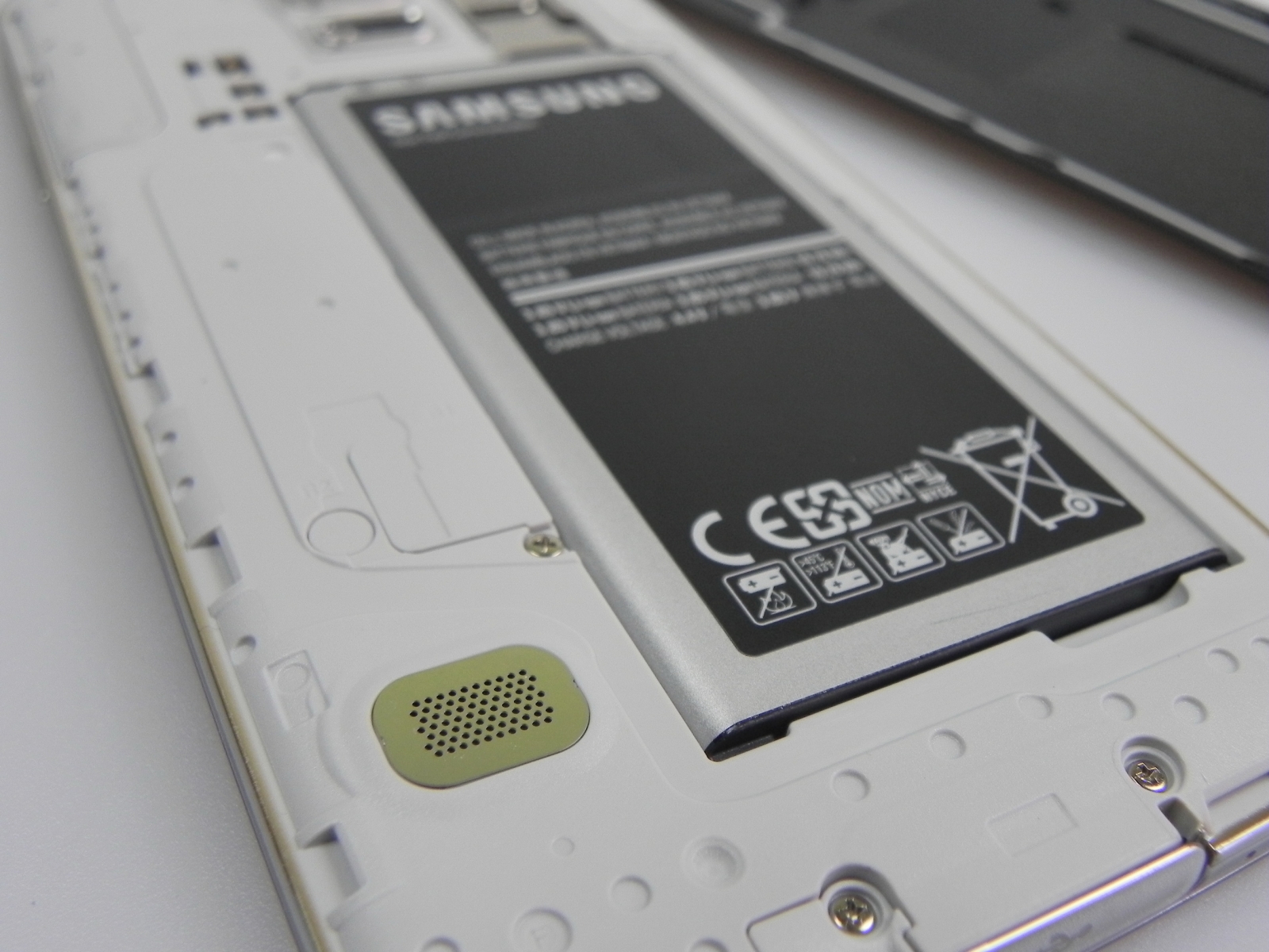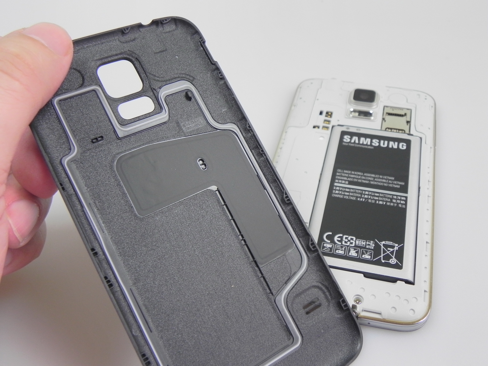 Butonul Home al lui S5 este destul de rigid, dar formatul telefonului este unul plăcut și atractiv, el stând bine în mână. Dacă înlăturăm capacul bateriei (se face mai ușor decât pe S4), găsim cele două slot-uri, microSIM și microSD suprapuse deasupra bateriei telefonului. E nevoie să scoatem bateria pentru a introduce un microSIM, dar nu și pentru microSD.