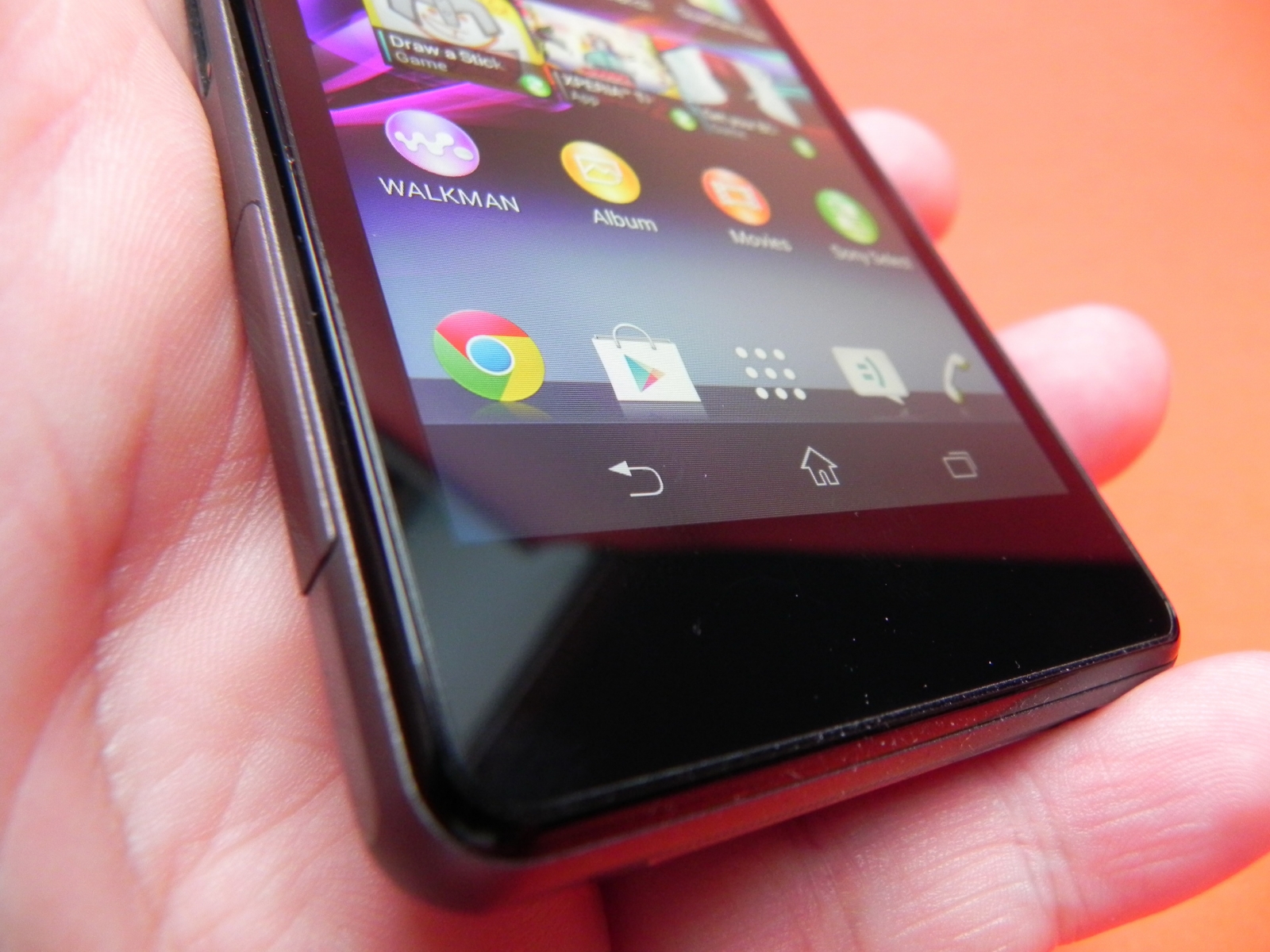 La Xperia Z1 slotul microSIM era separat de microSD și microUSB. Observăm și o pereche de pini metalici pentru dock, aflați tot lateral, iar în partea inferioară avem difuzorul, în vreme ce în zona superioară se afla un jack audio. în spate avem camera și blitzul, iar în colț se află orificiul pentru lanyward. Pe partea opusă sloturilor găsim butoanele de volum, butonul camerei și butonul On/Off. Butonul camerei e foarte mic și greu de apăsat în prima fază, ca și butoanele de volum de altfel.