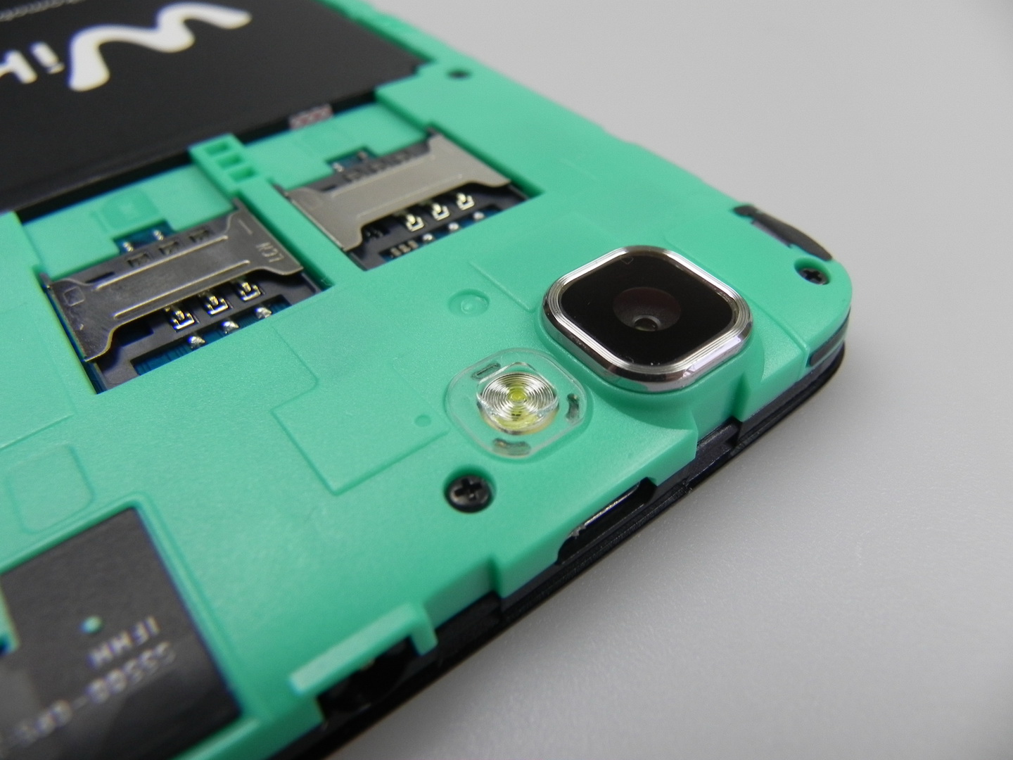 Marginile ecranului sunt mari, iar acest model e greu de folosit cu o singură mână. în zona frontală avem un earpiece, cu LED de notificări plasat la interiorul grilei sale, apoi camera frontală, senzorii și butoanele capacitive. în spate găsim camera principală, blitzul și difuzorul, iar dacă înlăturăm capacul bateriei vom descoperi că acesta se scoate cam ca la un model Lumia mai vechi, fiind de tip "wraparound".