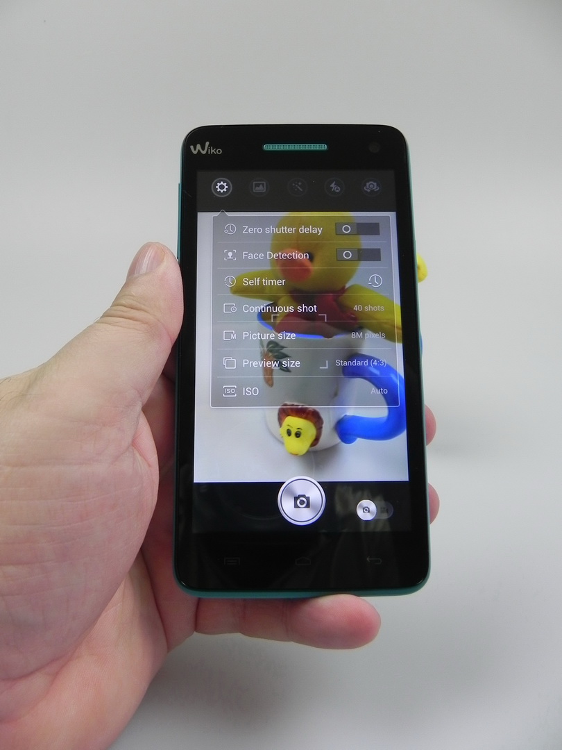 Ca idee, suntem peste cei 366 LUX ai lui Xperia Z2, cei 343 LUX ai lui LG G3 și cei 350 LUX ai lui LG G2, deci ecranul se descurcă bine. Trecând la cameră, Wiko Rainbow oferă un senzor de 8 megapixeli, cu blitz LED, BSI și zoom digital 4X. Camera frontală este una de 2 MP. Interfața camerei principale da senzația de vechi și de simplitate, iar în stânga găsim un shortcut către camera frontală, blitzul și opțiunea Cinemagraph și Eraser.