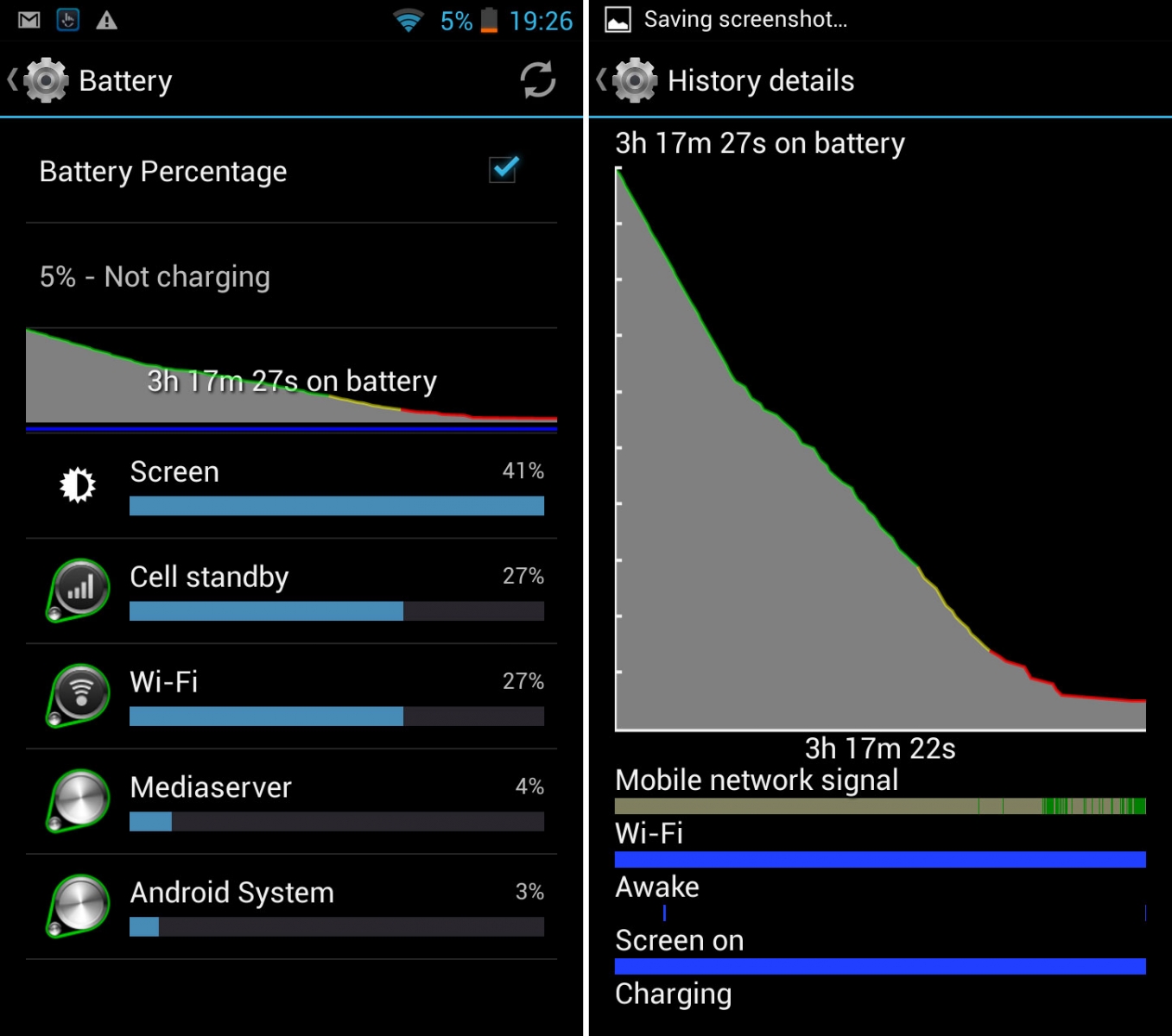 Wiko Rainbow câștiga 3-4 din 10 dueluri, dar e foarte aproape de rivalii săi. El rulează Riptide GP2, joc benchmark 3D fără probleme și nu suferă de lag în interfața. în ce privește sistemul de operare și interfața, avem la dispoziție aici Android 4.2.2, cu un UI în mare stock, după cum se vede și în zona widget-urilor. Multitasking-ul e accesat prin ținerea apăsat a butonului Home și apoi swipe-uri pentru a închide aplicațiile. Butonul Menu odată apăsat oferă acces la opțiuni că Launcher Manager, iar zona Dropdown include notificările și obișnuitele Quick Settings.