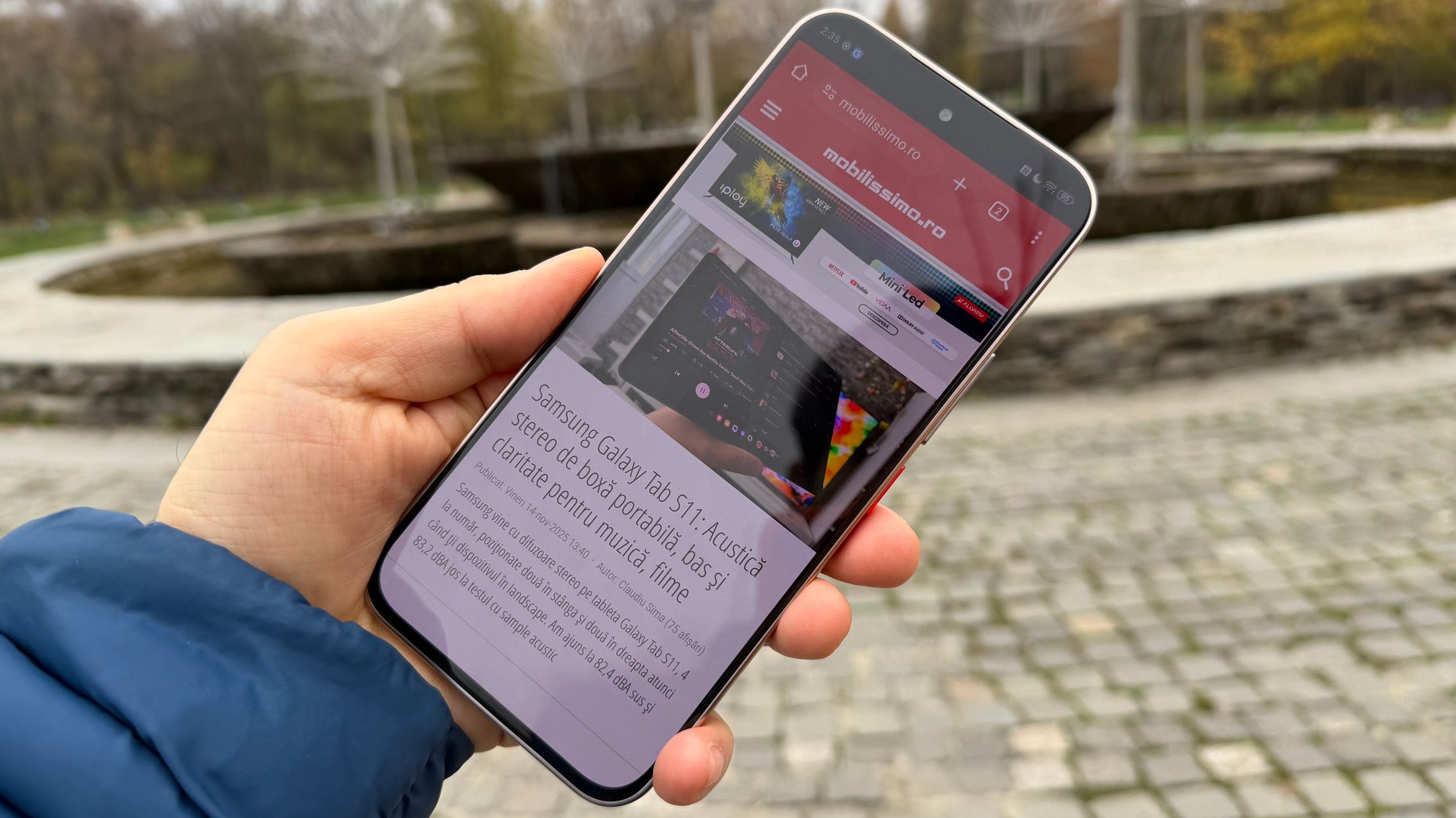 Aspect 20:9 şi protecţie Gorilla Glass 7i. E gata şi de gaming, având refresh rate de 120 Hz. Îl găsesc mulţumitor la consumat YouTube, TikTok, filme, browsing, culorile sunt vii, unghiurile largi. Negru adânc, paleta destul de largă de culori. În bătaia soarelui a fost suficient de vizibil. De altfel am avut o surpriză plăcută la testul cu luxmetrul: 1174 LUX am măsurat!