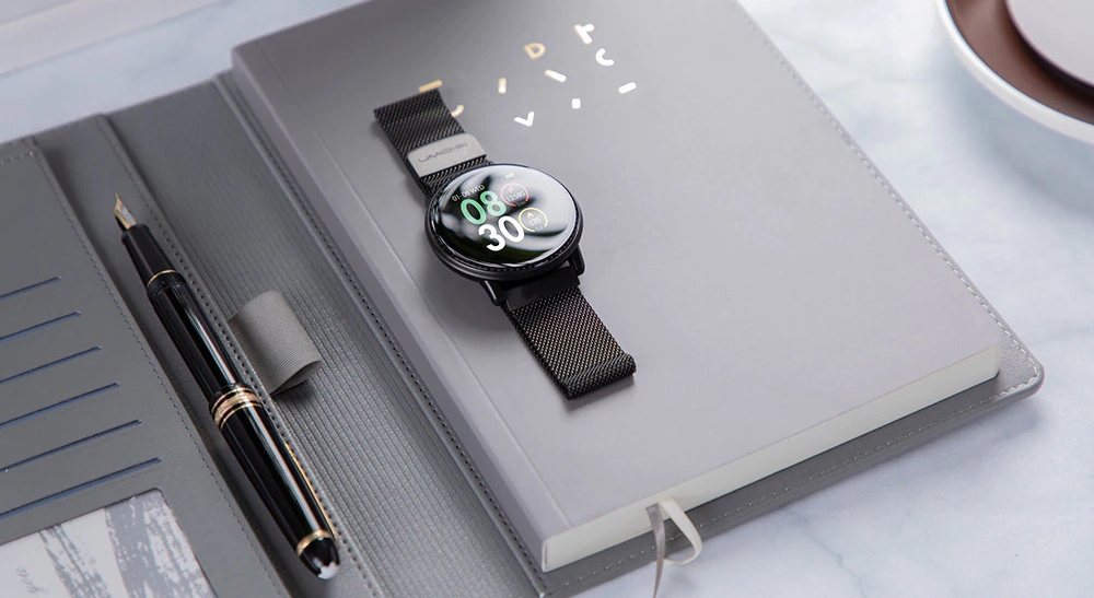 Ei bine, ceasul de față arată foarte bine pe partea de design optând pentru un cadran circular și un ecran tactil cu diagonală de 1.33 inch și rezoluție de 240 x 240 pixeli. Vine la pachet cu o baterie de 180 mAh și procesorul pentru care optează este un NORDIC 52832. Avem un cadran din aliaj metalic și în interiorul pachetului o curea sport din silicon și o alta metalică mai elegantă.