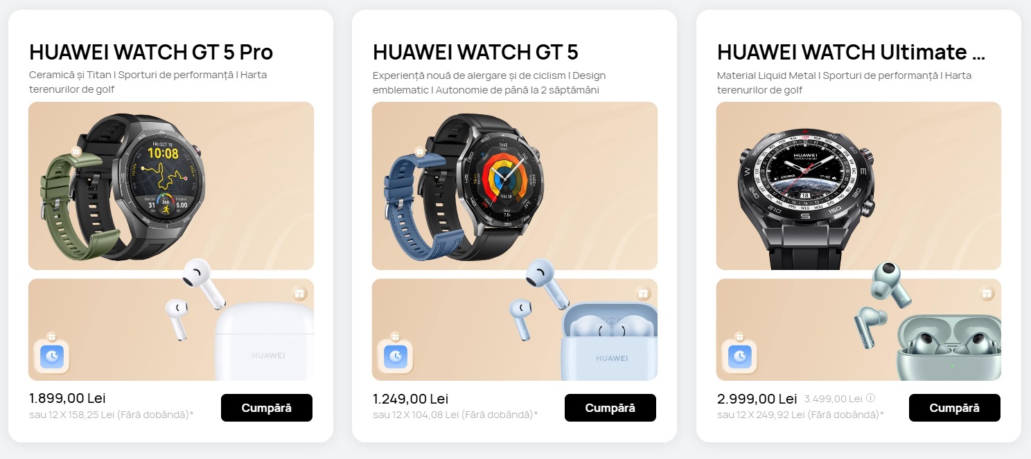 Dacă optezi pentru un Watch Fit 3 primești o curea Strap Pink cadou, iar cei care vor un smartwatch premium, au HUAWEI Watch Ultimate care vine cu o pereche de căști FreeBuds Pro 3 cadou. În același timp, HUAWEI FreeBuds Pro 4, noile căști wireless cu sunet de înaltă fidelitate, beneficiază de 12 luni HUAWEI Loss Care cadou și un cupon de reducere de 150 lei, prețul acestora fiind redus de la 999 lei la 849 lei.