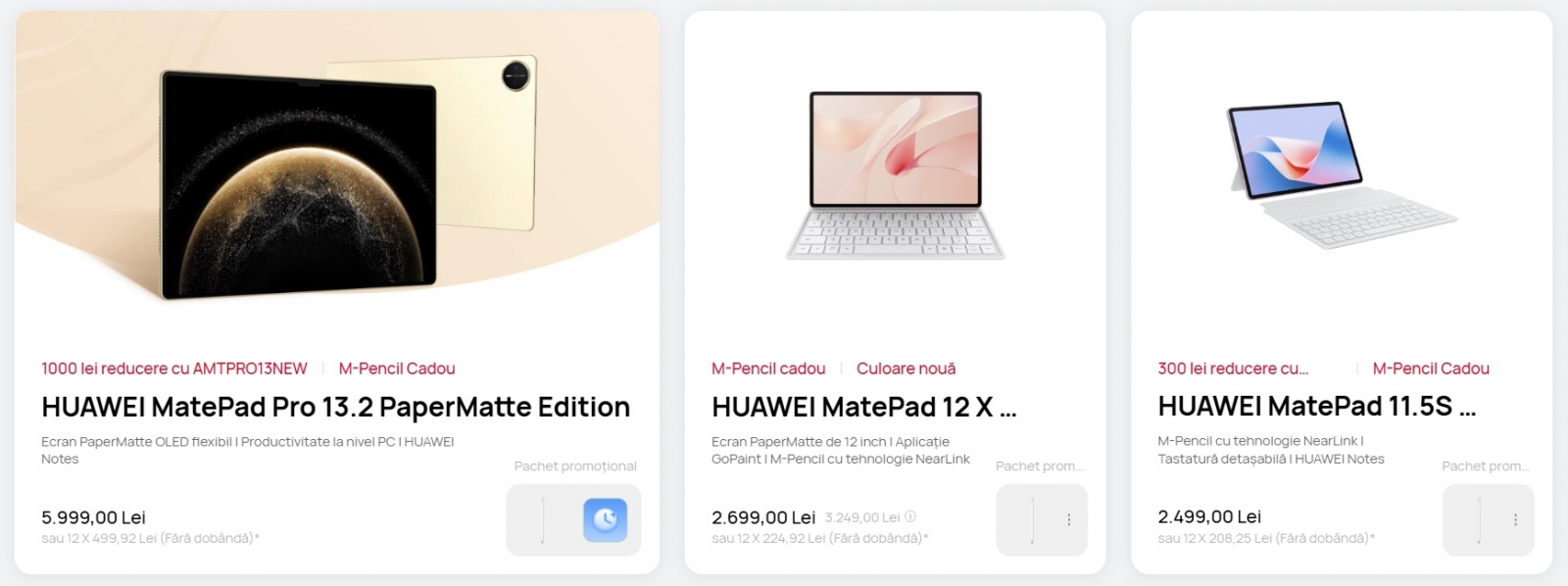 Dacă vrei o tabletă ai la dispoziție modele versatile precum MatePad 12 X sau MatePad 11.5S. Ambele vin cu M-Pencil cadou și un cupon de reducere de 300 lei. HUAWEI MatePad 11.5 PaperMatte este, de asemenea, însoțit de un M-Pencil cadou.