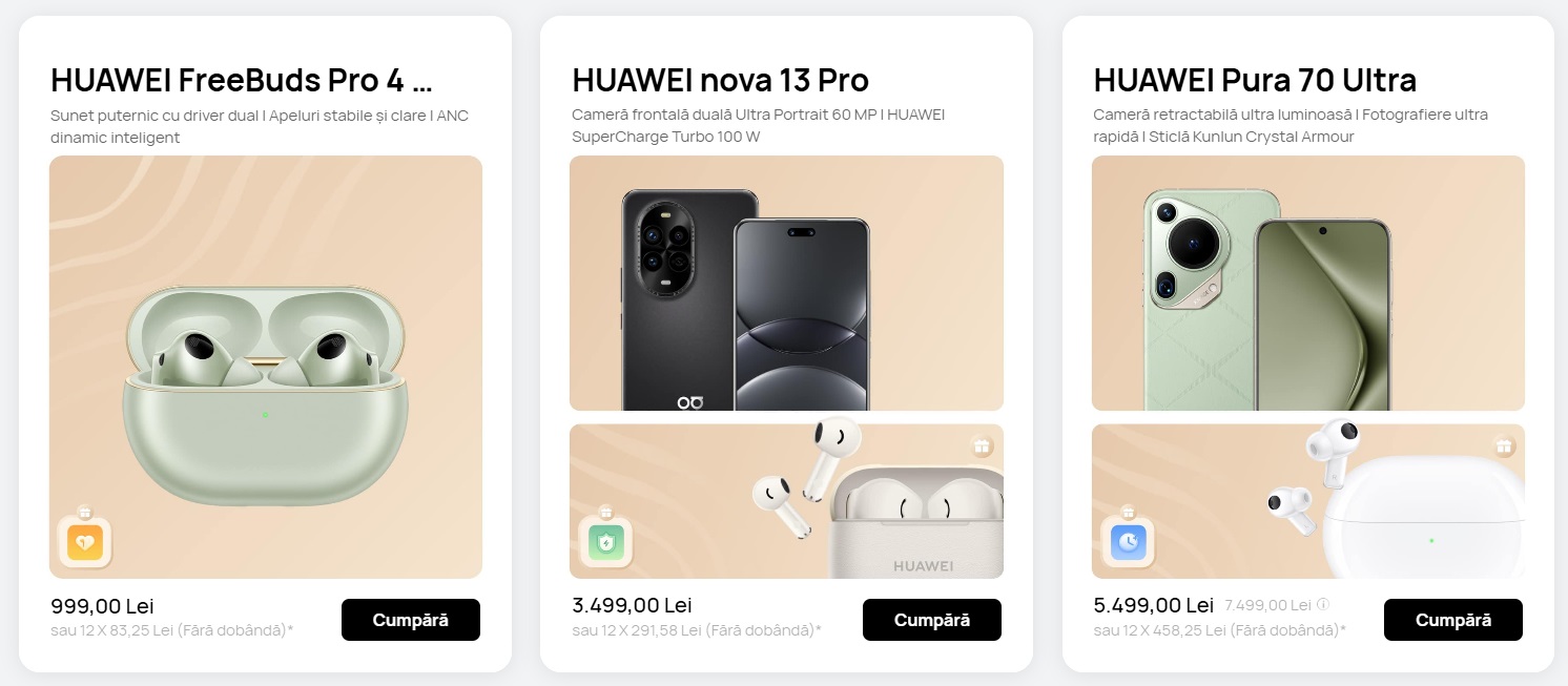 În funcție de valoarea comenzii ai o extra reducere și îți poți achiziționa astfel produse precum HUAWEI Pura 70, smartwatch-uri Watch GT 5, sau poate un Watch Fit 3. Pe listă sunt și ceasurile Watch Ultimate, plus căștile noi FreeBuds Pro 4 și tabletele MatePad 11.5S, MatePad 12 X, MatePad 11.5 PaperMatte și noua tabletă MatePad Pro 13.2, model din urmă proaspăt testat de noi la Mobilissimo.