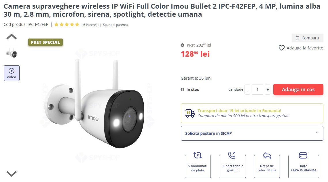 Pentru utilizatorii obișnuiți, care vor o cameră IP simplă, cu funcții smart, există opțiuni accesibile, dar bine dotate. De exemplu, Imou Bullet 2 IPC-F42FEP, o cameră de 4 MP cu lumină albă, microfon, sirenă și detecție umană, e redusă la 129,99 lei (de la 202,33 lei). Un alt exemplu bun este Reolink Argus 3 Pro, cu panou solar inclus. Oferă filmare color noaptea și detecție PIR, iar camera scade la doar 438.99 lei în această perioadă (de la 699.98 lei).
