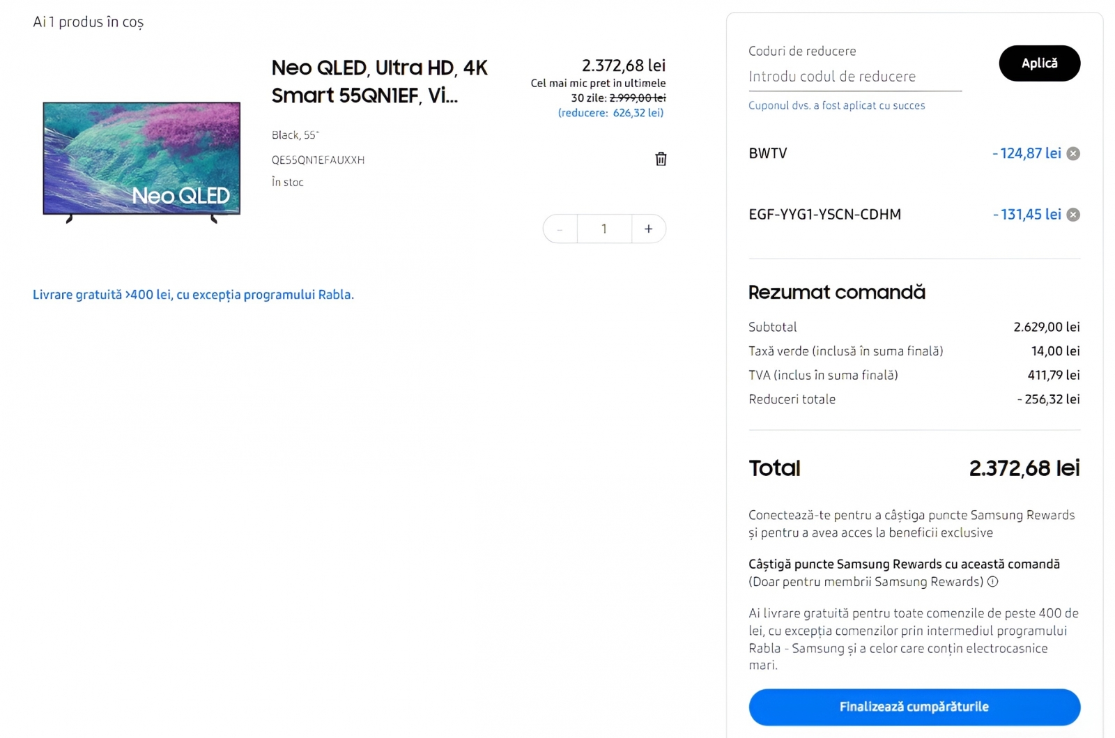 Ca produs vedetă în campanie am dat de Samsung Neo QLED 55QN1EF, în variantă de 139 de centimetri în diagonală, cu funcții Vision AI la pachet. E redus la 2.629 lei în această perioadă, dar poți obține 10% extra-discount dacă adaugi în coș codul promo „BWTV” + un cod obținut în urma terminării unui mini-game de pe site. Prețul final ajunge astfel la doar 2.372 lei.