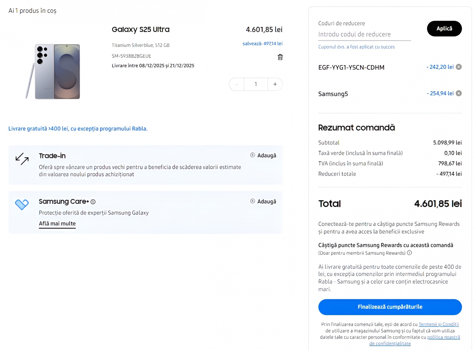 E încă în stoc și Galaxy S25 Ultra pe la 5.098 lei în variantă Titanium Silverblue, cu 12 GB RAM și 512 GB de stocare. Dacă combini codurile „Samsung5” + voucher-ul obținut în urma terminării unui mini-game, ajunge pe la 4.601 lei. Poți obține un preț mai bun dacă ai smartphone de dat la schimb prin programul Buyback. Îl găsești aici!